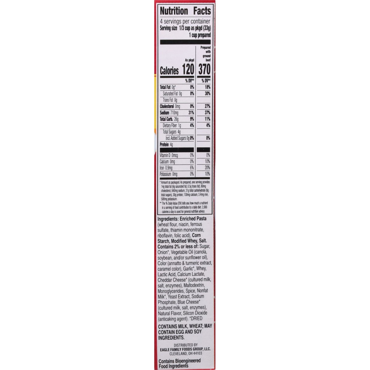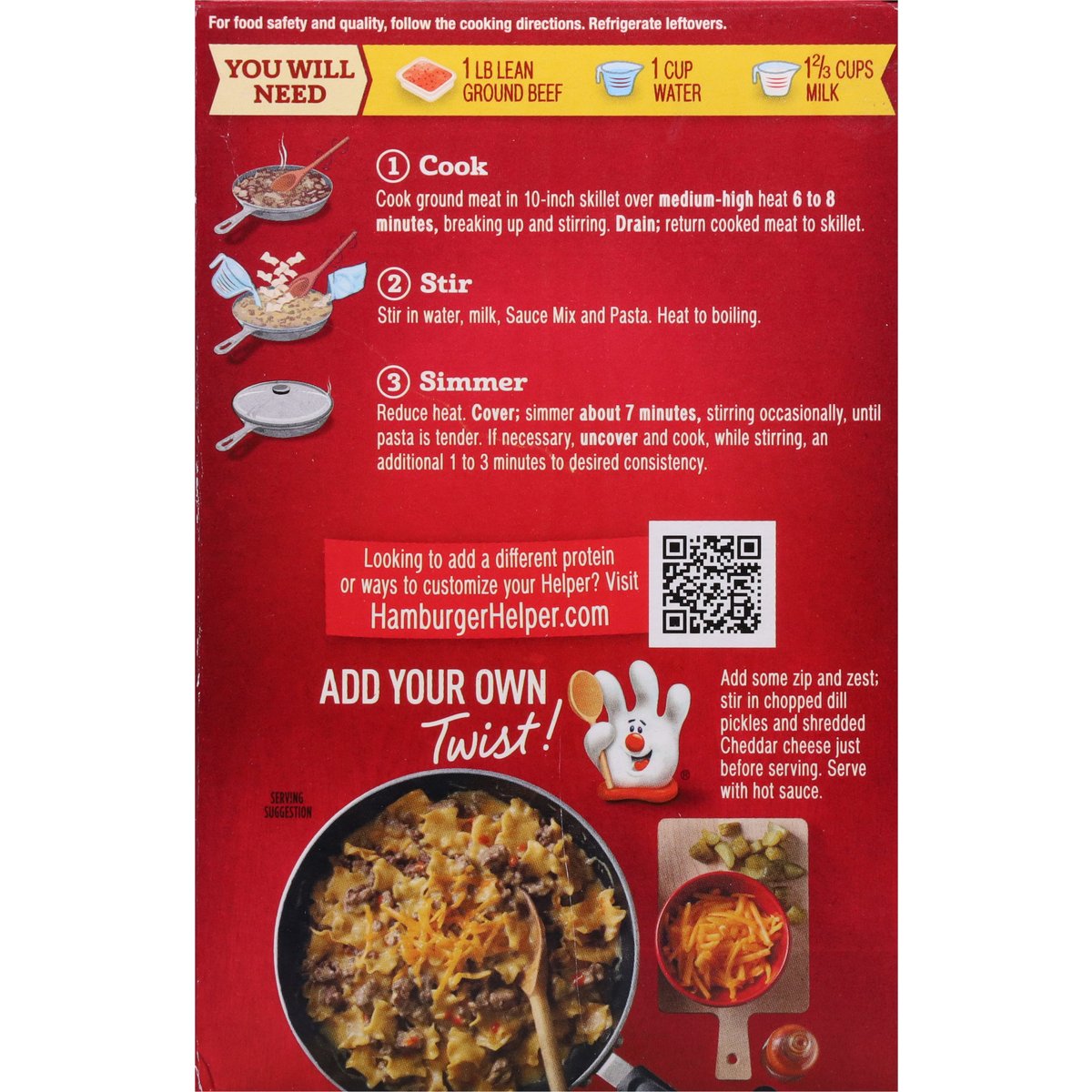 Pasta & cheese sauce mix with other natural flavors. Contains bioengineered food ingredients. Creamy & cheesy sauce. Add ground beef. www.HamburgerHelper.com. how2recycle.info. Looking to add a different protein or ways to customize your Helper? Visit hamburgerhelper.com. Questions or comments? www.HamburgerHelper.com. Certified 100% recycled paperboard. Recyclable