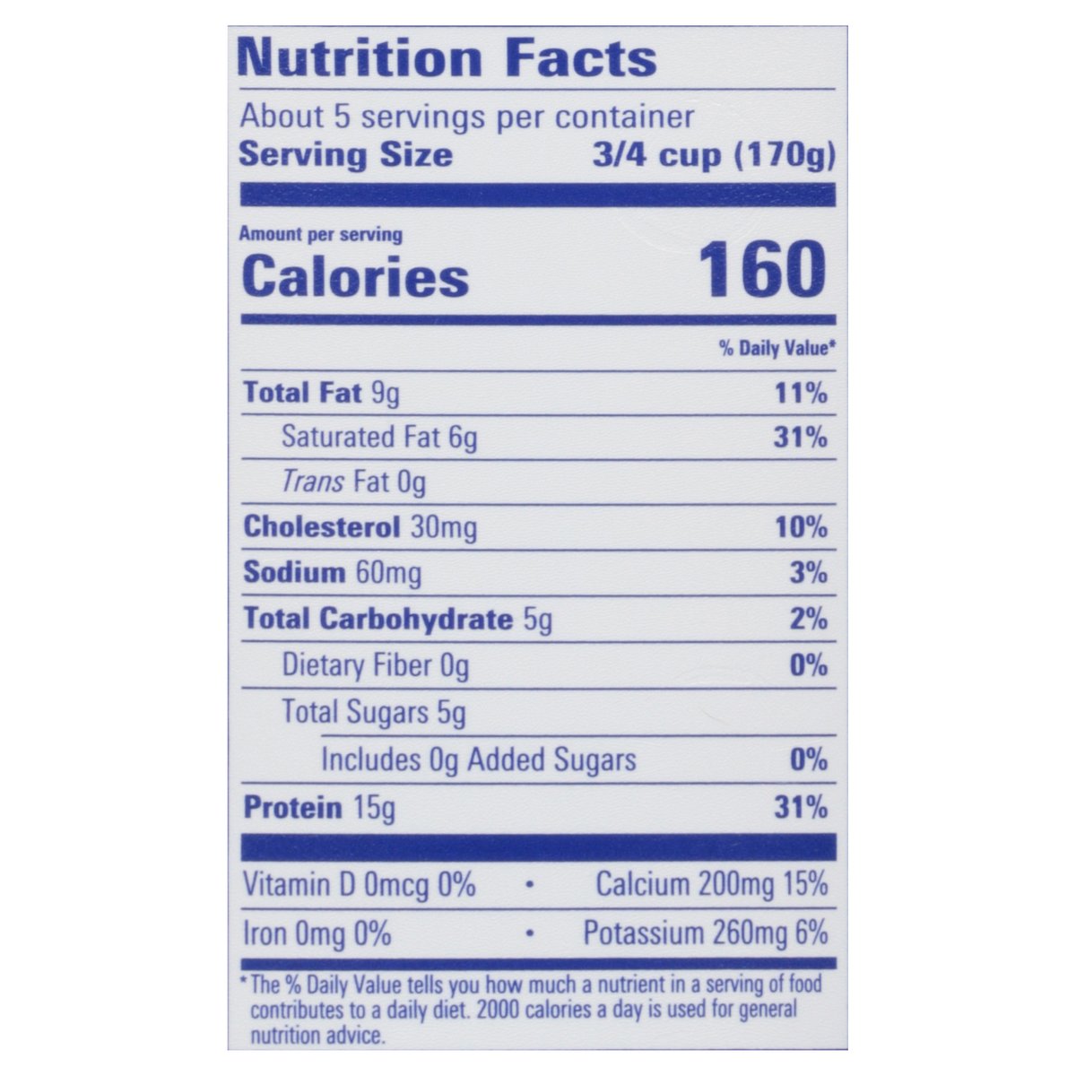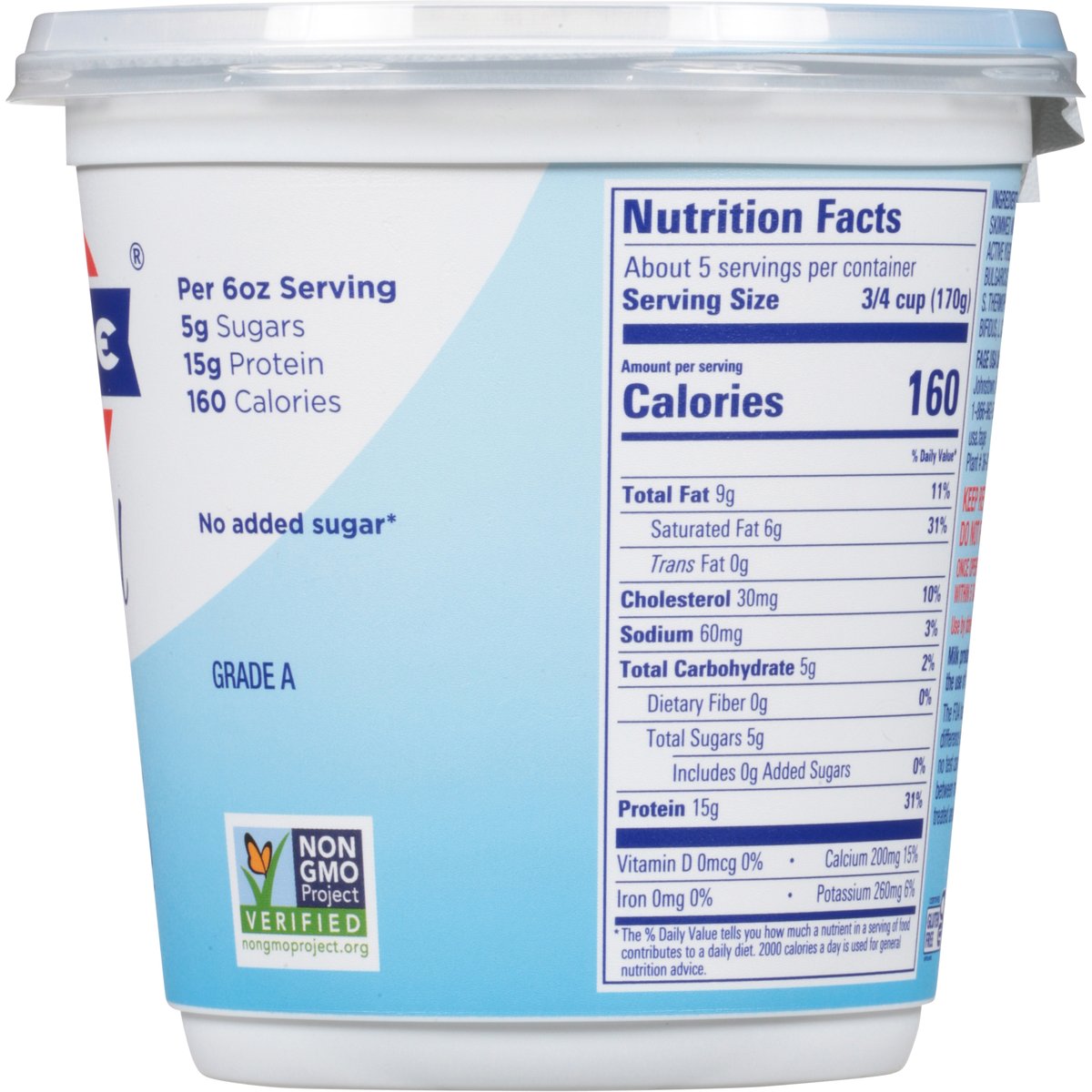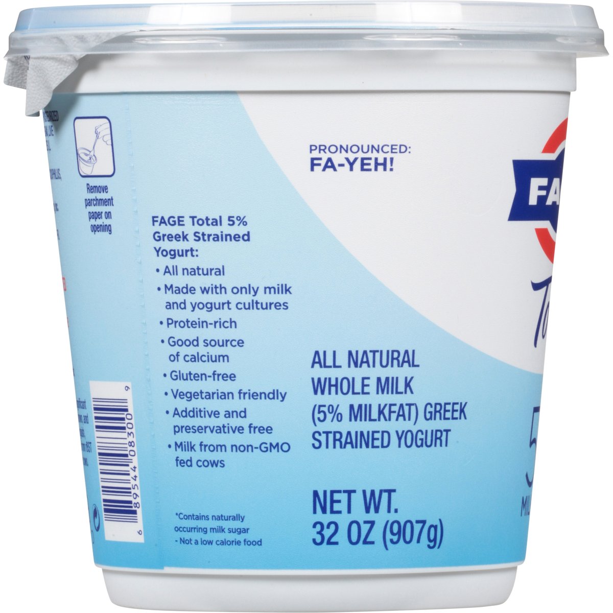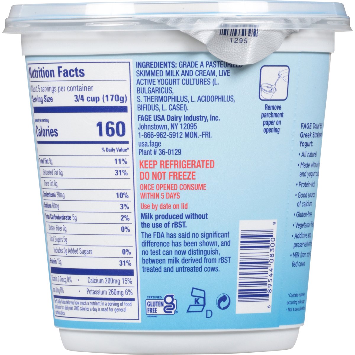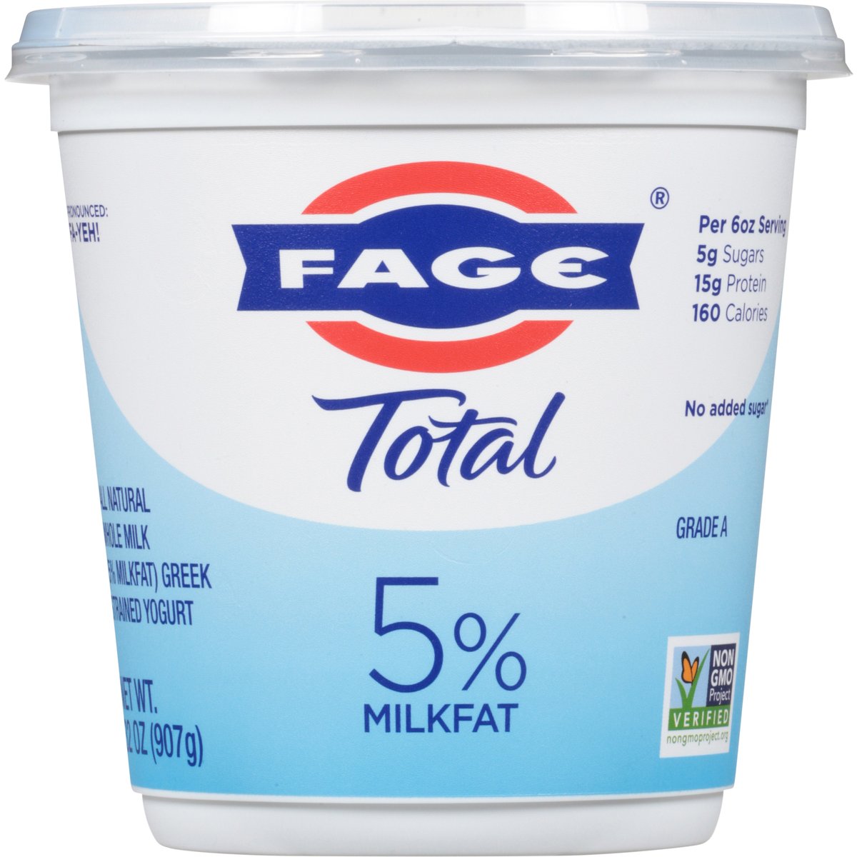All natural whole milk (5% milkfat) greek strained yogurt. Per 6 oz Serving: 5 g sugars; 15 g protein; 160 calories. Certified gluten free. gfco.org. Gluten free. Vegetarian friendly. 5% milkfat. No added sugar (Contains naturally occurring milk sugar). Fage Total 5% Greek Strained Yogurt: All natural; made with only milk and yogurt cultures; protein-rich; good source of calcium; additive and preservative free; milk from non-GMO fed cows. Not a low calorie food. Non-GMO Project verified. nongmoproject.org. Pronounced: Fa-Yeh! Milk produced without the use of rBST. The FDA has said no significant difference has been shown, and no test can now distinguish, between milk derived from rBST treated an untreated cows. Grade A. usa.fage. 1-866-962-5912 Mon.-Fri.