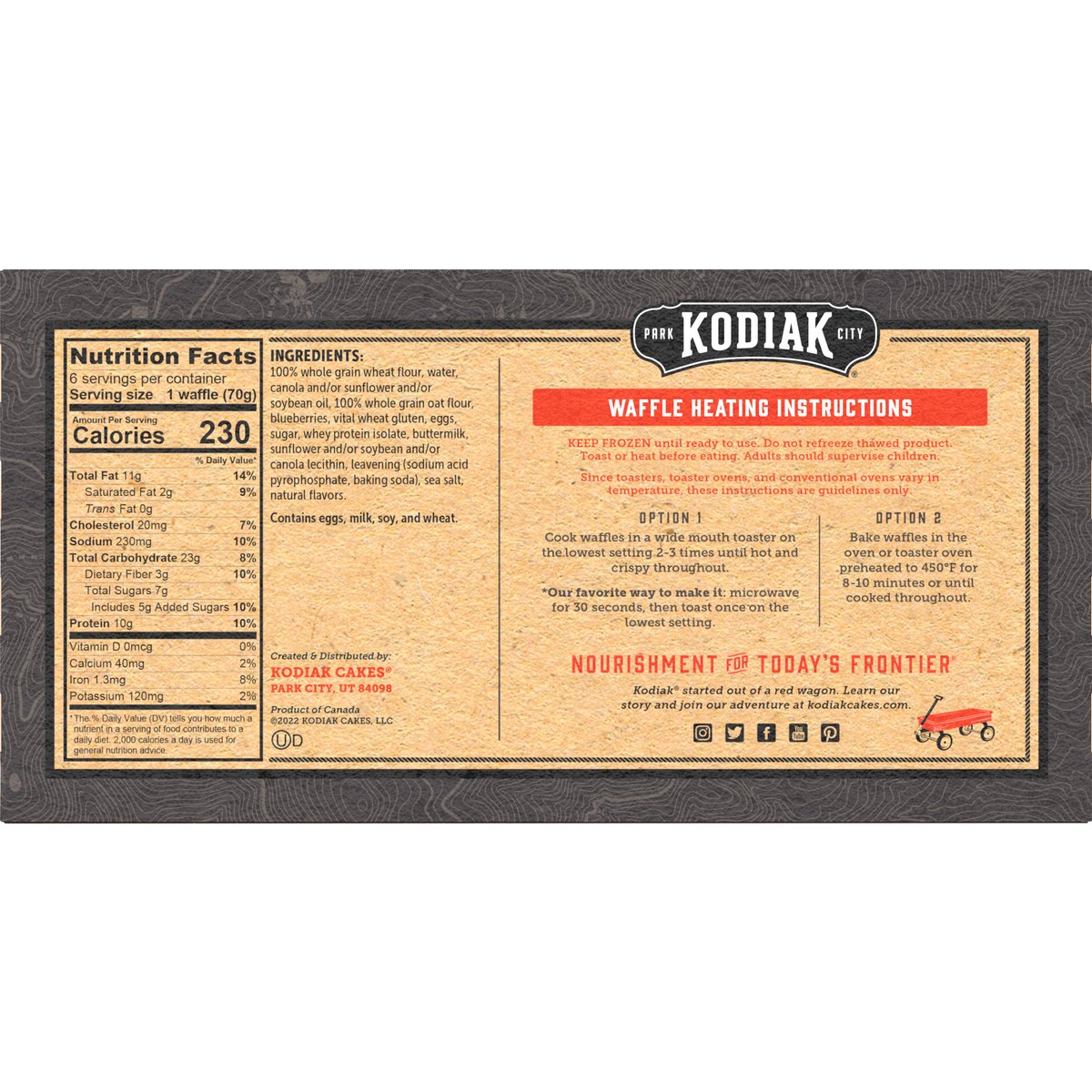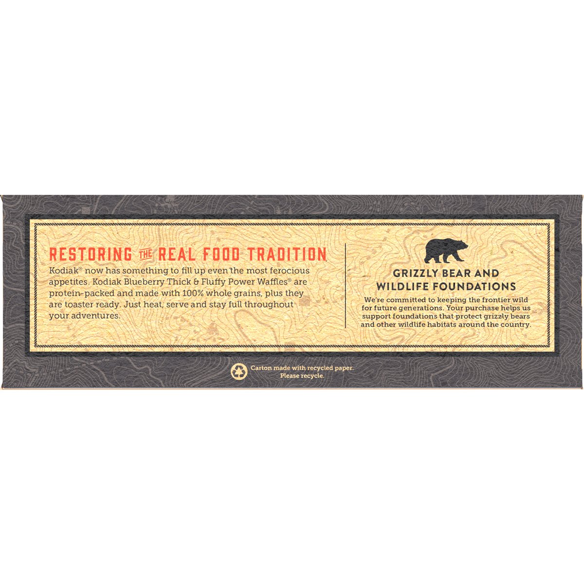 10 g protein per serving. Crafted with 100% whole grains. Protein-packed. Whole grains taste better. kodiakcakes.com. Instagram. Twitter. Facebook. YouTube. Pinterest. Nourishment for Today's Frontier: Kodiak started out of a red wagon. Learn our story and join our adventure at kodiakcakes.com. Grizzly Bear and Wildlife Foundations: We're committed to keeping the frontier wild for future generations. Your purchase helps us support foundations that protect grizzly bears and other wildlife habitats around the country. Discover Another Frontier Favorite: Flapjack & waffle mix; Protein-packed oatmeal; Muffin power-cups. Carton made with recycled paper. Please recycle. Product of Canada.