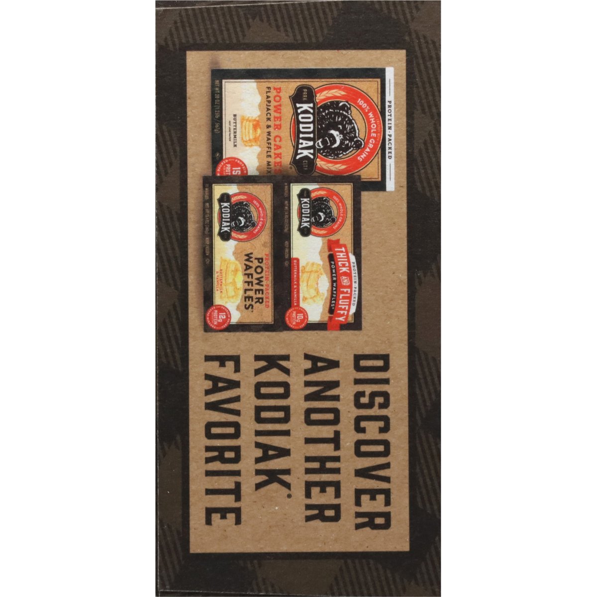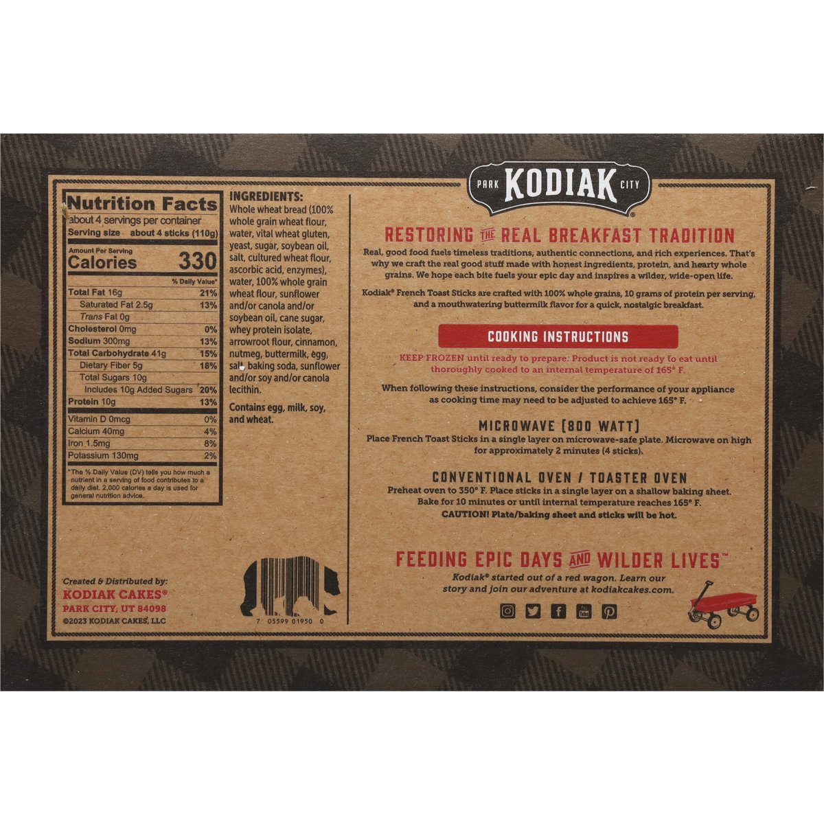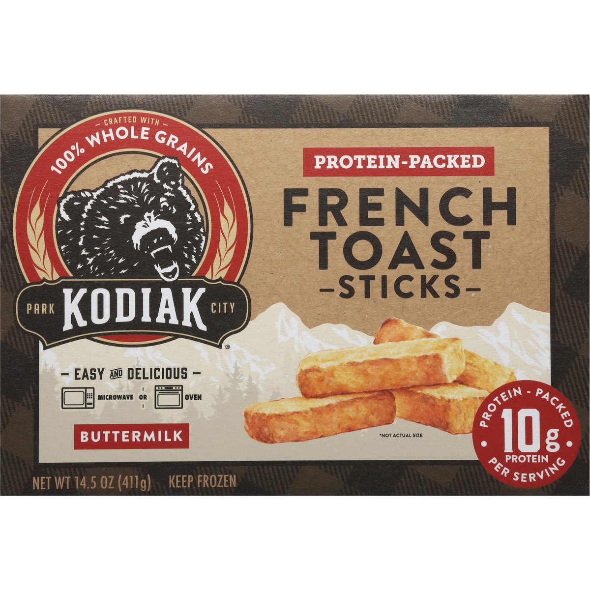 10 g protein per serving. Crafted with 100% whole grains. Protein-packed. Easy and Delicious: Microwave or oven. Restoring the real breakfast tradition. Real, good food fuels timeless traditions. authentic connections, and rich experiences. That's why we craft the real good stuff made with honest ingredients, protein, and hearty whole grains. We hope each bite fuels your epic day and inspires a wilder, wide-open life. Kodiak French Toast Sticks are crafted with 100% whole grains, 10 grams of protein per serving, and a mouthwatering cinnamon flavor for a quick, nostalgic breakfast. Feeding epic days and Wilder Lives. Kodiak started out of a red wagon. Whole grains taste better. kodiakcakes.com. Instagram. Twitter. Facebook. YouTube. Pinterest. Learn our story and join our adventure at kodiakcakes.com. Grizzly Bear and Wildlife Foundations. We want to keep the frontier wild for future generations, so we donate part of every purchase to foundations that protect grizzly bears and other wildlife habitats around the country. Kodiak Power Cakes. Discover another Kodiak favorite. Made with recycled material. Please recycle.