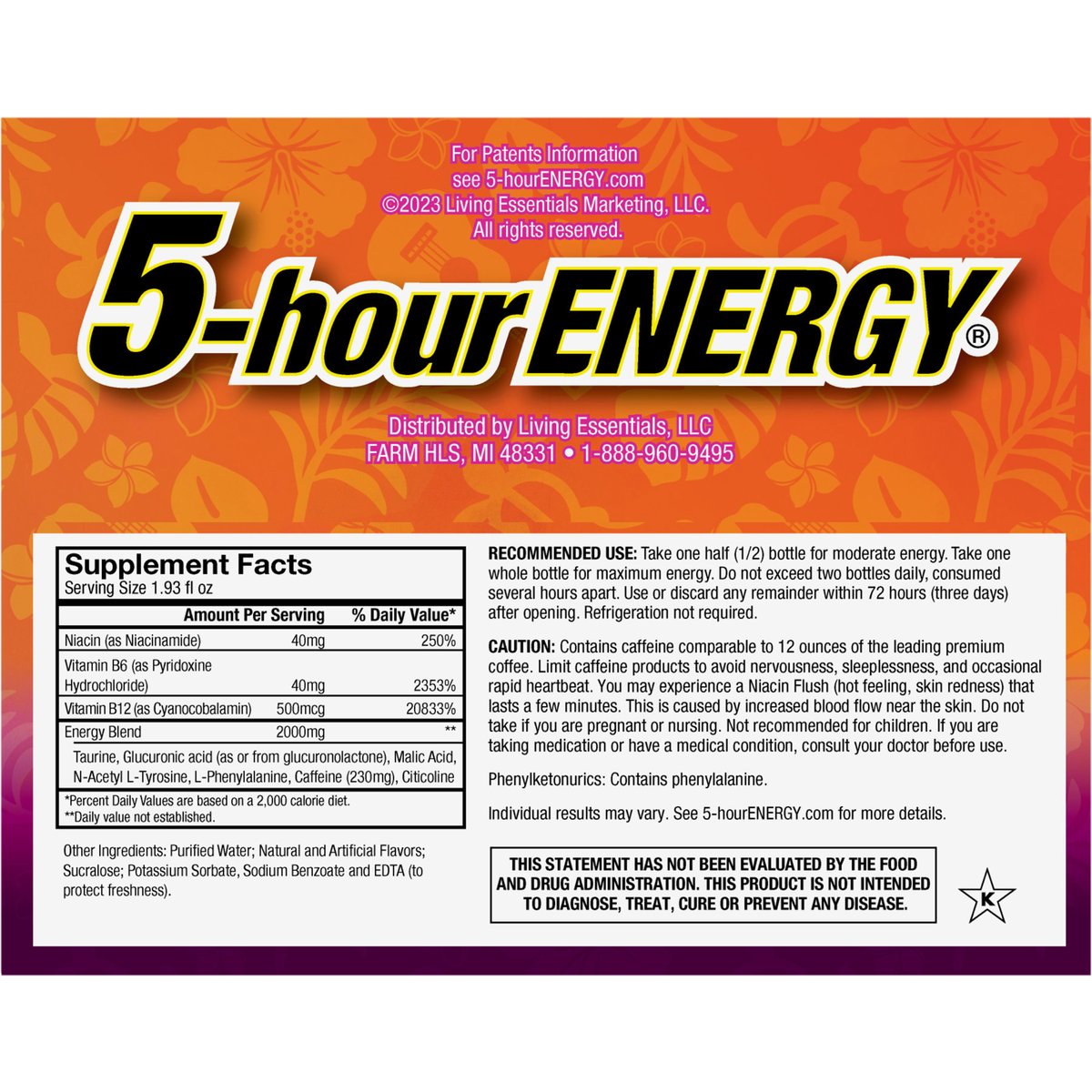 Dietary Supplement. Sugar free. Vitamins. 230 mg caffeine. Fixes tired fast. Individual results may vary. www.5hourenergy.com. For patents Information see 5-hourEnergy.com. 1-888-960-9495. See 5-hourEnergy.com for more details. This statement has not been evaluated by the Food and Drug Administration. This product is not intended to diagnose, treat, cure or prevent any disease.