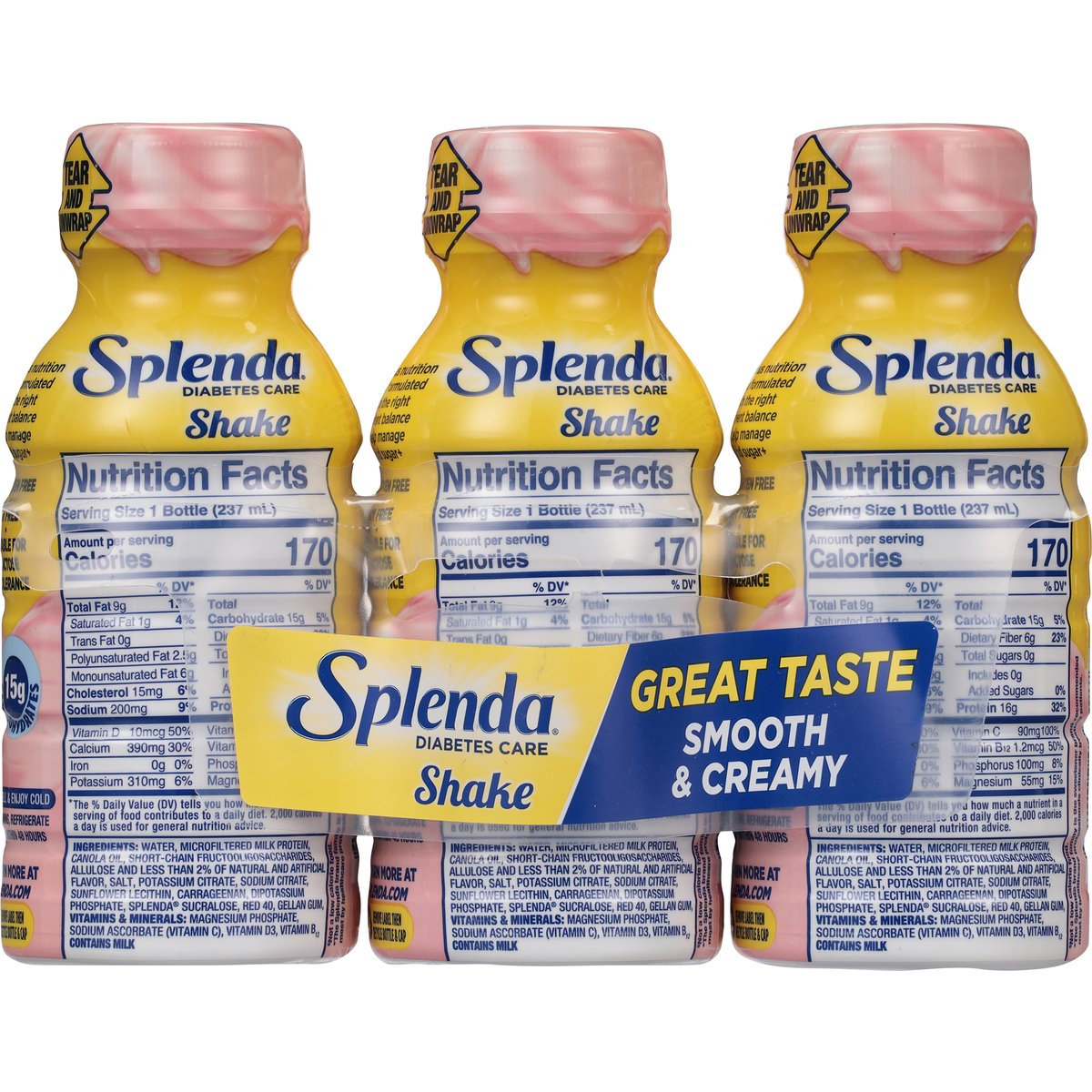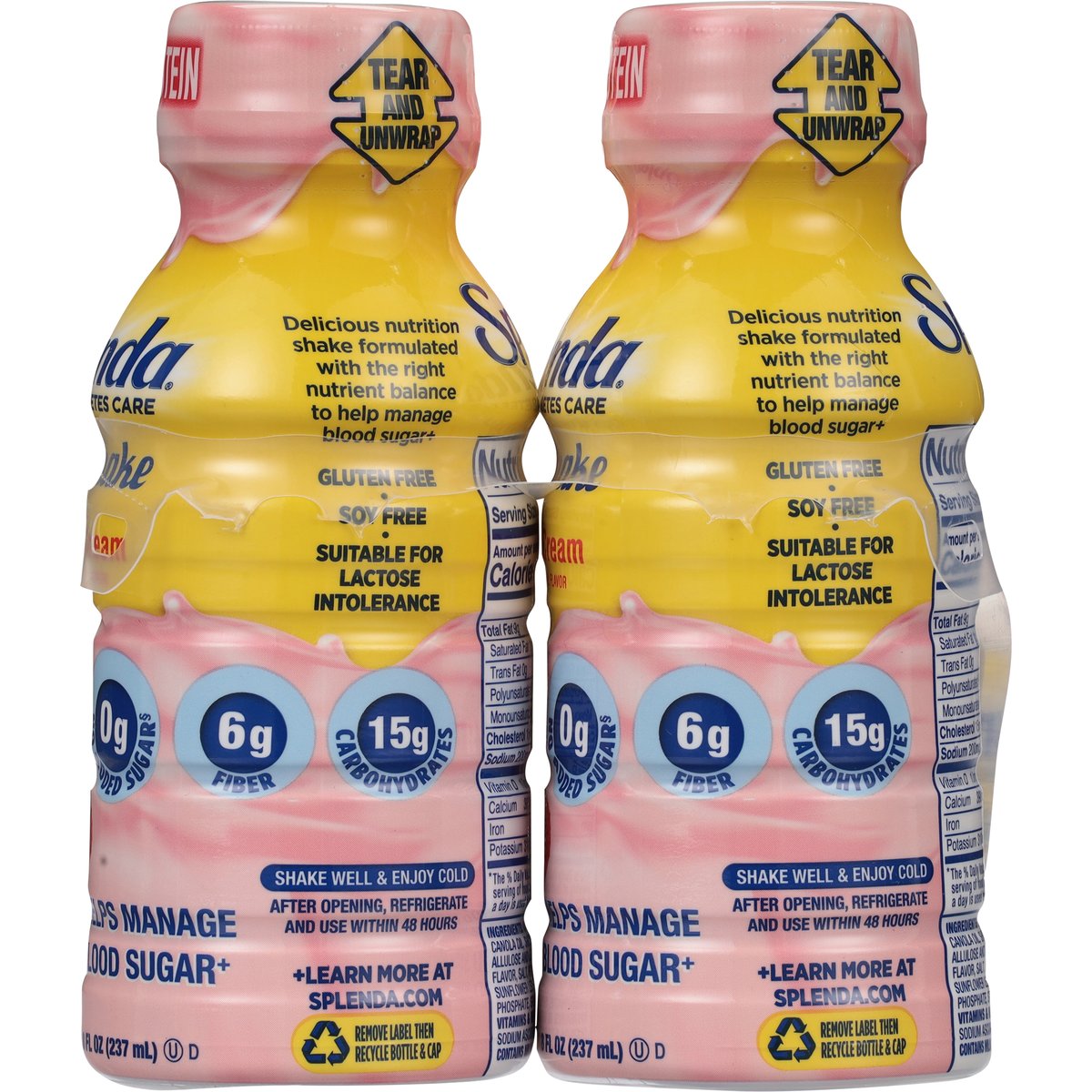 Natural and artificial flavor. 16 g protein; 0 g no added sugars(a); 6 g fiber; 15 g carbohydrates. (a) Not a low calorie food. Gluten free. Soy free. From the #1 recommended by doctors and dietitians* sweetener brand. Helps manage blood sugar+. Great taste. Smooth & creamy. Delicious nutrition shake formulated with the right nutrient balance to help manage blood sugar+. * The Splenda brand family is the sweetener brand recommended most by healthcare professionals clinically treating patients. Suitable for lactose intolerance. (a) Learn more at splenda.com. + Learn more at splenda.com. Facebook: facebook.com/Splenda. 1-800-777-5363. Learn more at splenda.com. Remove label then recycle bottle & cap.