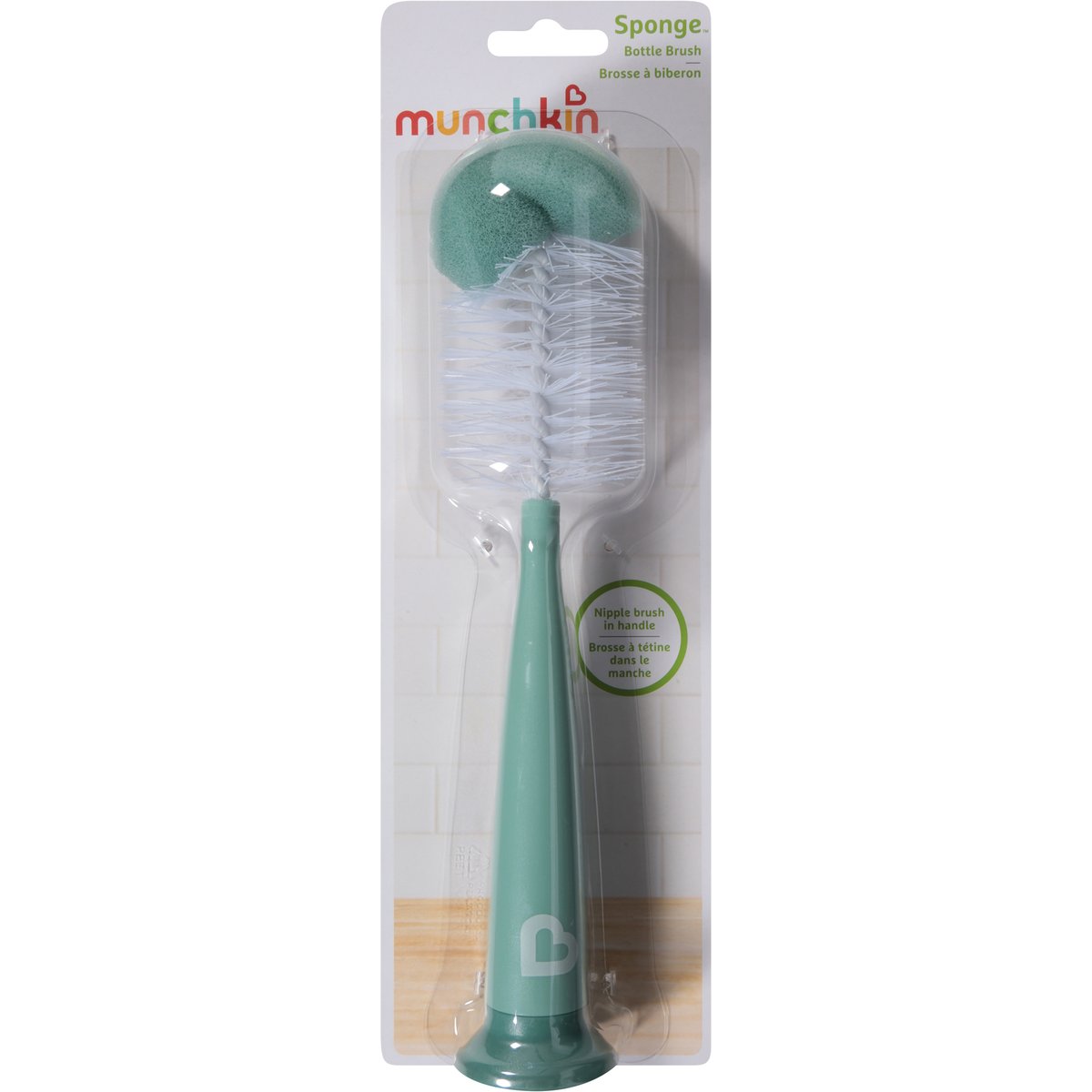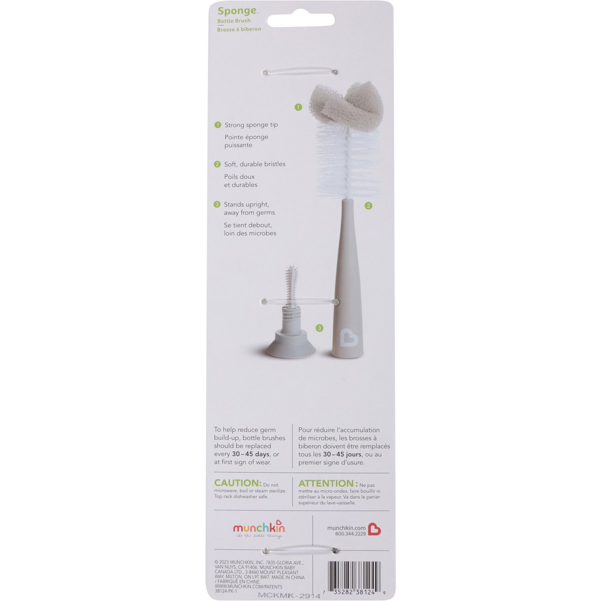 Nipple brush in handle. 1. Strong sponge tip. 2. Soft durable bristles. 3. Stands upright. To help reduce germ build-up, bottle brushes should be replaced every 30-45 days, or at first sign of wear. Munchkin: It’s the little things. munchkin.com. 800.344-2229. Made in China.