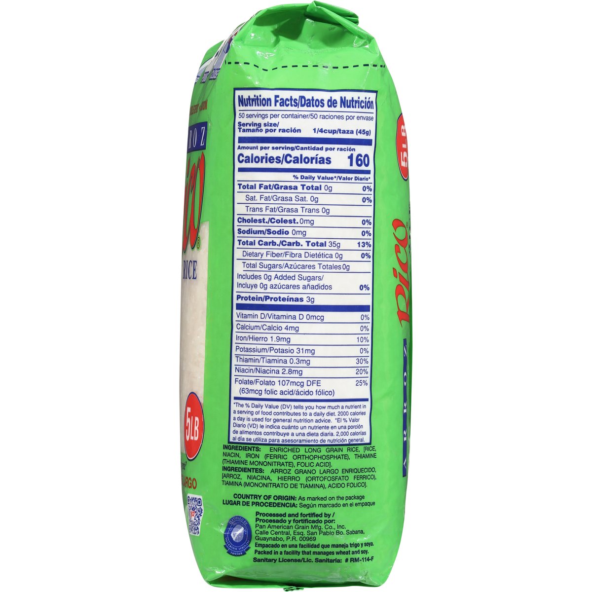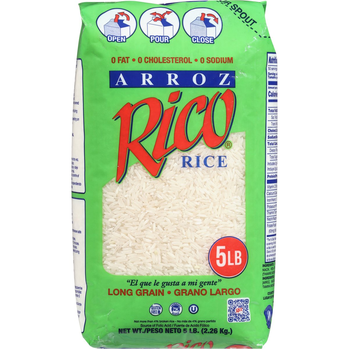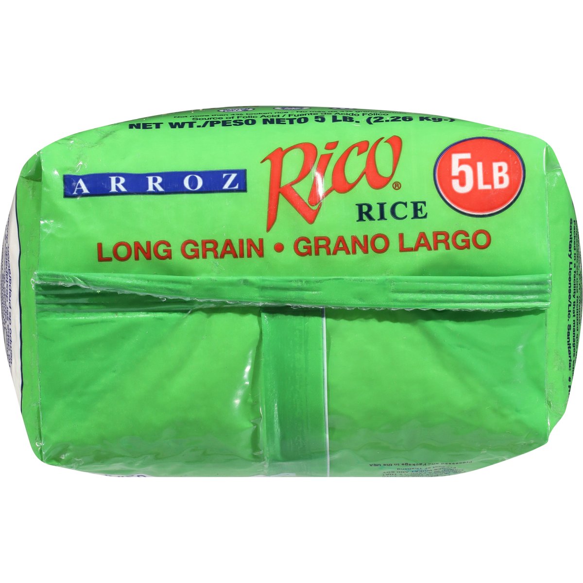 5 lbs. Source of folic acid. Not more than 4% broken grain. Polished and fortified. www.arrozrico.com. Country of Origin: United States.