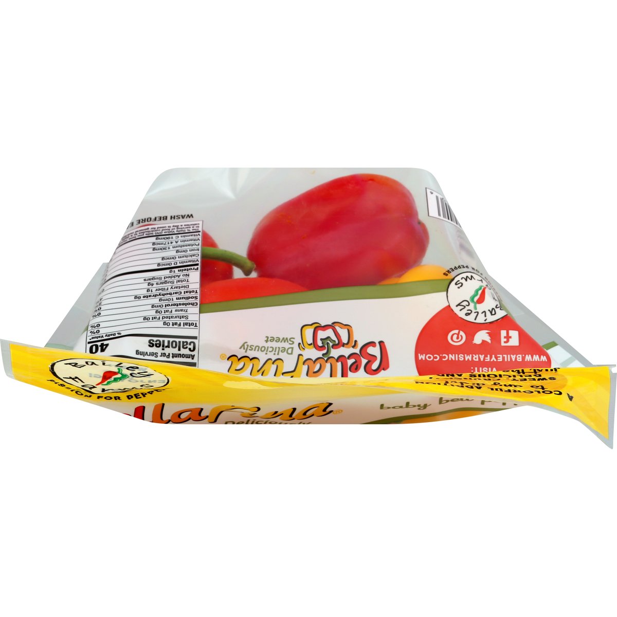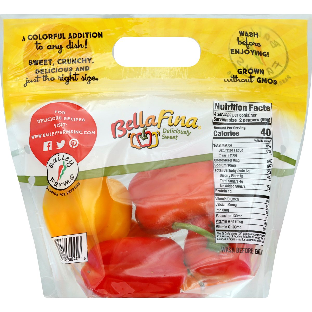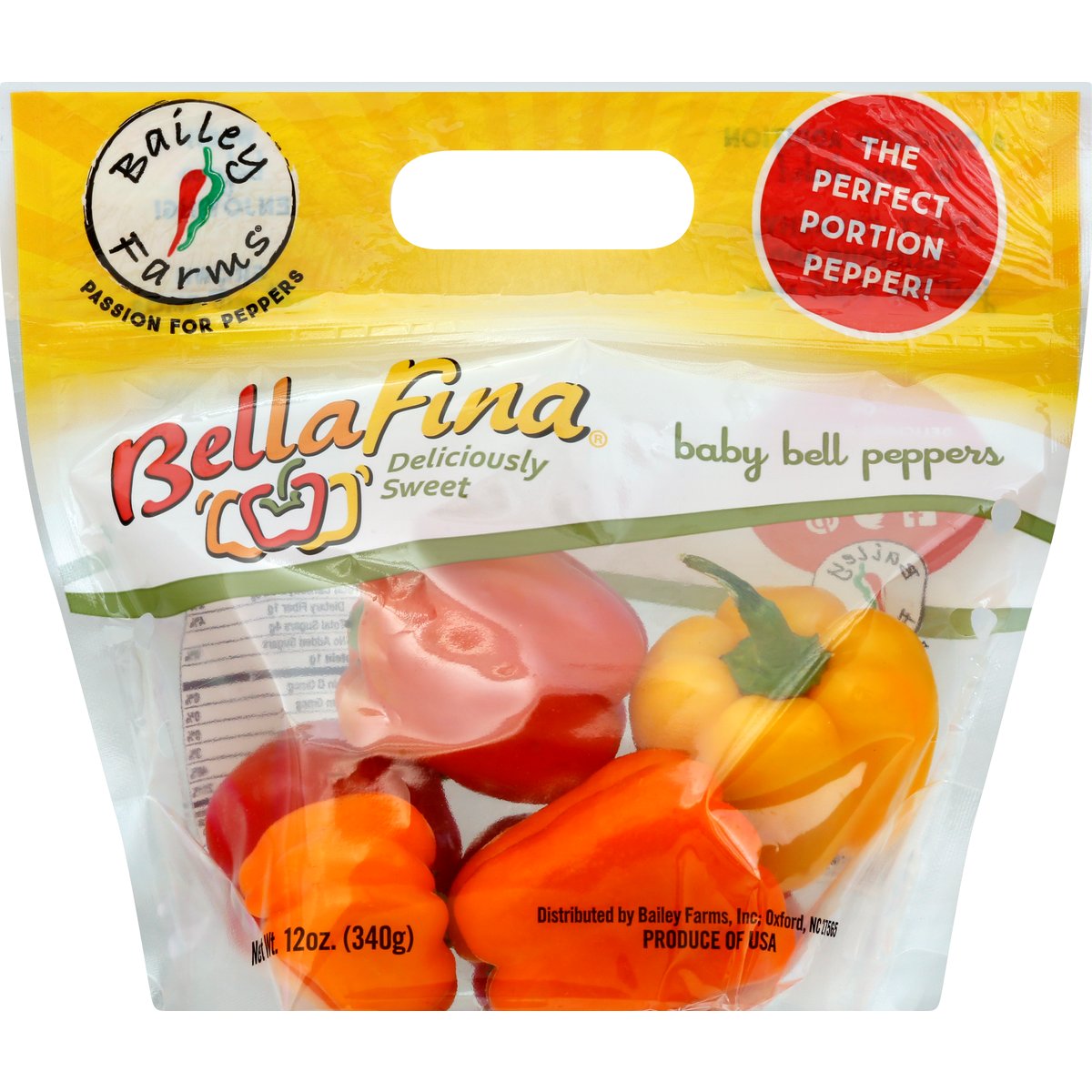 Grown without GMOs. Passion for peppers. The perfect portion pepper! Deliciously sweet. A colorful addition to any dish! Sweet, crunchy, delicious and just the right size. www.baileyfarmsinc.com. Facebook. Twitter. Pinterest. Produce of USA.