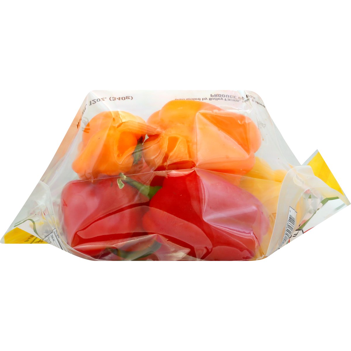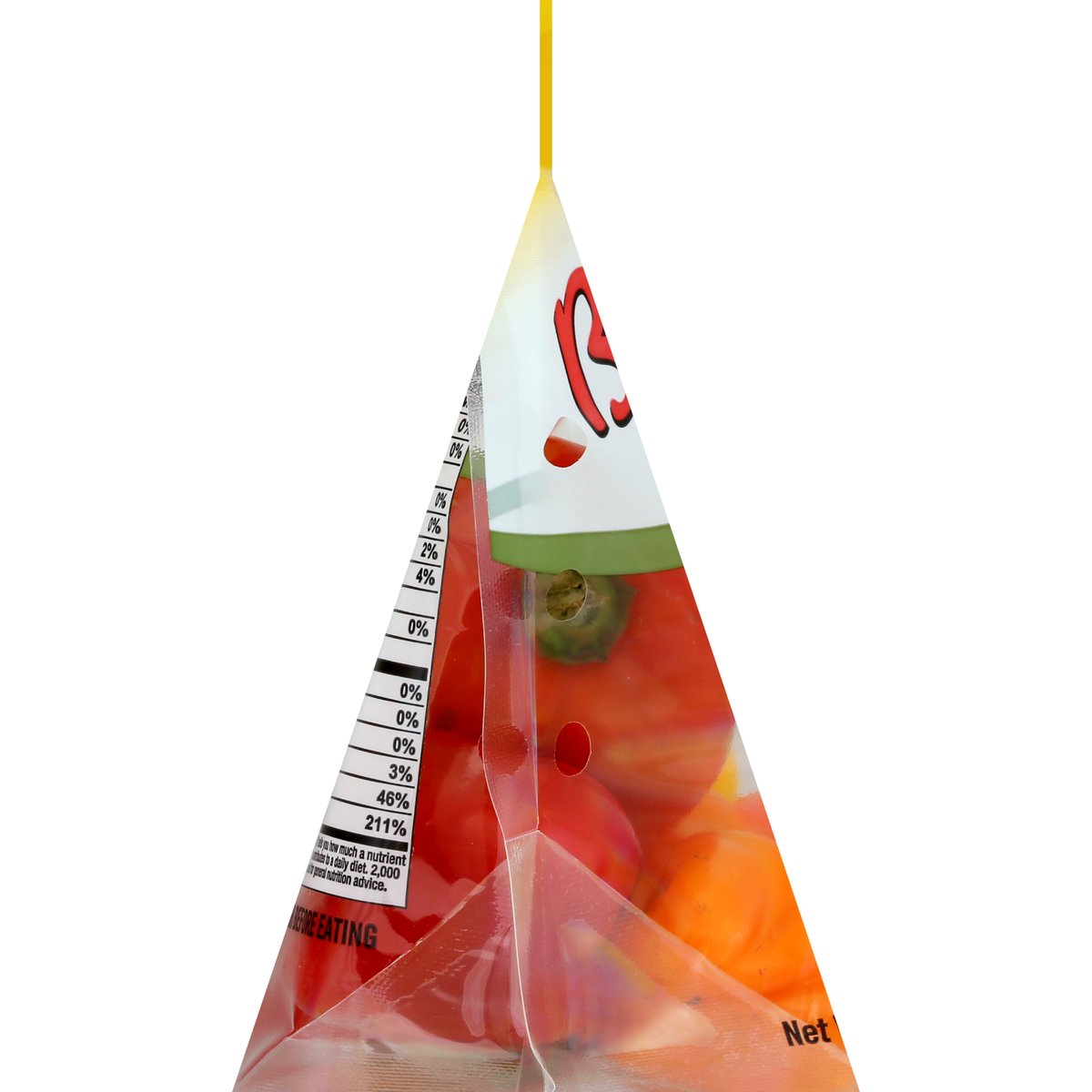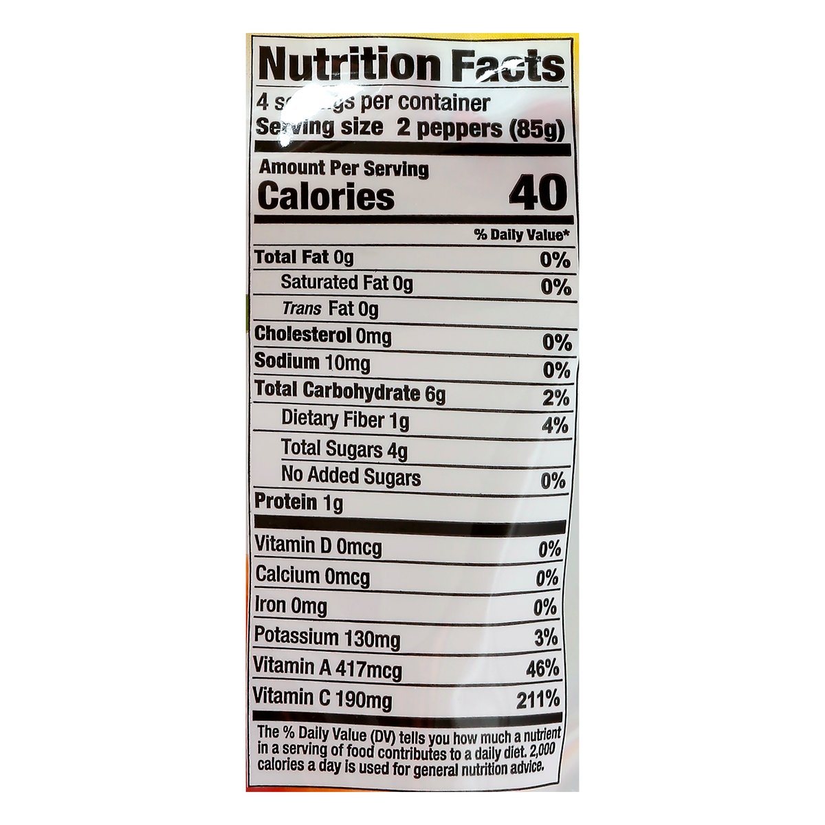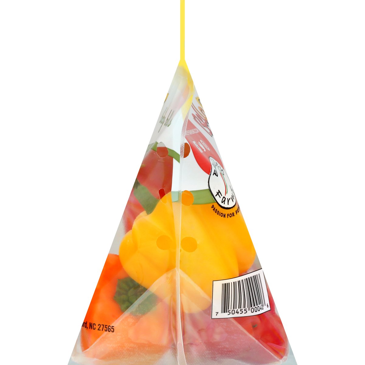 Grown without GMOs. Passion for peppers. The perfect portion pepper! Deliciously sweet. A colorful addition to any dish! Sweet, crunchy, delicious and just the right size. www.baileyfarmsinc.com. Facebook. Twitter. Pinterest. Produce of USA.
