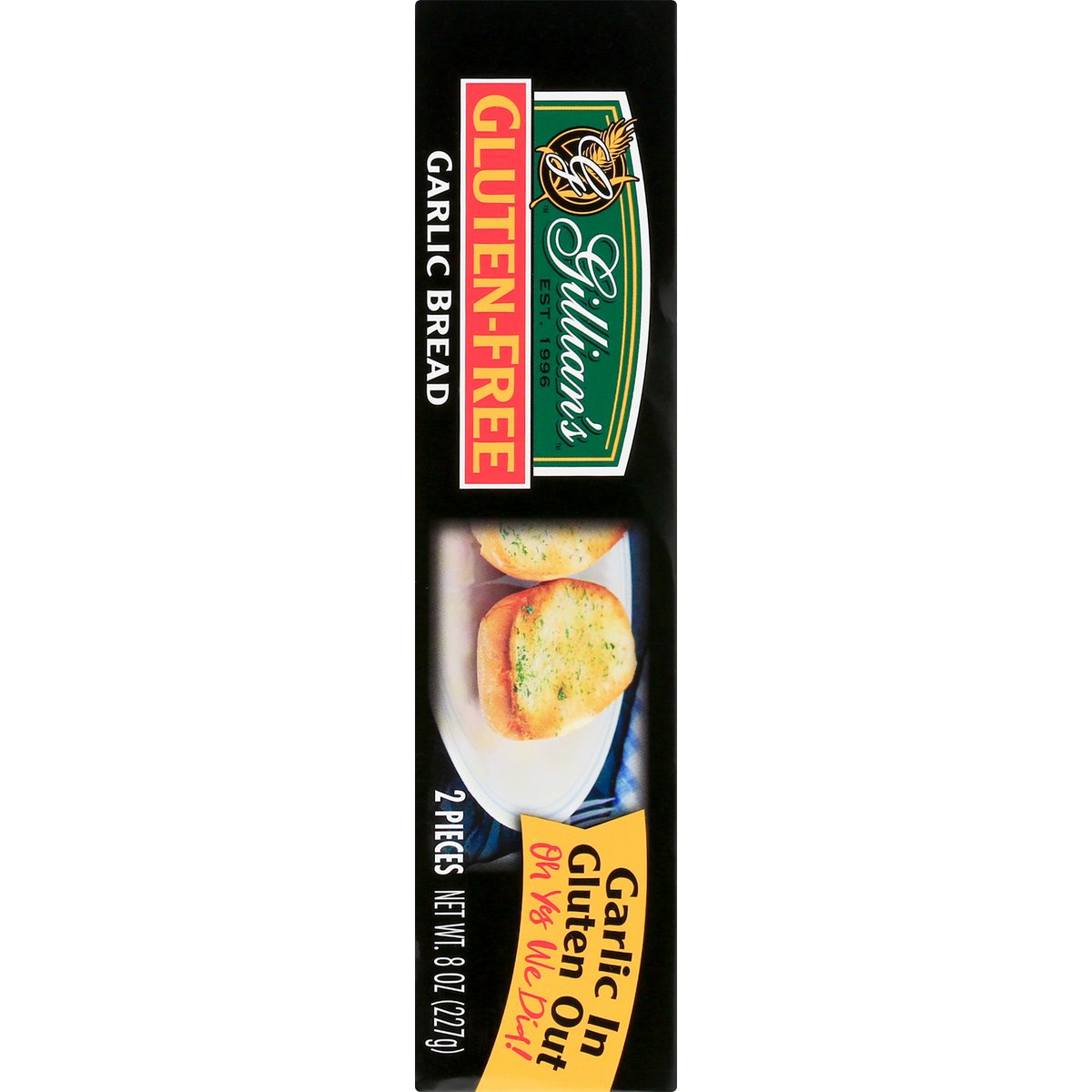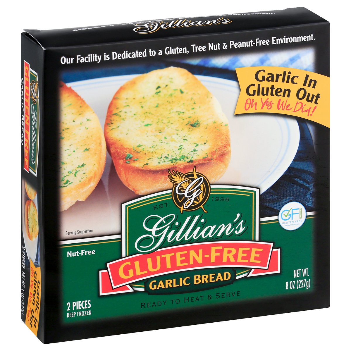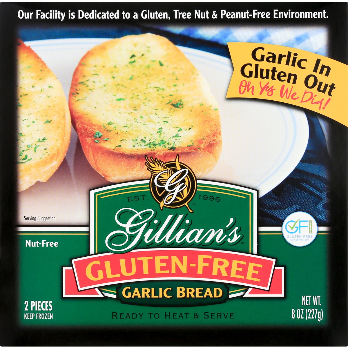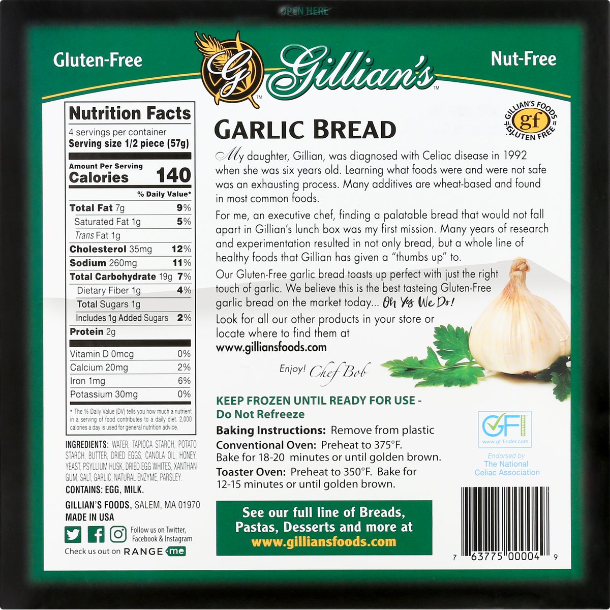Our facility is dedicated to gluten, tree nut & peanut-free environment. Certified gluten free. Endorsed by: National Celiac Association. Garlic in gluten out oh yes we did! Est. 1996. My daughter, Gillian, was diagnosed with Celiac disease in 1992 when she was six years old. Learning what foods were and were not safe was an exhausting process. Many additives are wheat-based and found in most common foods. For me, an executive chef, finding a palatable bread that would not fall apart in Gillian's lunch box was my first mission. Many years of research and experimentation resulted in not only bread, but a whole line of healthy foods that Gillian has give a thumbs up to. Our gluten-free garlic bread toasts up perfect with just the right touch of garlic. We believe this is the best tasting Gluten-free garlic bread on the market today. Oh yes we do! Enjoy! - Chef Bob. www.gilliansfoods.com Follow us on Twitter, Facebook & Instagram. See our full line of breads, pastas, desserts, and more at www.gilliansfoods.com. Check us out Range.me. Look for all our other products in your store or locate where to find them at www.gilliansfood.com. Made in USA.