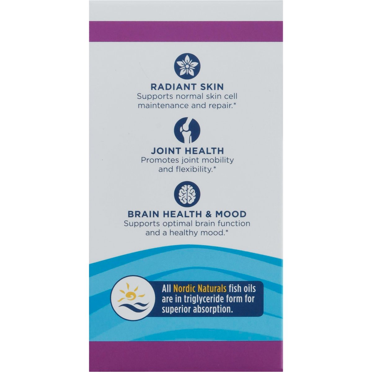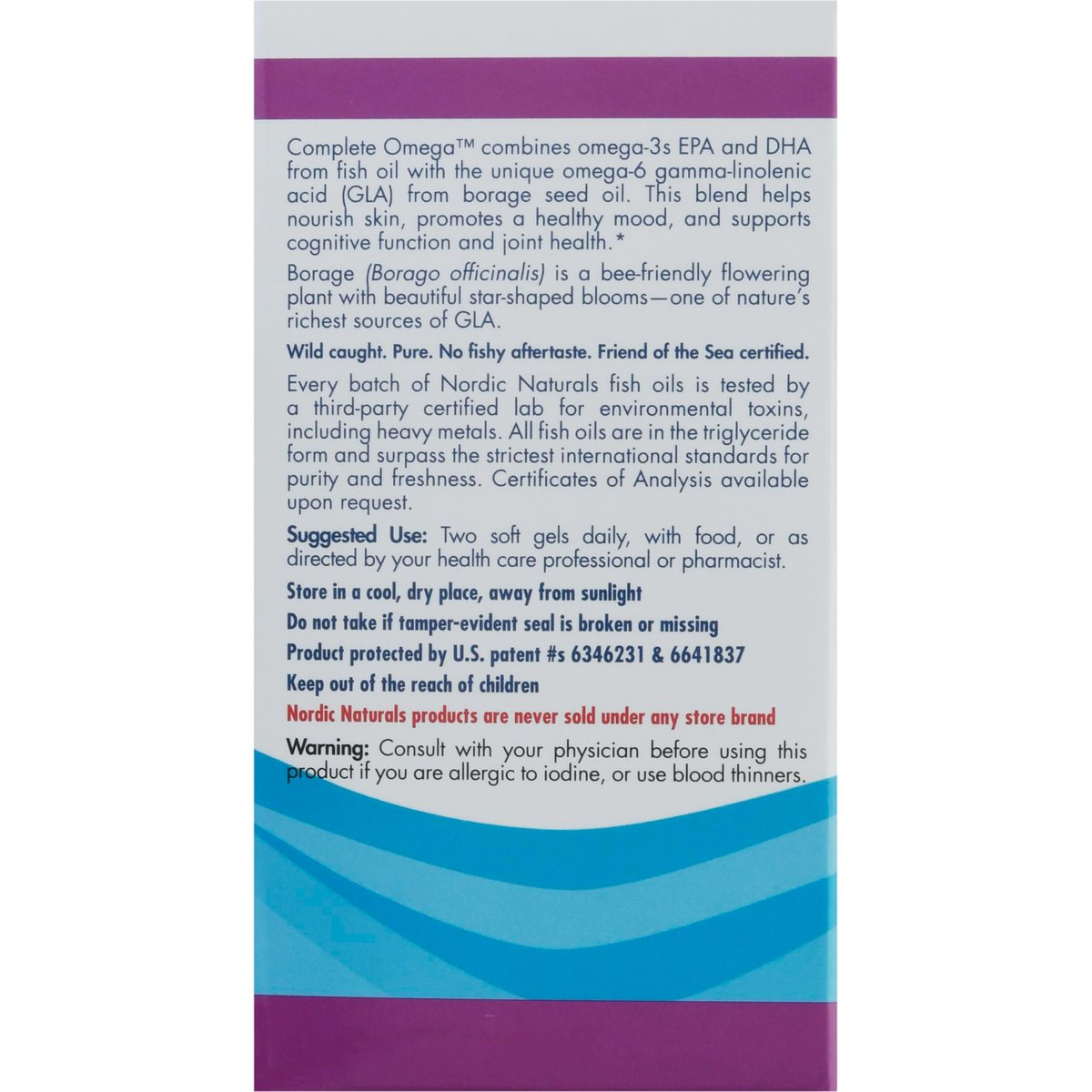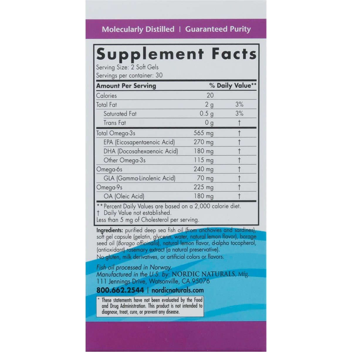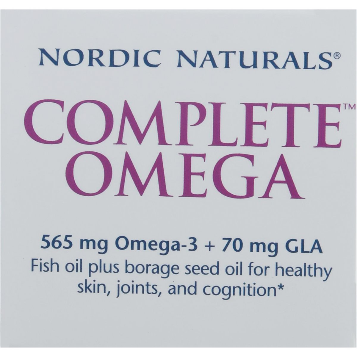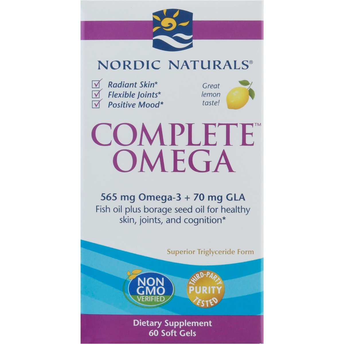 Dietary Supplement. No artificial colors or flavors. 565 mg Omega-3 + 70 mg GLA. No gluten, milk derivatives. Non-GMO verified. Radiant skin. Flexible joints. Positive mood. Great lemon taste! Fish oil plus borage seed oil for healthy skin, joints, and cognition. Superior triglyceride form. Purity third-party tested. Radiant skin. Supports normal skin cell maintenance and repair. Joint health. Promotes joint mobility and flexibility. Brain health & mood. Supports optional brain function and a healthy mood. All Nordic Naturals fish oils are in triglyceride form for super. Complete Omega combines omega-3s EPA and DHA from fish oil with the unique omega-6 gamma-linolenic acid (GLA) from borage seed oil. This blend helps nourish skin, promotes a healthy mood, and supports cognitive function and joint health. Borage (Borage Officinalis) is a bee-friendly flowering plant with beautiful star-shaped blooms-one of nature's richest sources of GLA. Wild caught. Pure. No fishy aftertaste. Friend of the Sea certified. Every batch of Nordic Naturals fish oils is tested by a third-party certified lab for environmental toxins, including heavy metals. All fish oils are in the triglyceride form and surpass the strictest international standards for purity and freshness. Certificates of Analysis available upon request. Nordic Naturals products are never sold under any store brand. Molecularly distilled. Fish oil processed in Norway. Guaranteed purity. nordicnaturals.com. Please recycle this container. This statement has not been evaluated by the Food and Drug Administration. This product is not intended to diagnose, treat, cure, or prevent any disease. Product protected by U.S. patents.