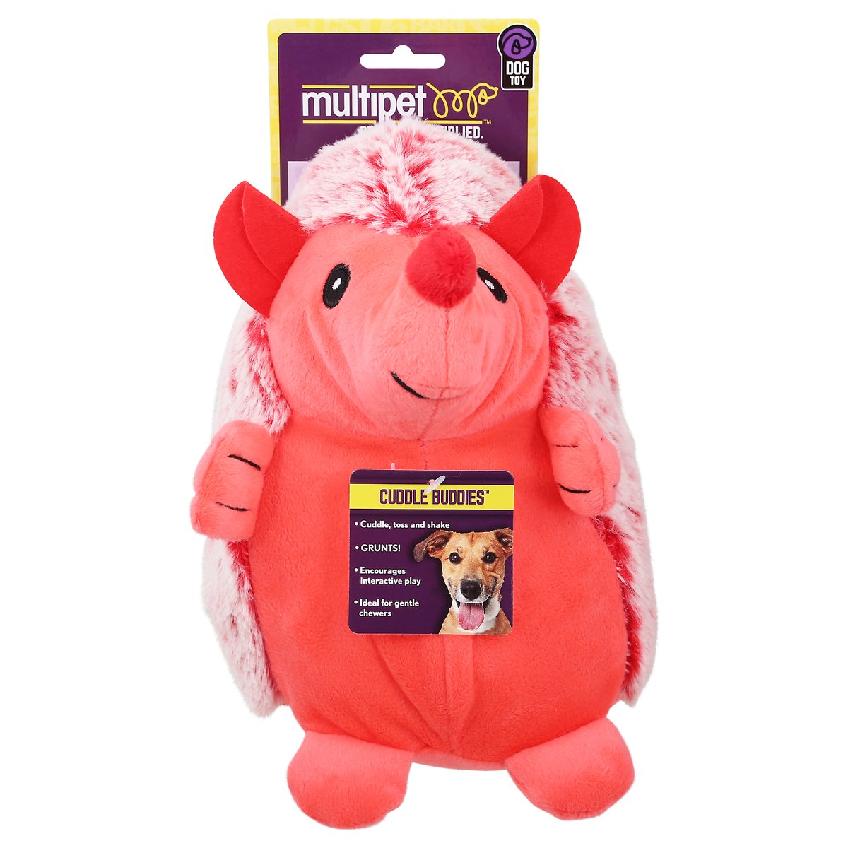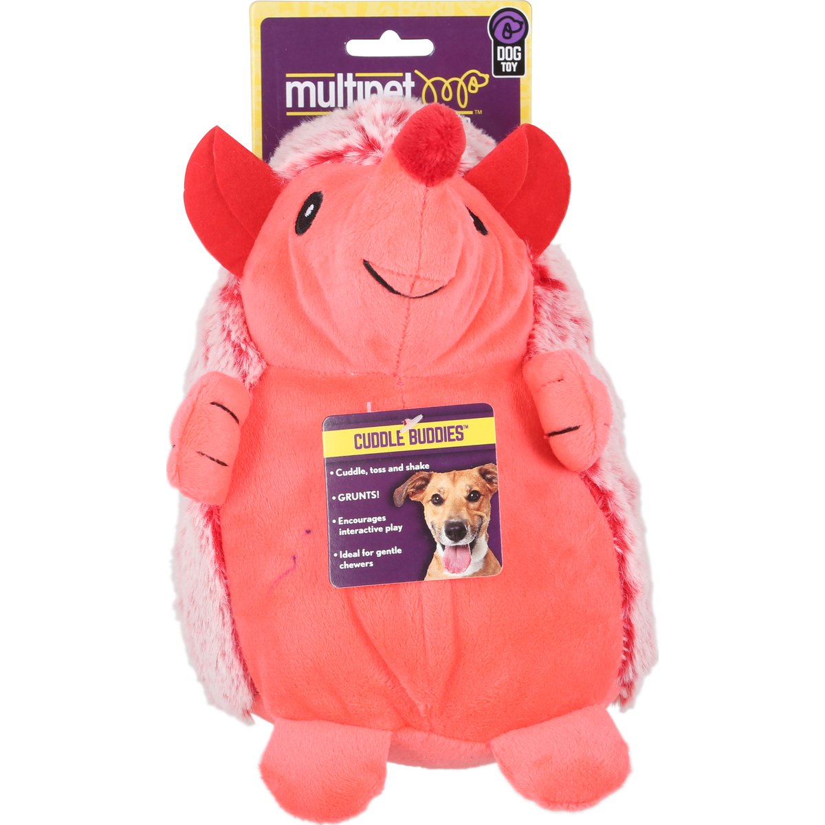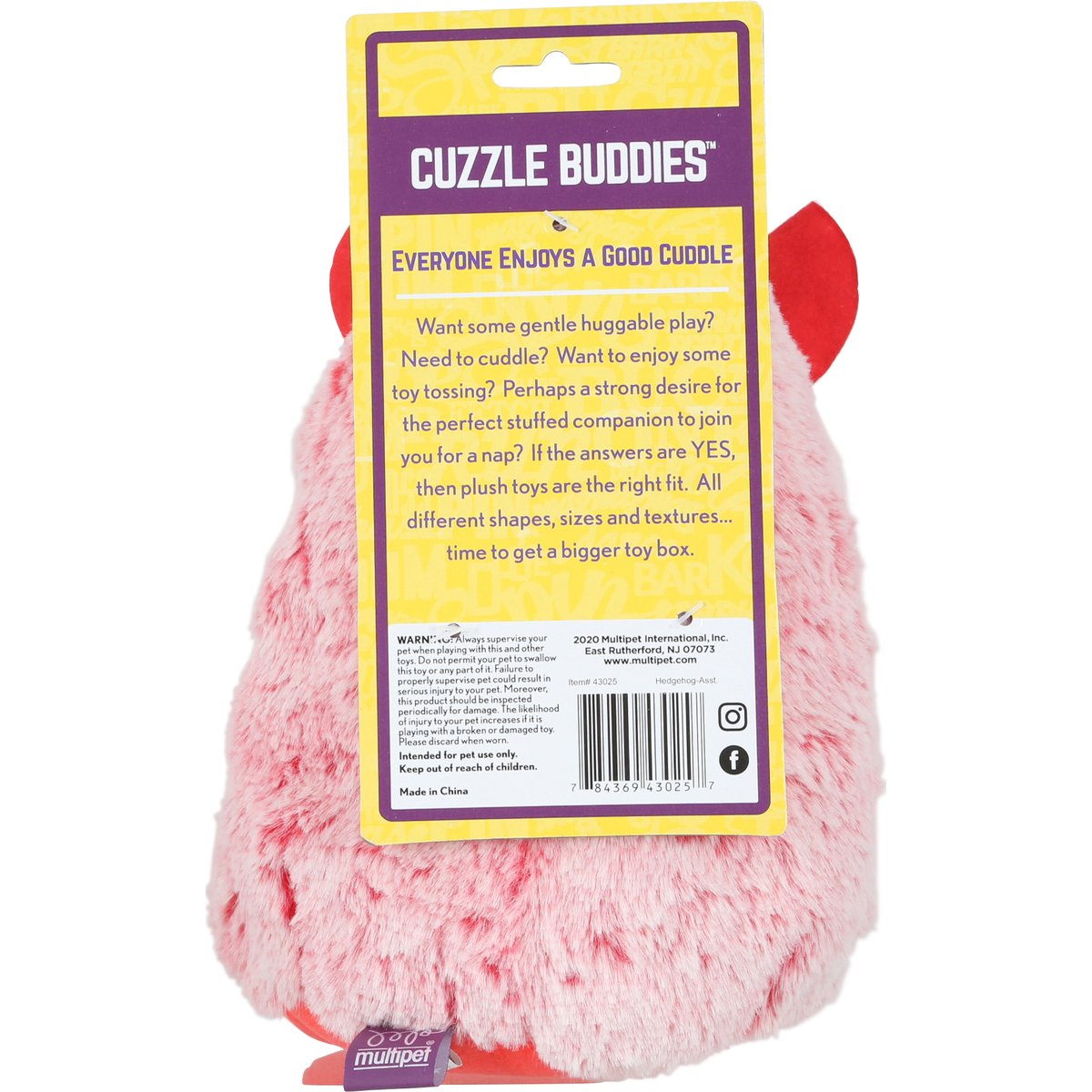 Cuddle, toss and shake. Grunts! Encourages interactive play. Ideal for gentle chewers. Cuzzle buddies. Everyone Enjoys a Good Cuddle: Want some gentle huggable play? Need to cuddle? Want to enjoy some toy tossing? Perhaps a strong desire for the perfect stuffed companion to join you for a nap? If the answers are yes, then plush toys are the right fit. All different shapes, sizes and textures. Time to get a bigger toy box. New material only. All new material. Surface wash only! www.multipet.com. Instagram. Facebook. Made in China.