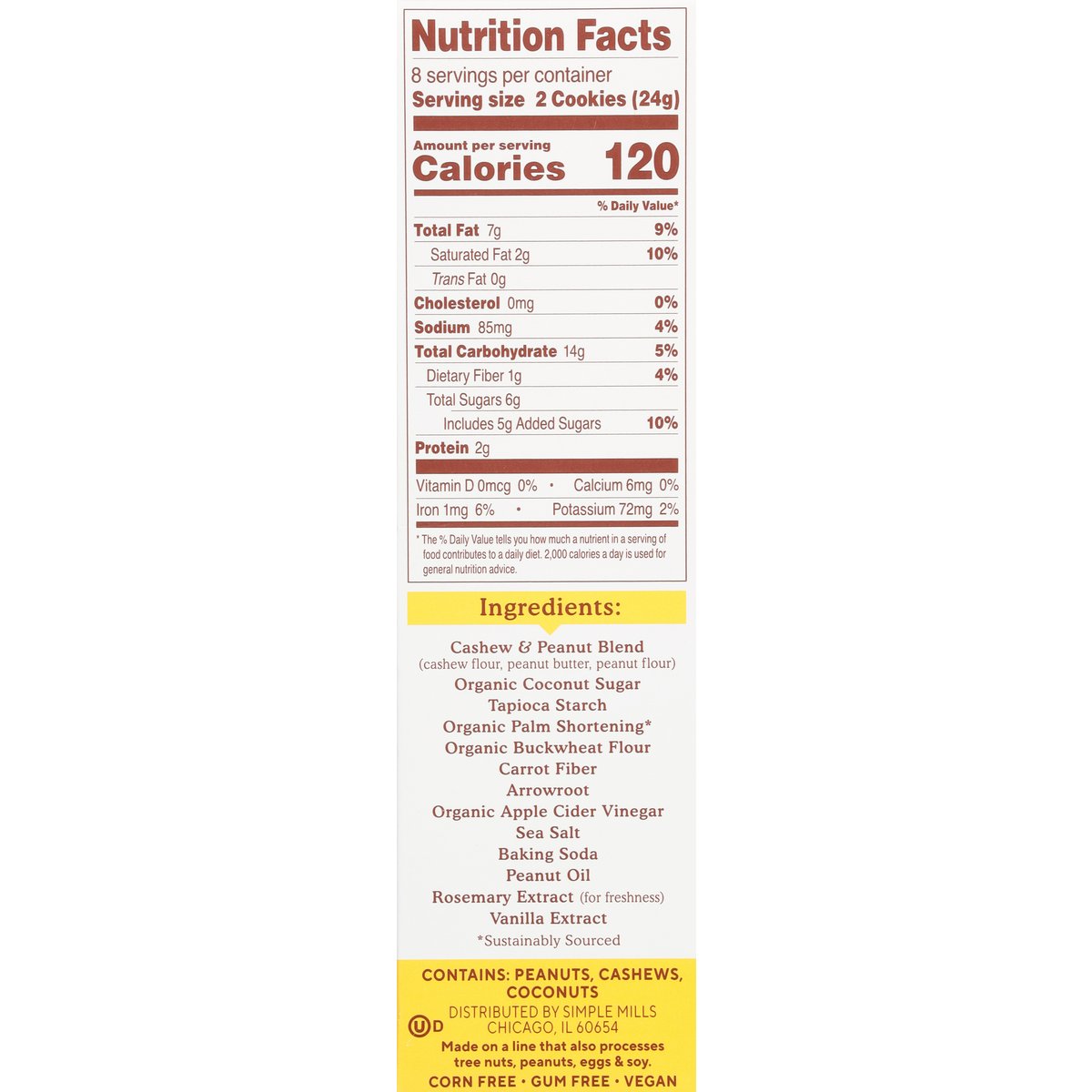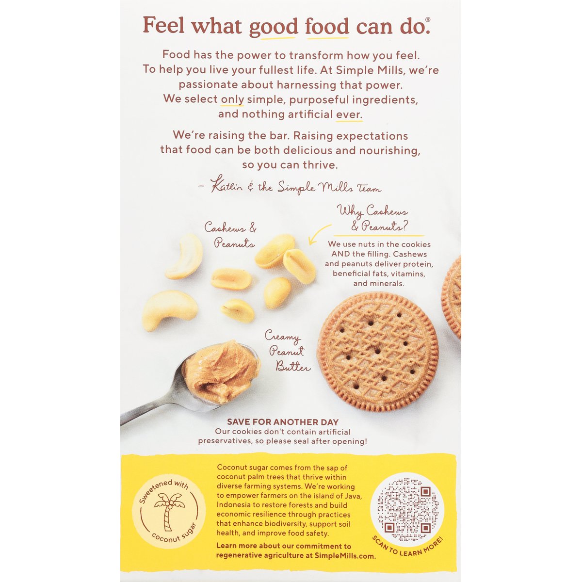 Sweetened with coconut sugar. Certified gluten free. Corn free. Gum free. Vegan Non-GMO Project verified. nongmoproject.org. Only purposeful ingredients. Nothing artificial ever. Feel what good food can do. Food has the power to transform how you feel. To help you live your fullest life. At Simple Mills, we're passionate about harnessing that power. We select only simple, purposeful ingredients, and nothing artificial ever. We're raising the bar. Raising expectations that food can be both delicious and nourishing, so you can thrive. - Katlin & the Simple Mills Team. Cashews & peanuts. Creamy peanut butter. Why cashews & peanuts? We use nuts in the cookies and the filling. Cashews and peanuts deliver protein, beneficial fats, vitamins, & minerals. Save or Another Day: Our cookies don't contain artificial preservatives, so please seal after opening! Sweetened with coconut sugar. SimpleMills.com. Scan to learn more! Learn more about our commitment to regenerative agriculture at SimpleMills.com. Get wellness tips and recipes (at)simplemills. Be friendly to the planet. Coconut sugar comes from the sap of coconut palm trees that thrive within diverse farming systems. We're working to empower farmers on the island of Java, Indonesia to restore forests and build economic resilience through practices that enhance biodiversity, support soil health, and improve food safety. Learn more about our commitment to regenerative agriculture at SimpleMills.com.