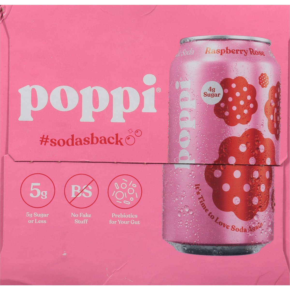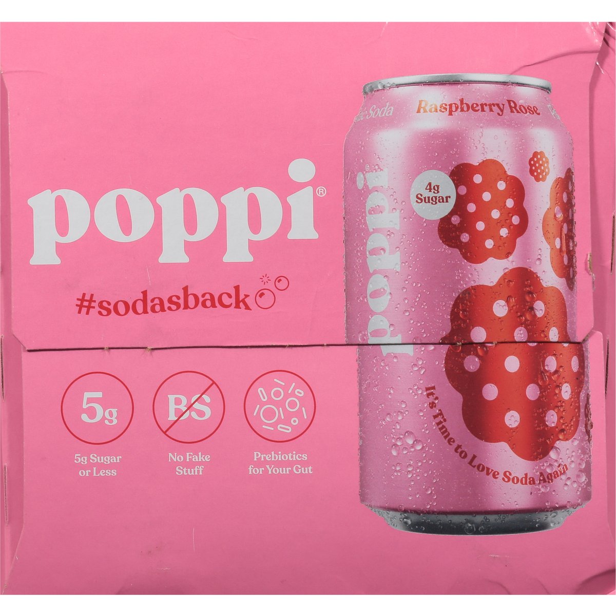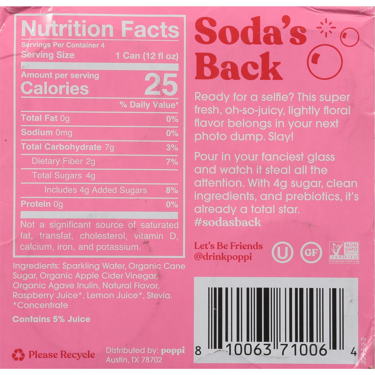 4 g sugar. 5 g sugar or less. Gluten free. Non-GMO Project verified. nongmoproject.org. It's time to love soda again. No fake stuff. Prebiotics for your gut. Soda's Back: Ready for a selfie? This super fresh, oh-so-juicy, lightly floral flavor belongs in your next photo dump. Slay! Pour in your fanciest glass and watch it steal all the attention. With 4 g sugar, clean ingredients, and prebiotics, it's already a total star. #sodasback. Let's be friends @drinkpoppi. Please recycle.