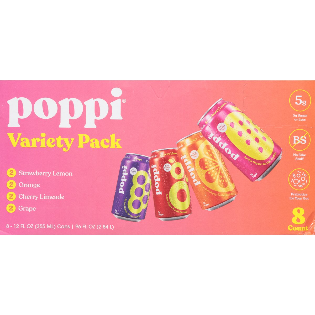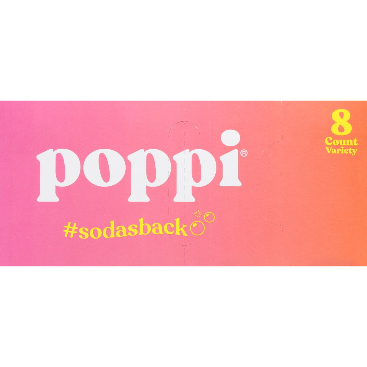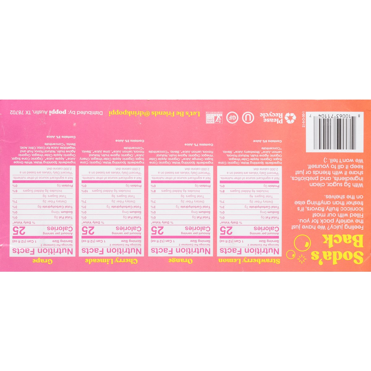 2 strawberry lemon. 2 orange. 2 cherry limeade. 2 grape. 5 g sugar or less. Gluten free. Strawberry Lemon/Orange/Cherry Limeade/Grape: Non-GMO Project verified. nongmoproject.org. No fake stuff. Prebiotics for your gut. Soda's Back: Feeling juicy? We have just the variety pack for you. Filled with our most iconiccc fruity flavors, it's fresher than anything else on the shelves. With 5 g sugar, clean ingredients, and prebiotics, share it with friends or just keep it all to yourself. We won't tell. ;). #sodasback. Let's be friends @drinkpoppi. Please recycle.
