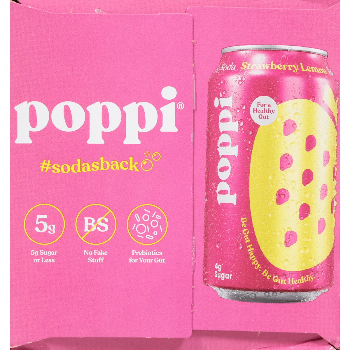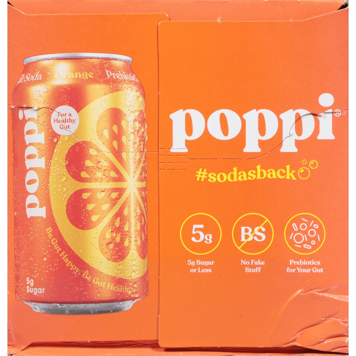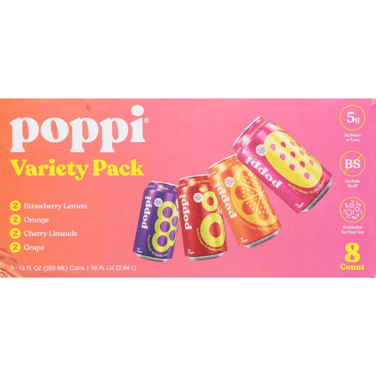 2 strawberry lemon. 2 orange. 2 cherry limeade. 2 grape. 5 g sugar or less. Gluten free. Strawberry Lemon/Orange/Cherry Limeade/Grape: Non-GMO Project verified. nongmoproject.org. No fake stuff. Prebiotics for your gut. Soda's Back: Feeling juicy? We have just the variety pack for you. Filled with our most iconiccc fruity flavors, it's fresher than anything else on the shelves. With 5 g sugar, clean ingredients, and prebiotics, share it with friends or just keep it all to yourself. We won't tell. ;). #sodasback. Let's be friends @drinkpoppi. Please recycle.