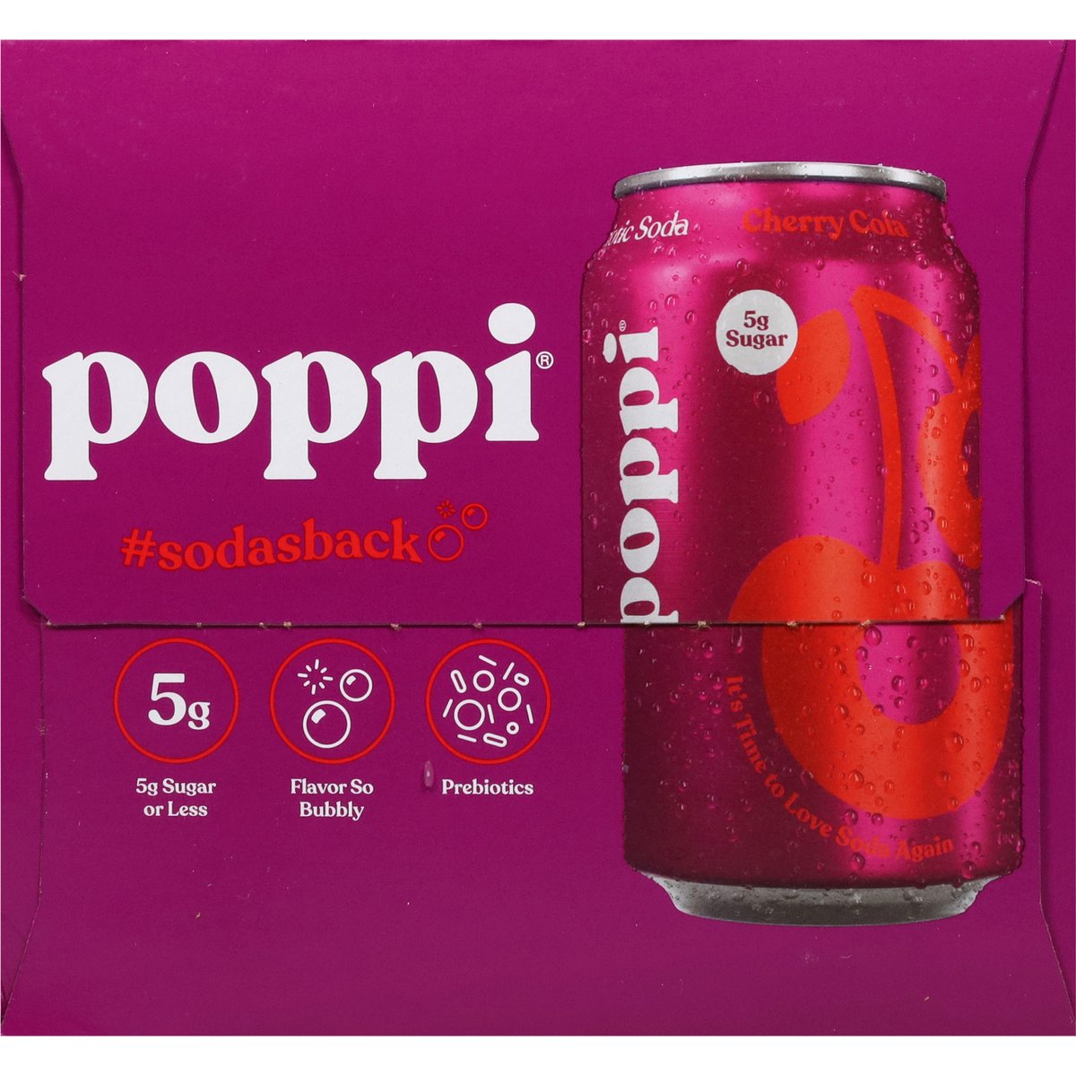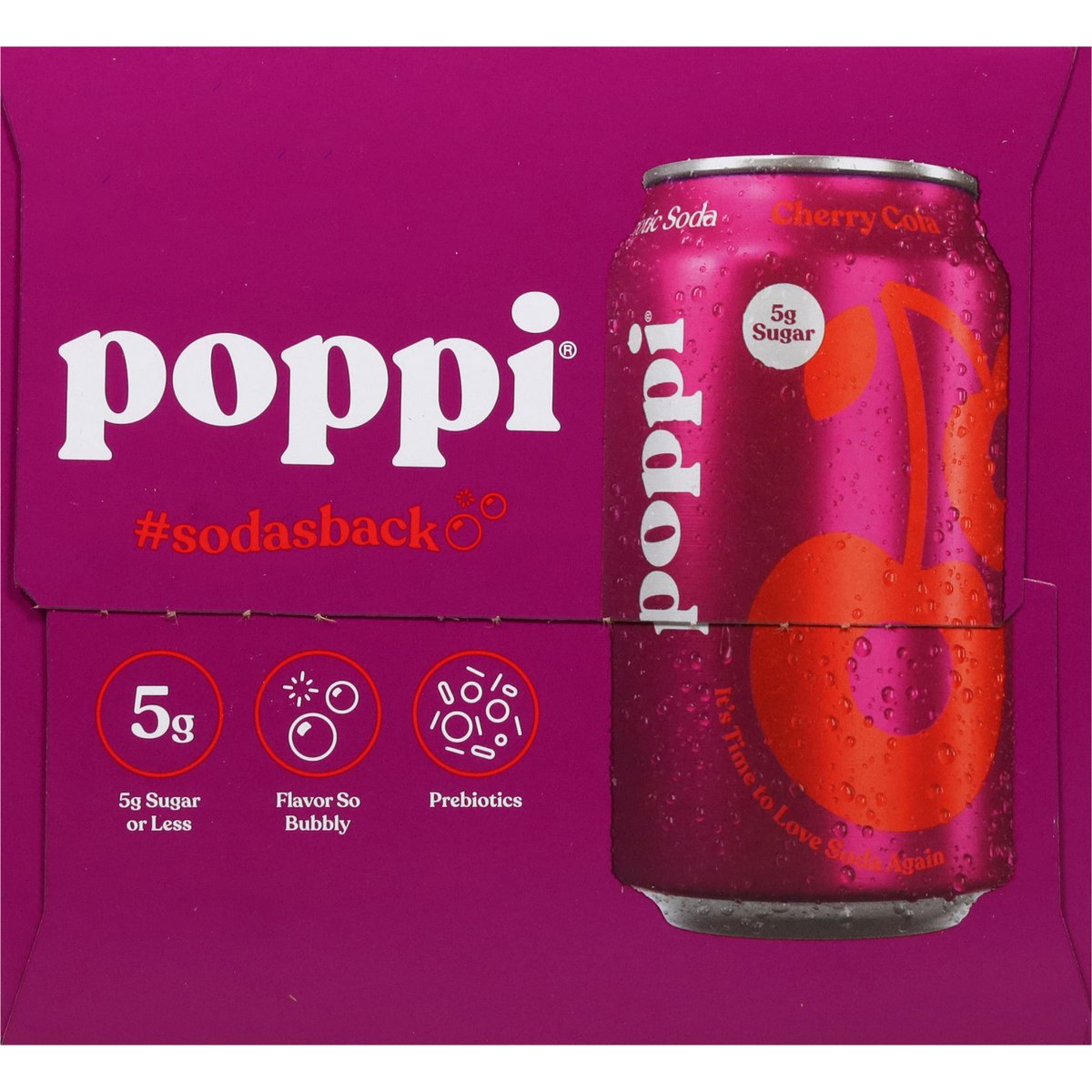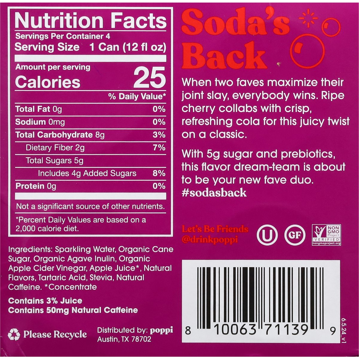 5 g sugar. 5 g sugar or less. Gluten free. Contains 50 mg natural caffeine. Non-GMO Project verified. nongmoproject.org. It's time to love soda again. Flavors so bubbly. Prebiotics. Soda's back. When two faves maximize their joint slay, everybody wins. Ripe cherry collabs with crisp, refreshing cola for this juicy twist on a classic. With 5 g sugar and prebiotics, this flavor dream-team is about to be your new fave duo. #sodasback. Let's be friends @drinkpoppi. Please recycle.