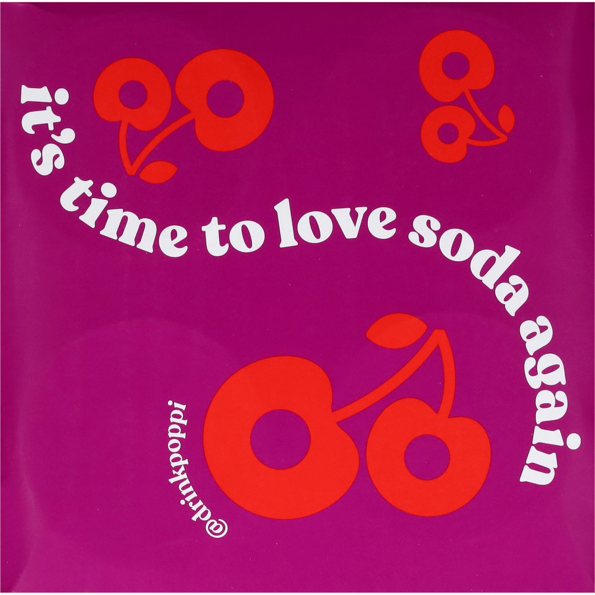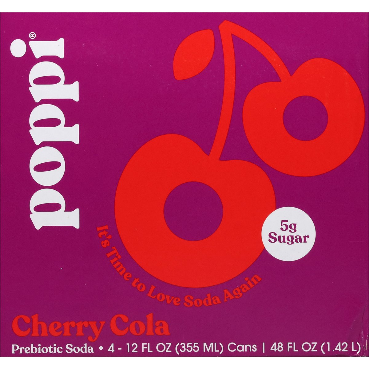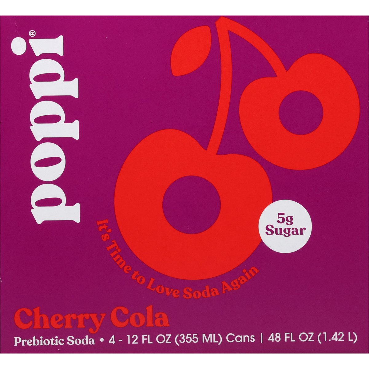 5 g sugar. 5 g sugar or less. Gluten free. Contains 50 mg natural caffeine. Non-GMO Project verified. nongmoproject.org. It's time to love soda again. Flavors so bubbly. Prebiotics. Soda's back. When two faves maximize their joint slay, everybody wins. Ripe cherry collabs with crisp, refreshing cola for this juicy twist on a classic. With 5 g sugar and prebiotics, this flavor dream-team is about to be your new fave duo. #sodasback. Let's be friends @drinkpoppi. Please recycle.