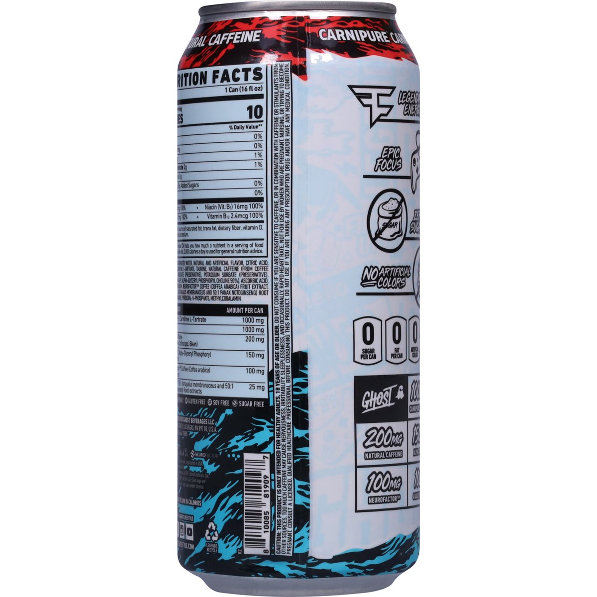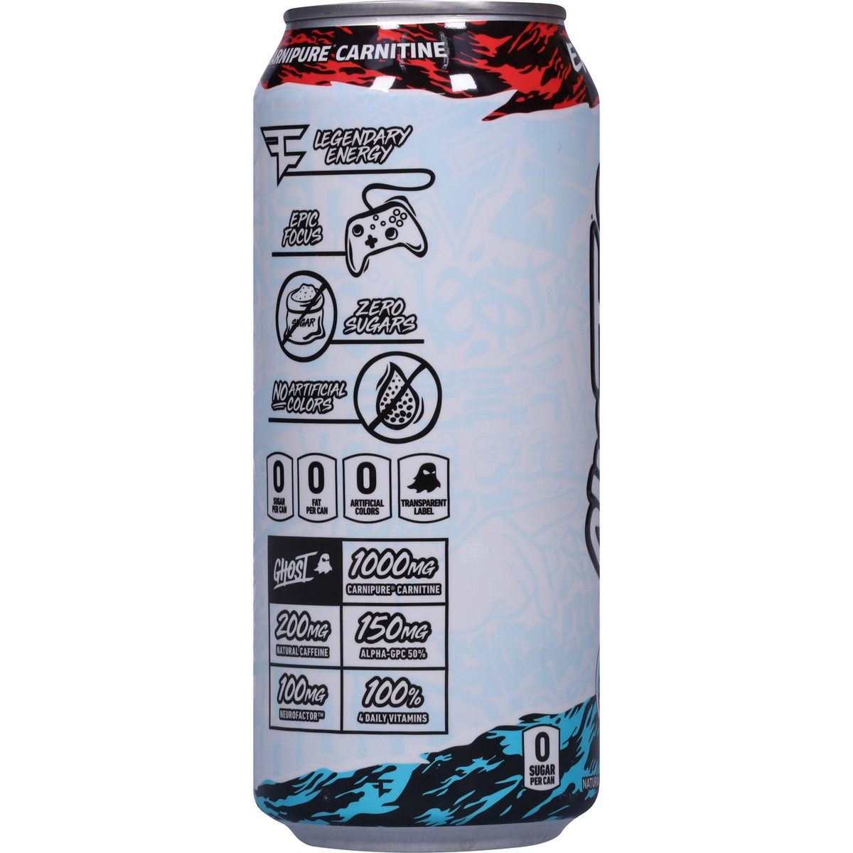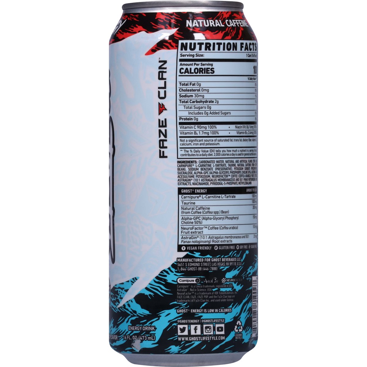 Natural & artificial flavor. 0 sugar per can. 0 fat per can. 0 Artificial colors. 1000 mg carnipure carnitine. 150 mg alpha-gpc 50%. 100 mg neurofactor. 100% 4 daily vitamins. Zero sugar. Vegan friendly. Gluten free. Soy free. Sugar free. Zero sugar. 200 mg Natural caffeine. Natural Caffeine. Ghost energy is low in calories. Ghost Energy: Carnipure L-Carnitine L-Tartrate - Amount Per Can: 1000 mg; Ghost Energy: Taurine - Amount Per Can: 1000 mg; Ghost Energy: Natural Caffeine (from Coffee (Coffea spp.) Bean) - Amount Per Can: 200 mg; Ghost Energy: Alpha-GPC (Alpha-Glyceryl Phosphoryl Choline 50%) - Amount Per Can: 150 mg; Ghost Energy: NeuroFactor Coffee (Coffea arabica) Fruit extract - Amount Per Can: 100 mg; Ghost Energy: AstraGin (10:1 Astragalus membranaceus and 50:1 Panax notoginseng) Root Extracts - Amount Per Can: 25 mg. Carnipure carnitine. Legendary energy. Epic focus. No artificial colors. Transparent label. Faze clan. Camlpure. Neuro factor. www.ghostlifestyle.com. (at)ghostenergy. (at)ghostlifestyle. Twitter. Facebook. Instagram. YouTube. Legends recycle.