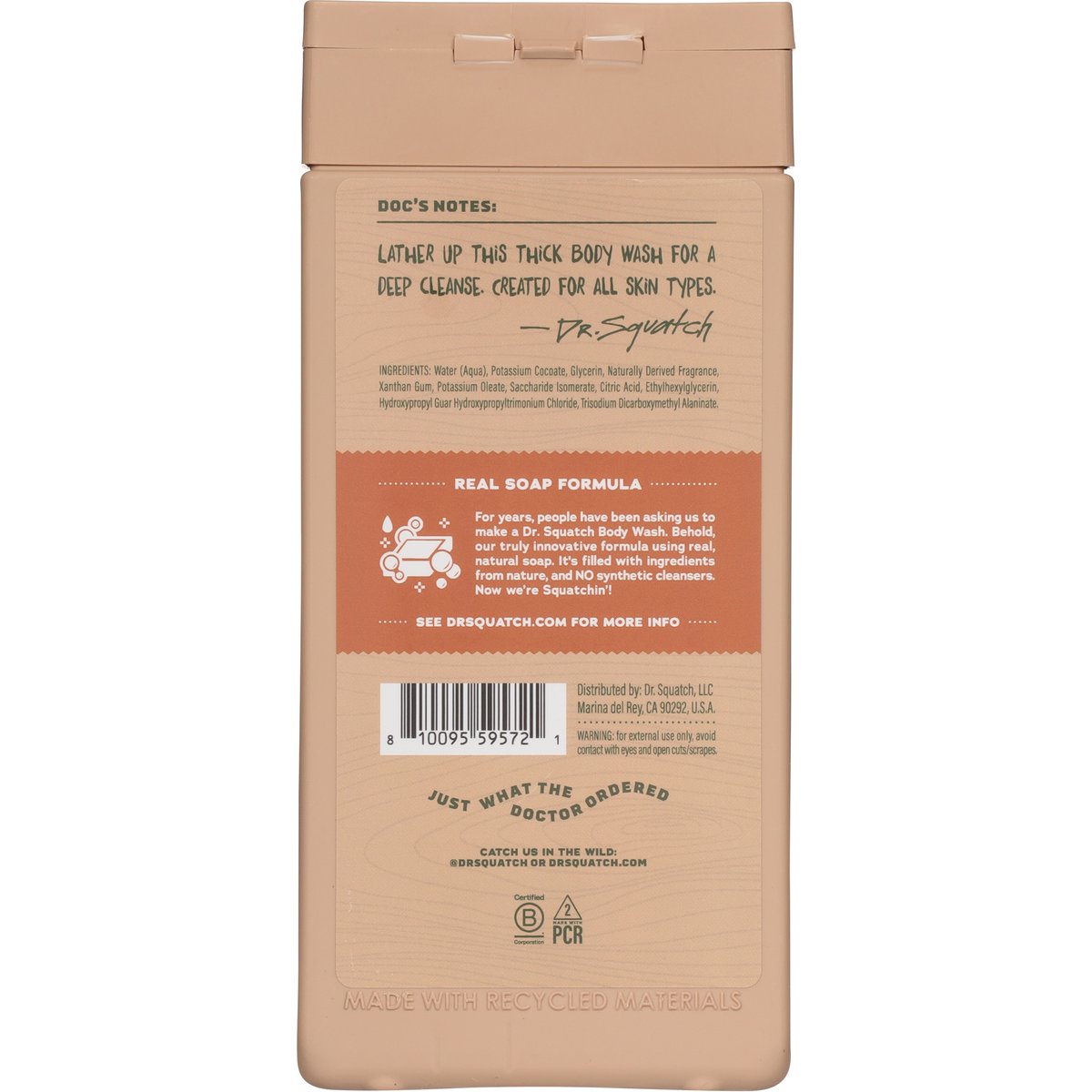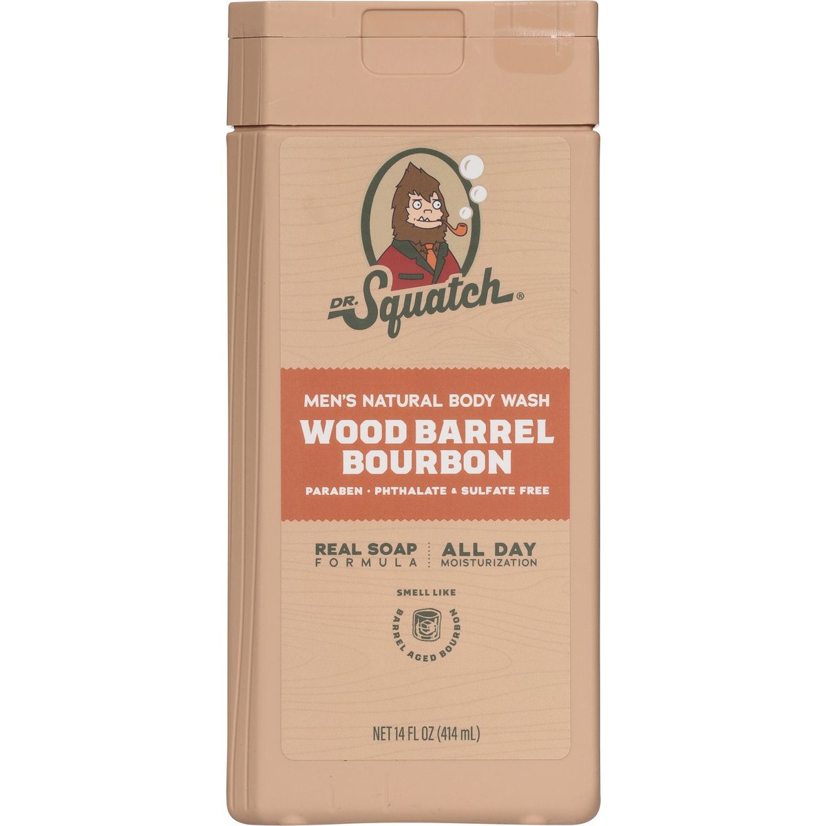 Men's natural body wash. Paraben. Phthalate. Sulfate free. Real soap formula. All day moisturization. Smell like barrel aged bourbon. Doc's Notes: Lather up this thick body wash for a deep cleanse. Created for all skin types.- Dr. Squatch. Real Soap Formula: For years, people have been asking us to make a Dr. Squatch Body Wash. Behold, our truly innovative formula using real, natural soap. It's filled with ingredients from nature, and no synthetic cleansers. Now we're Squatchin'! Just what the doctor ordered. drsquatch.com. Catch us in the Wild: @drsquatch or drsquatch.com. See drsquatch.com for more info. Certified B Corporation. Made with PCR. Made with recycled materials.
