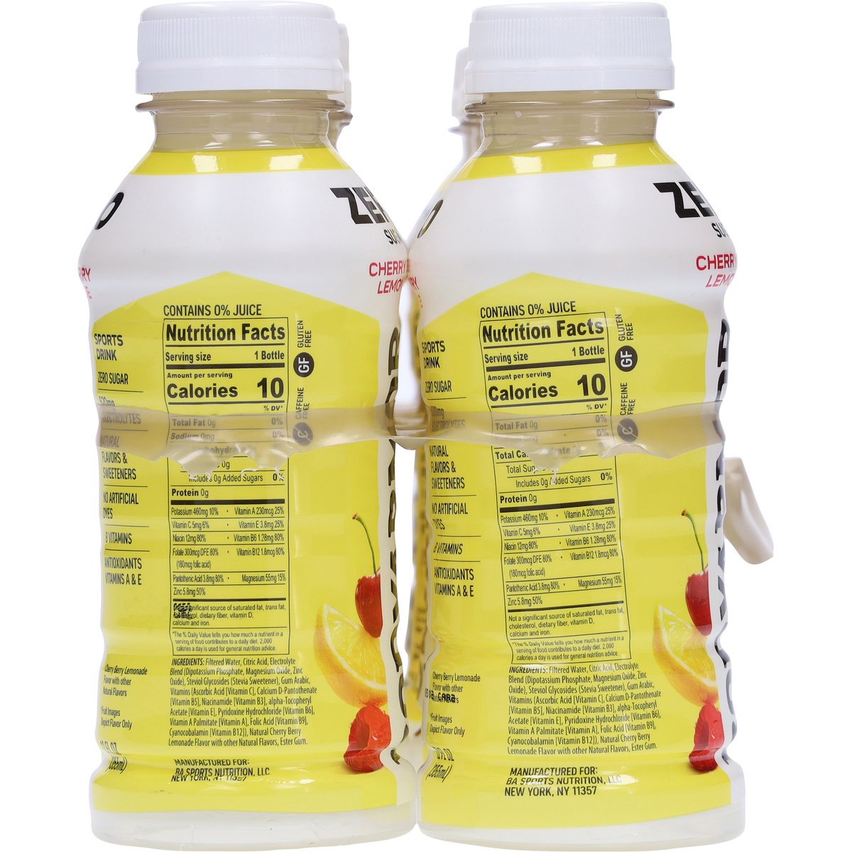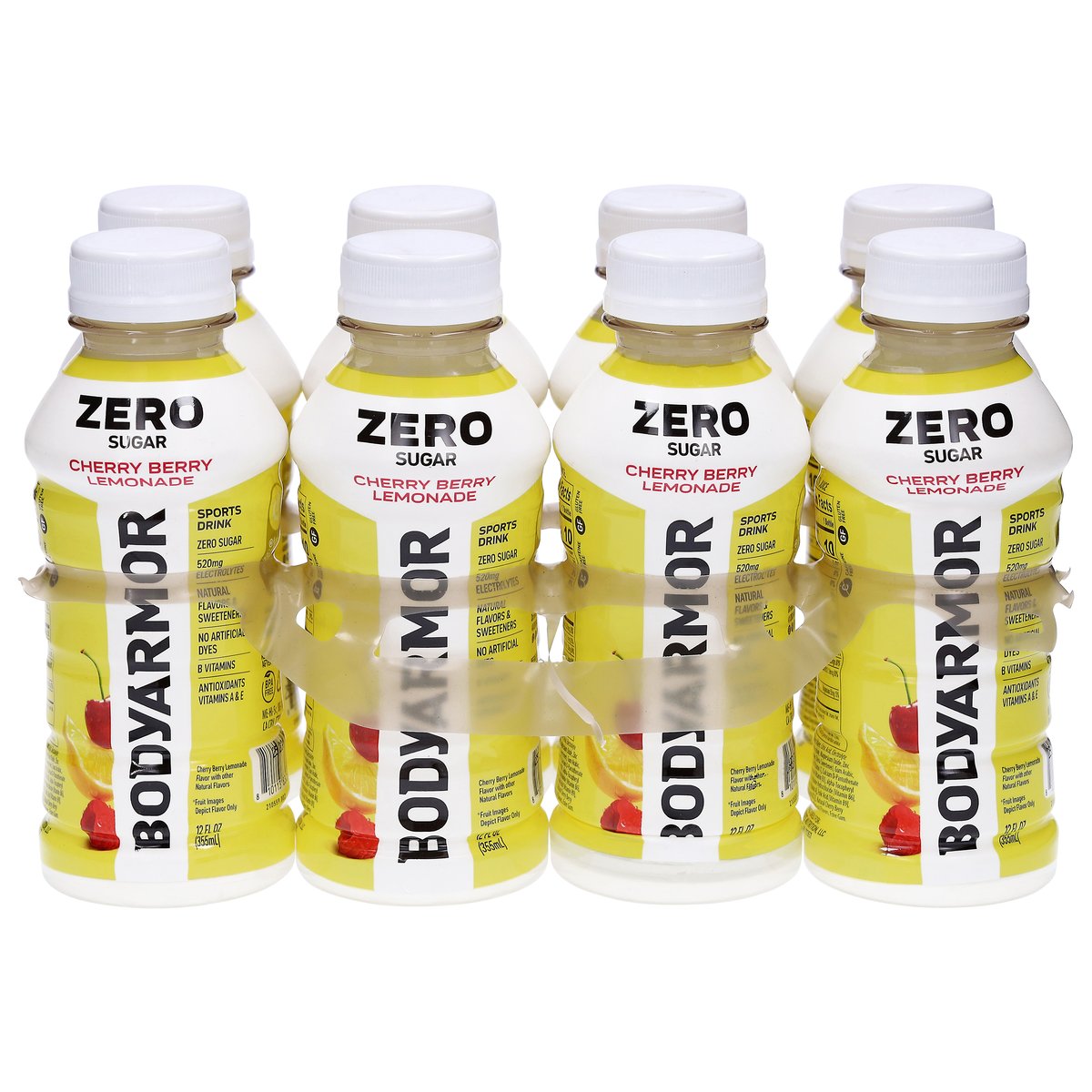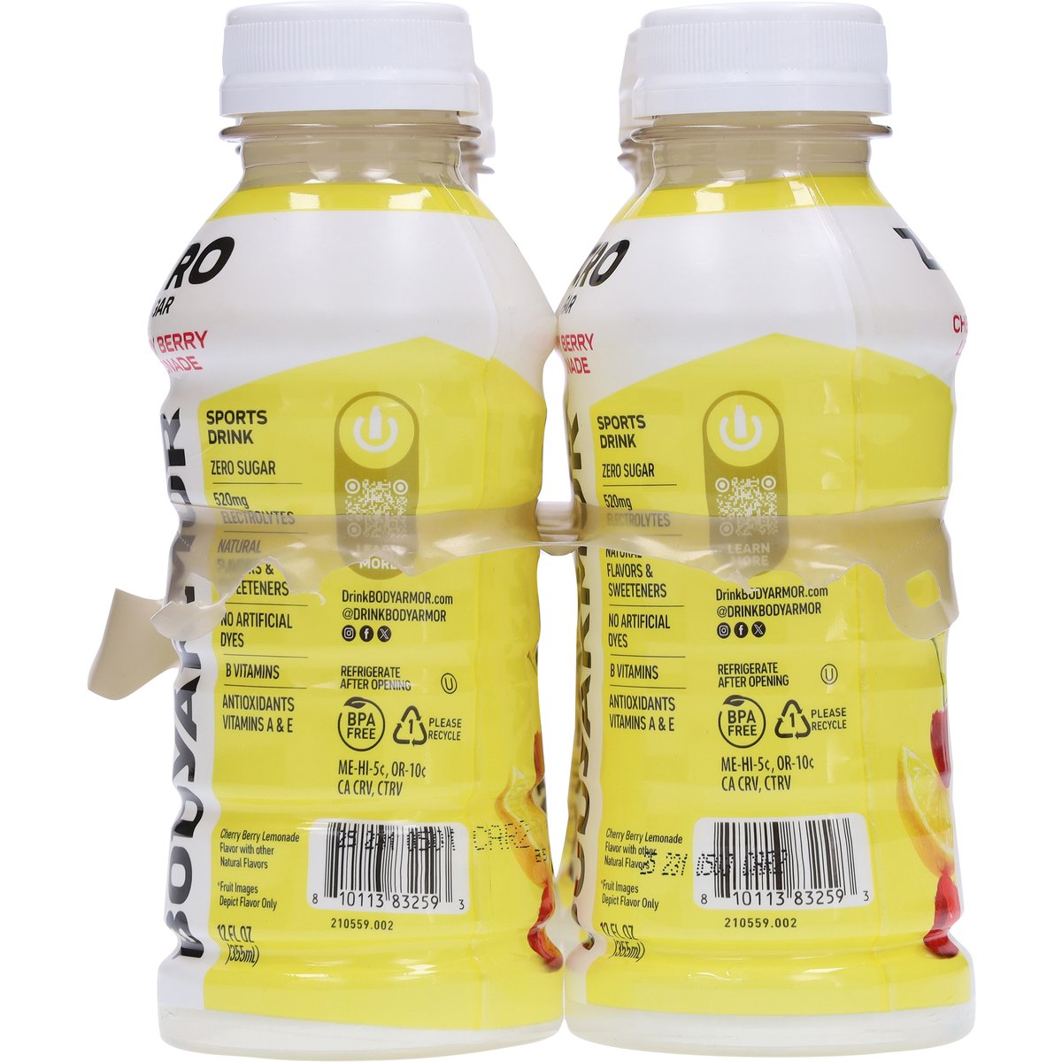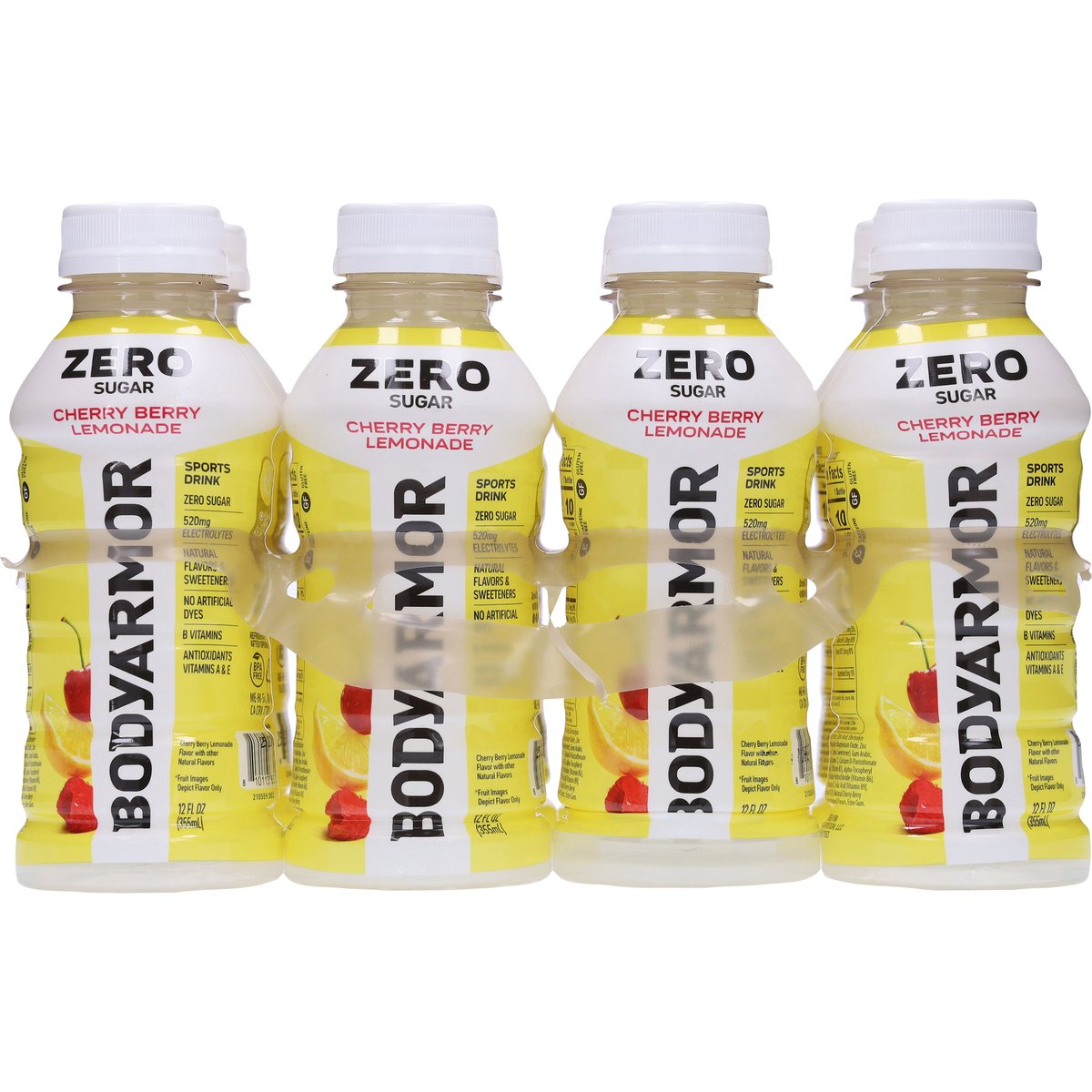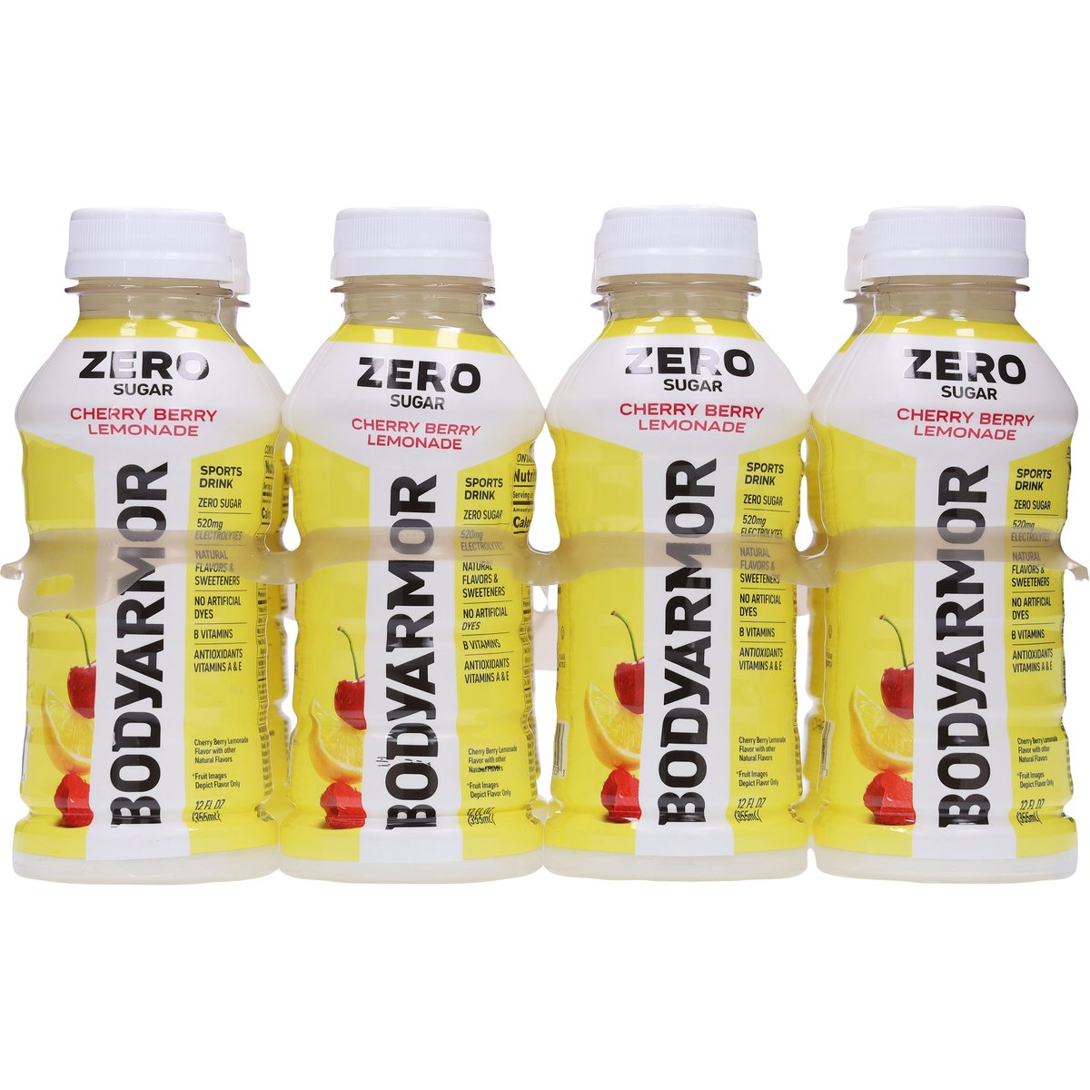 Cherry berry lemonade flavor with other natural flavors. Natural flavors & sweeteners. 520 mg electrolytes. Zero sugar. Gluten free. Caffeine free. B vitamins. Antioxidants vitamins A & E. Sports drink. No artificial dyes. drinkbodyarmor.com. Learn more. @drinkbodyarmor. Instagram. Facebook. Twitter. BPA free. Please recycle.