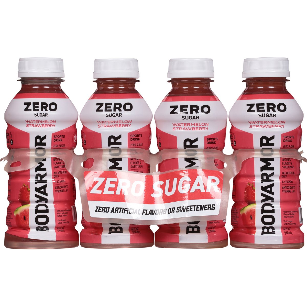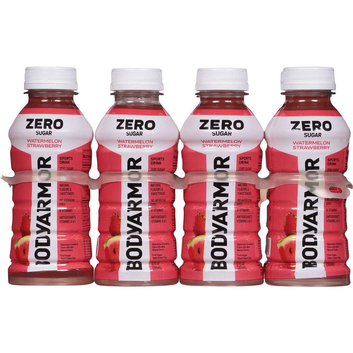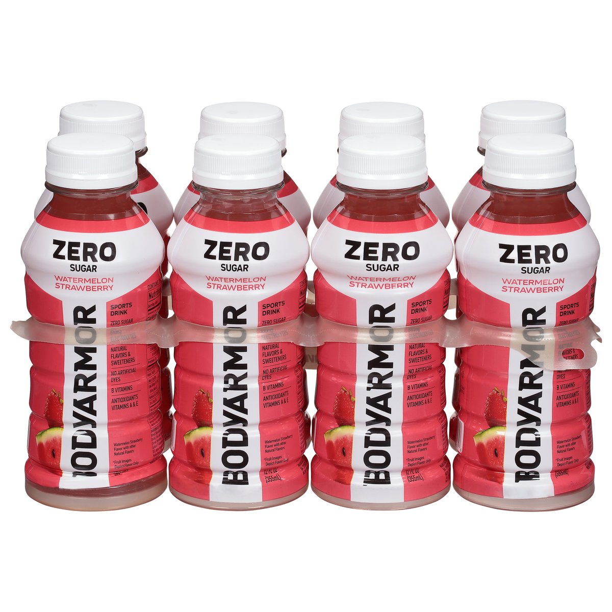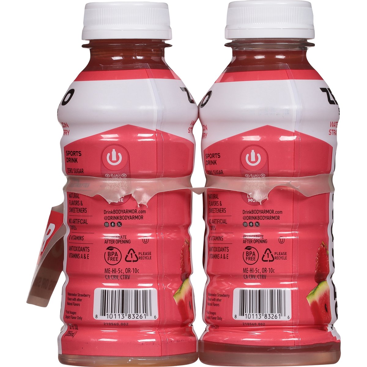 Watermelon strawberry flavored with other natural flavors. Zero artificial flavors or sweeteners. Natural flavors and sweeteners. Zero sugar. Gluten free. Caffeine free. B Vitamins. Antioxidants: Vitamins A & E. No artificial dyes. drinkbodyarmor.com. Instagram. Facebook. Twitter. @drinkbodyarmor. BPA free. Please recycle.