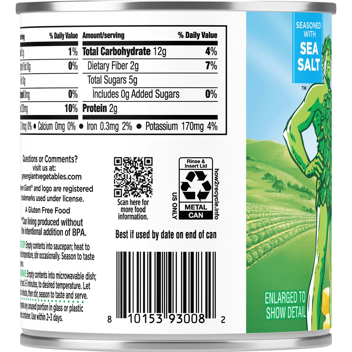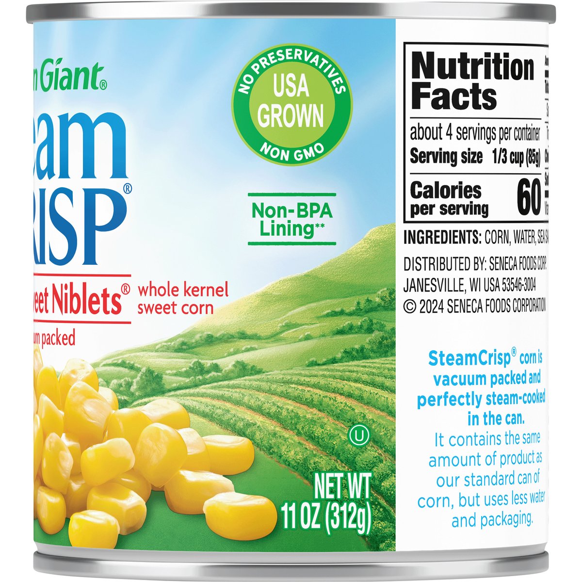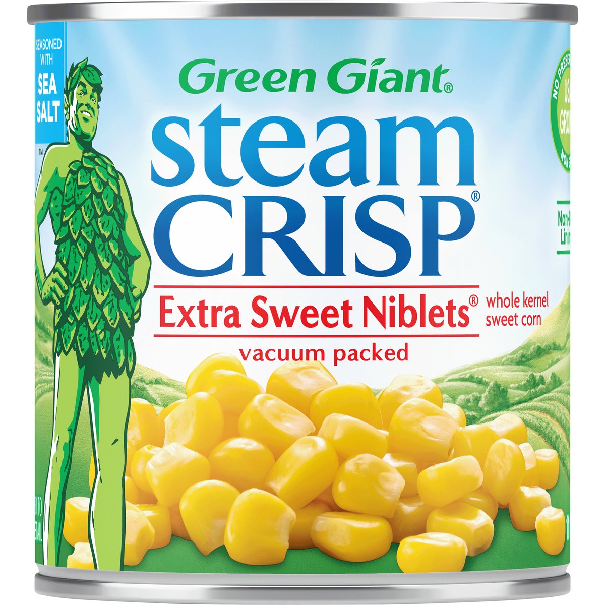 Seasoned with sea salt. Whole kernel sweet corn. A gluten free food. Non GMO. No preservatives. SteamCrisp corn is vacuum packed and perfectly steam-cooked in the can. It contains the same amount of product as our standard can of corn, but used less water and packaging. greengiantvegetables.com. how2recycle.info. Scan for more food information. Questions or comments? Visit us at: greengiantvegetables.com. Non-BPA lining**. ** Can lining produced without the intentional addition of BPA. USA grown.