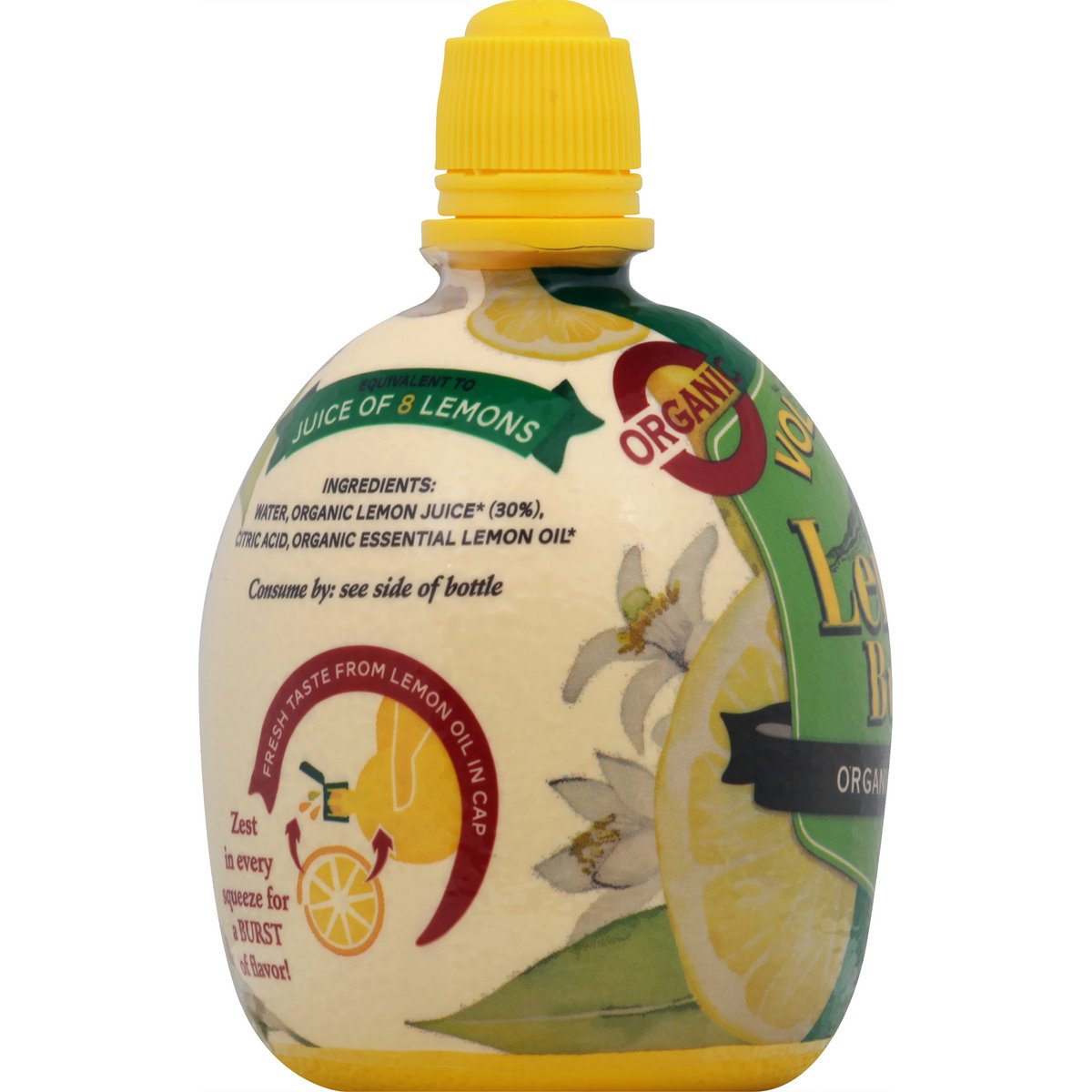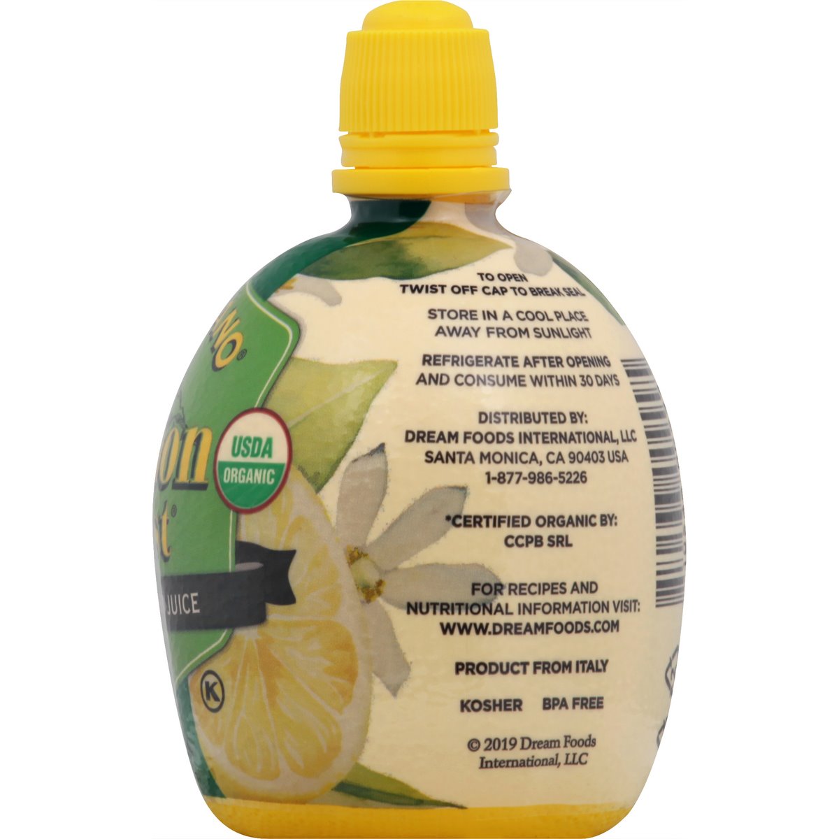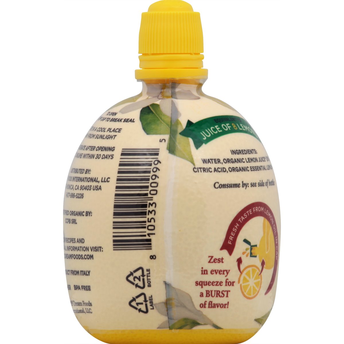 Organic. USDA Organic. Certified Organic by: CCPB SRL. Never from concentrate! Equivalent to juice of 8 lemons. Fresh taste from lemon oil in cap. Zest in every squeeze for a burst of flavor! Food safe. www.dreamfoods.com. For recipes and nutritional information visit: www.dreamfoods.com. BPA free. Product from Italy.