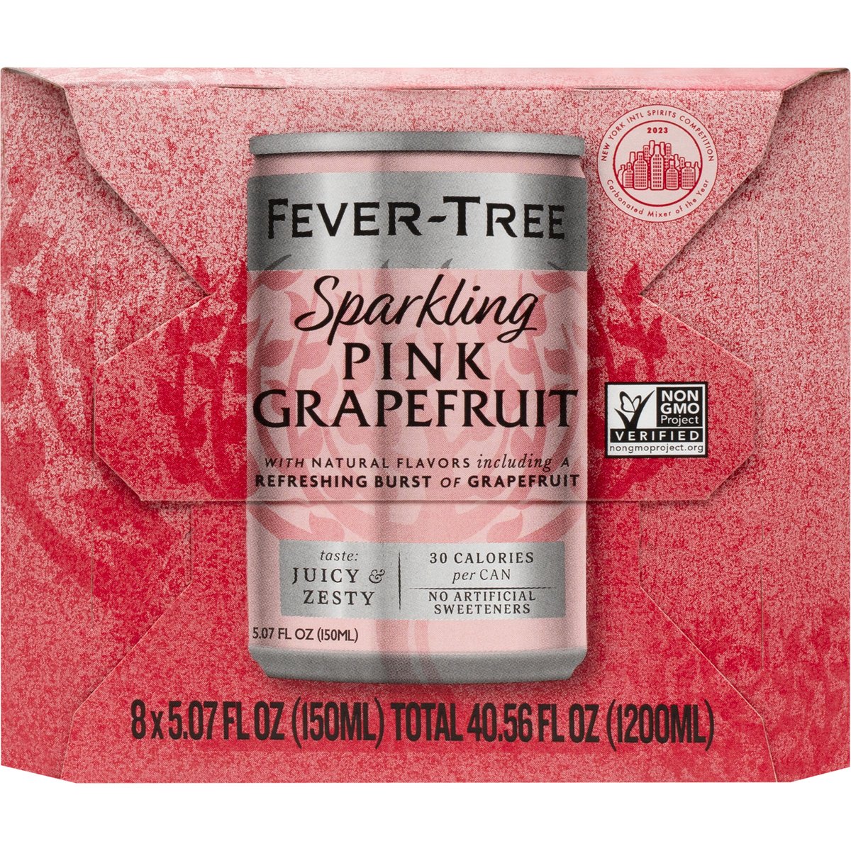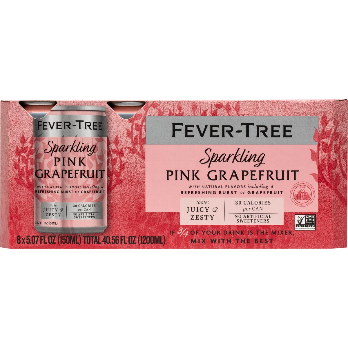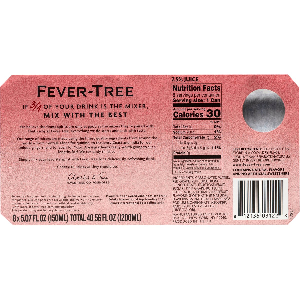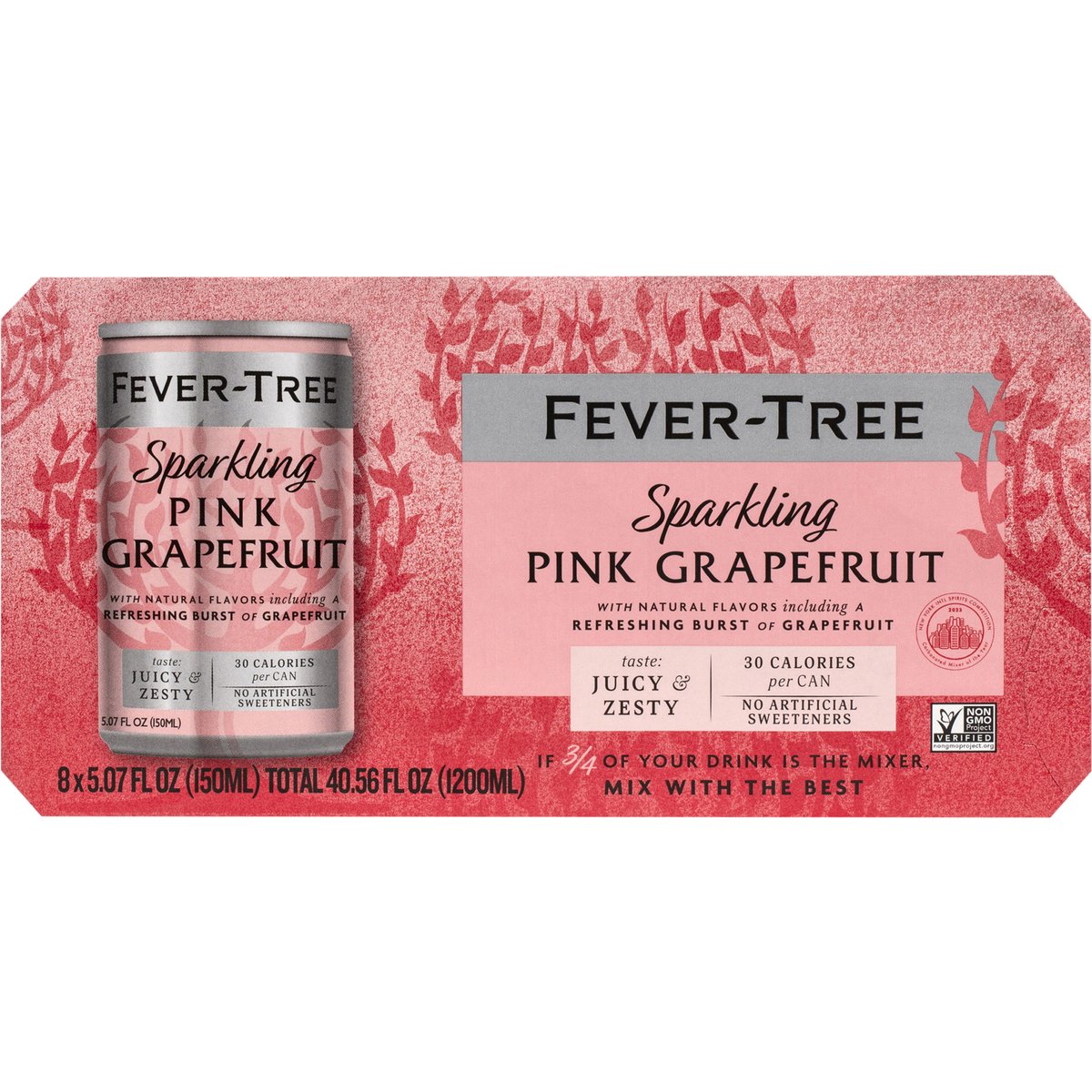Sparkling pink grapefruit with natural flavors including a refreshing burst of grapefruit. 30 calories per can. Non-GMO Project verified. nongmoproject.org. Taste: Juicy & zesty. No artificial sweeteners. If 3/4 of your drink is the mixer, mix with the best. We believe the finest spirits are only as good as the mixers they're paired with. That's why at Fever-Tree, everything we do starts and ends with taste. Our range of mixers are made using the finest quality ingredients from around the world - from Central Africa for quinine, to the Ivory Coast and India for our unique gingers, and to Japan for Yuzu. Are ingredients really worth going to such lengths for? We certainly think so. Simply mix your favorite spirit with Fever-Tree for a deliciously, refreshing drink. Cheers; to drinks as they should be. - Charles & Tim, Fever-tree Co-founders. www.fever-tree.com. New York Intl Spirits Competition Carbonated Mixer of the year 2023. Proud to be an award winning mixer brand: Drinks international top trending 2023. Drinks international best selling 2023. Fever-tree is committed to minimizing the impact we have on the planet. Our can packs are recyclable and we work to ensure our ingredients are sourced in an ethical, sustainable way. Learn more at fever-tree.com/sustainability. This product may not be recyclable in your area. Produced in the U.K.