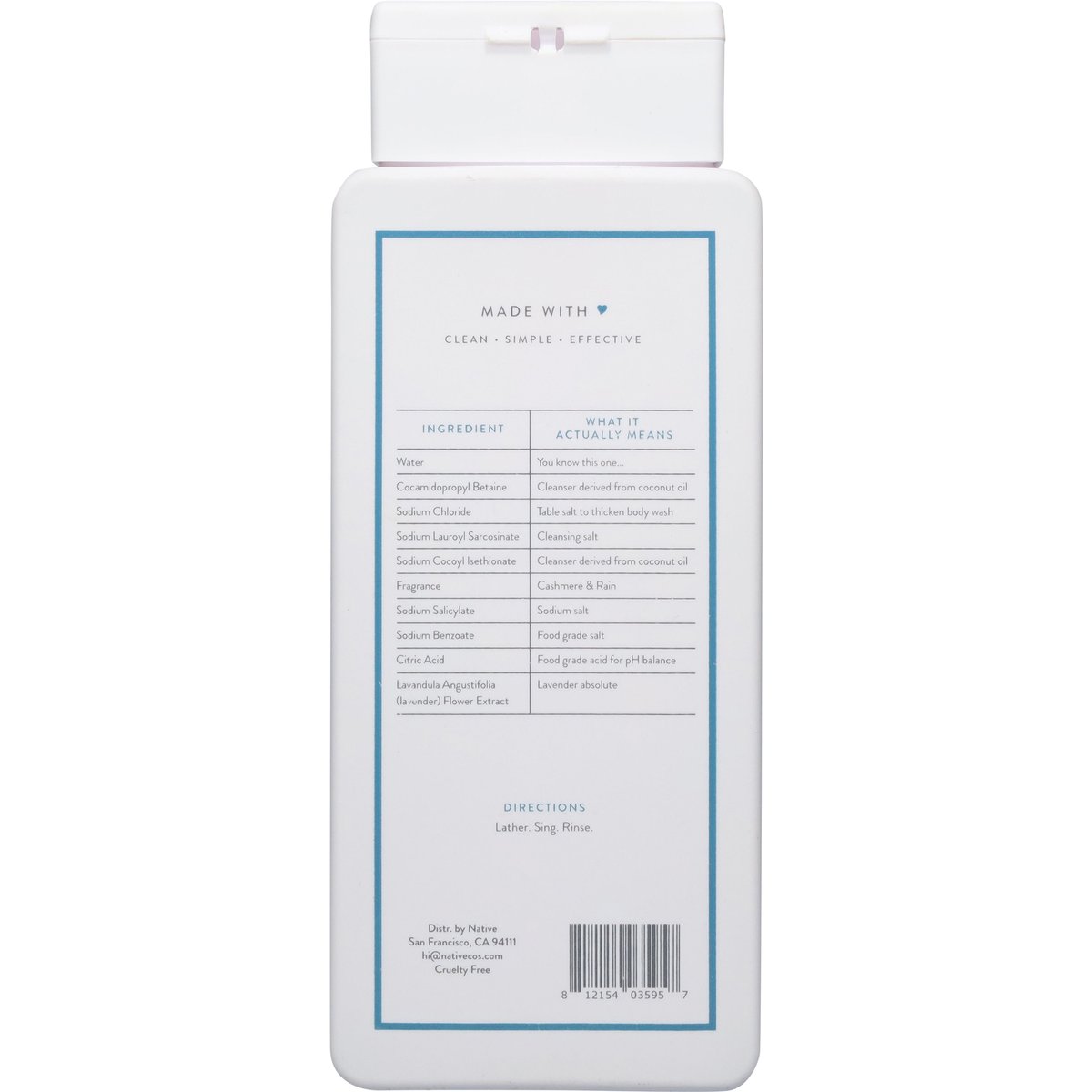 Sulfate free. Paraben free. Dye free. Phthalate free. Made with love. Clean. Simple. Effective. Formulated without sulfated surfactants. hi@nativecos.com. Cruelty free.