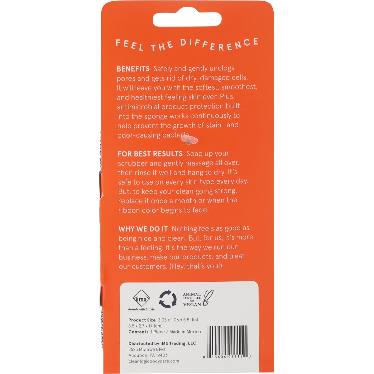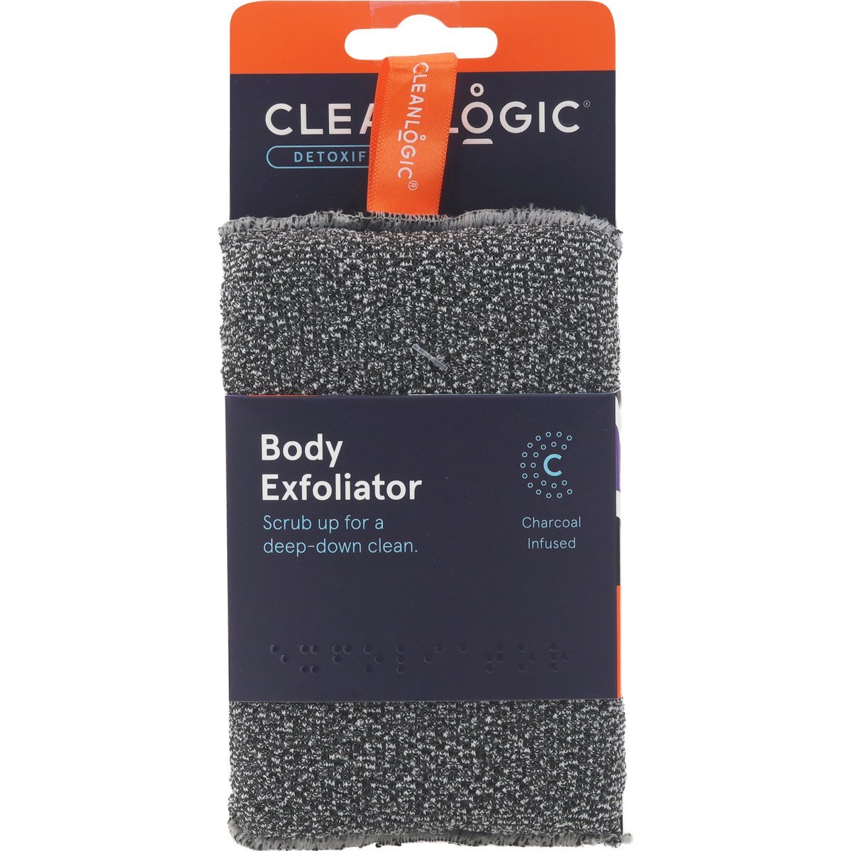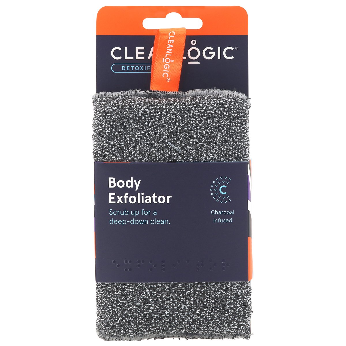 Product Size: 3.35 x 1.06 x 5.51 (in) 8.5 x 2.7 x 14 (cm). Contents 1 piece. Vegan. Scrub up for a deep-down clean. Charcoal infused. Feel the difference. Benefits: Safely and gently unclogs pores and gets rid of dry, damaged cells. It will leave you with the softest, smoothest, and healthiest feeling skin ever. Plus, antimicrobial product protection built into the sponge works continuously to help prevent the growth of stain- and odor-causing bacteria. Why We Do It: Nothing feels as good as being nice and clean. But, for us, it's more than a feeling. It's the way we run our business, make our products, and treat our customers. (Hey, that's you!). Brands with Braille. cleanlogicbodycare.com. PETA. Animal test-free. Made in Mexico.