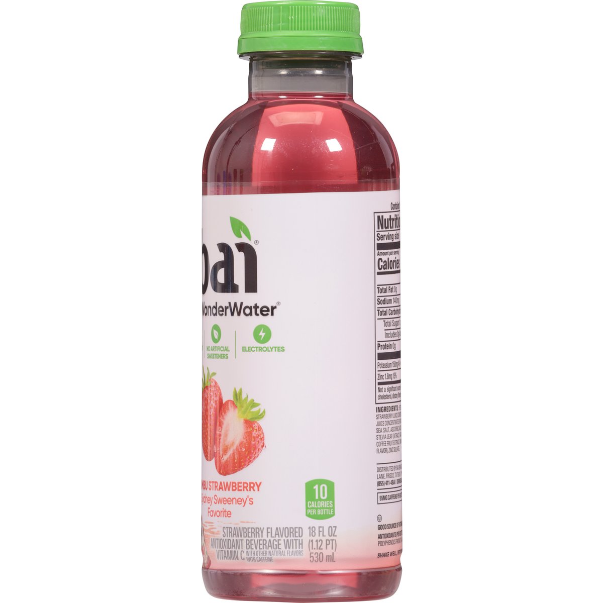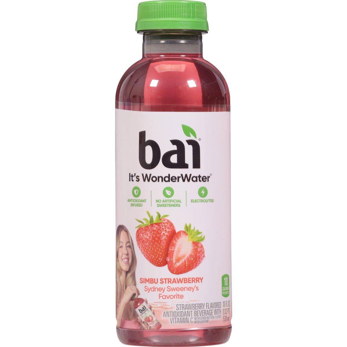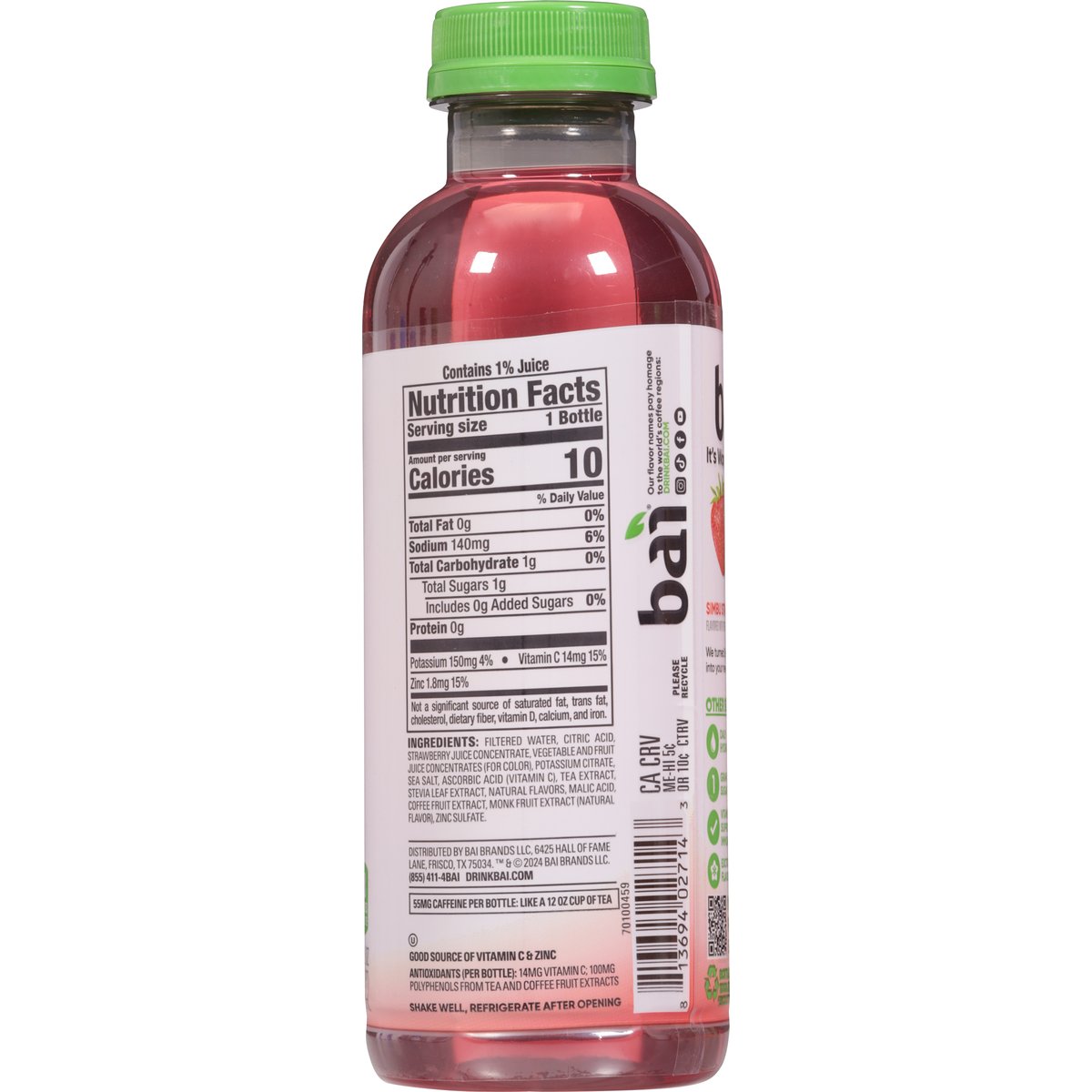 Strawberry flavored. Antioxidant beverage with vitamin C. With other natural flavors. Flavored with other natural flavors. 10 calories per bottle. 1 gram of sugar. 55 g caffeine per bottle: Like a 12 oz cup of tea. Antioxidants (Per Bottle): 14 mg vitamin C; 100 mg polyphenols from tea and coffee fruit extracts. With caffeine. Good source of vitamin C & zinc. It's WonderWater. Antioxidant infused. No artificial sweeteners, Electrolytes. We turned Sydney's favorite flavor into your new hydration obsession. Other Benefits: Daily hydration; Vitamin C & zinc help support a healthy immune system; Exotic flavors. drinkbai.com. Our flavor names pay homage to the world's coffee regions: drinkbai.com. Instagram. TikTok. Facebook. YouTube. (855) 411-4BAI. Bottle made from 100% recycled plastic^. ^Excludes cap and label. Please recycle.
