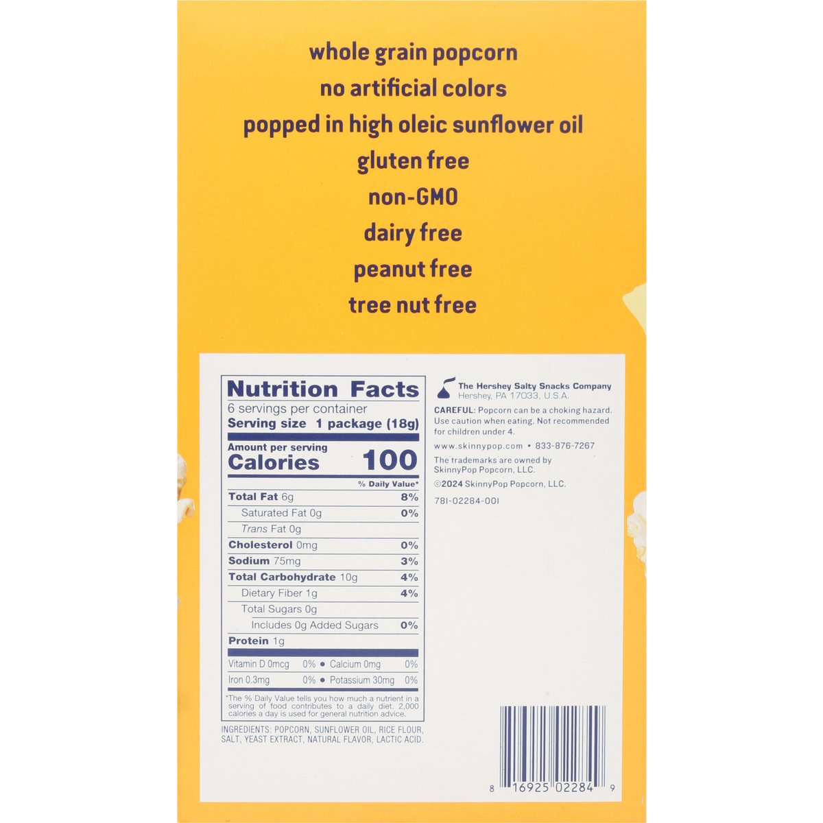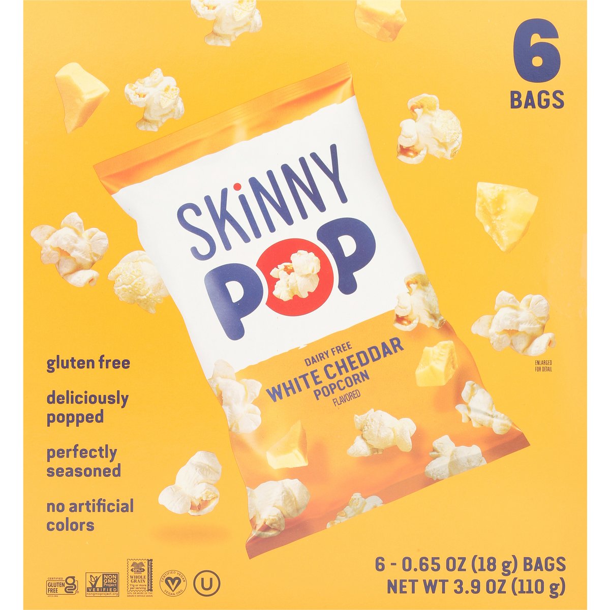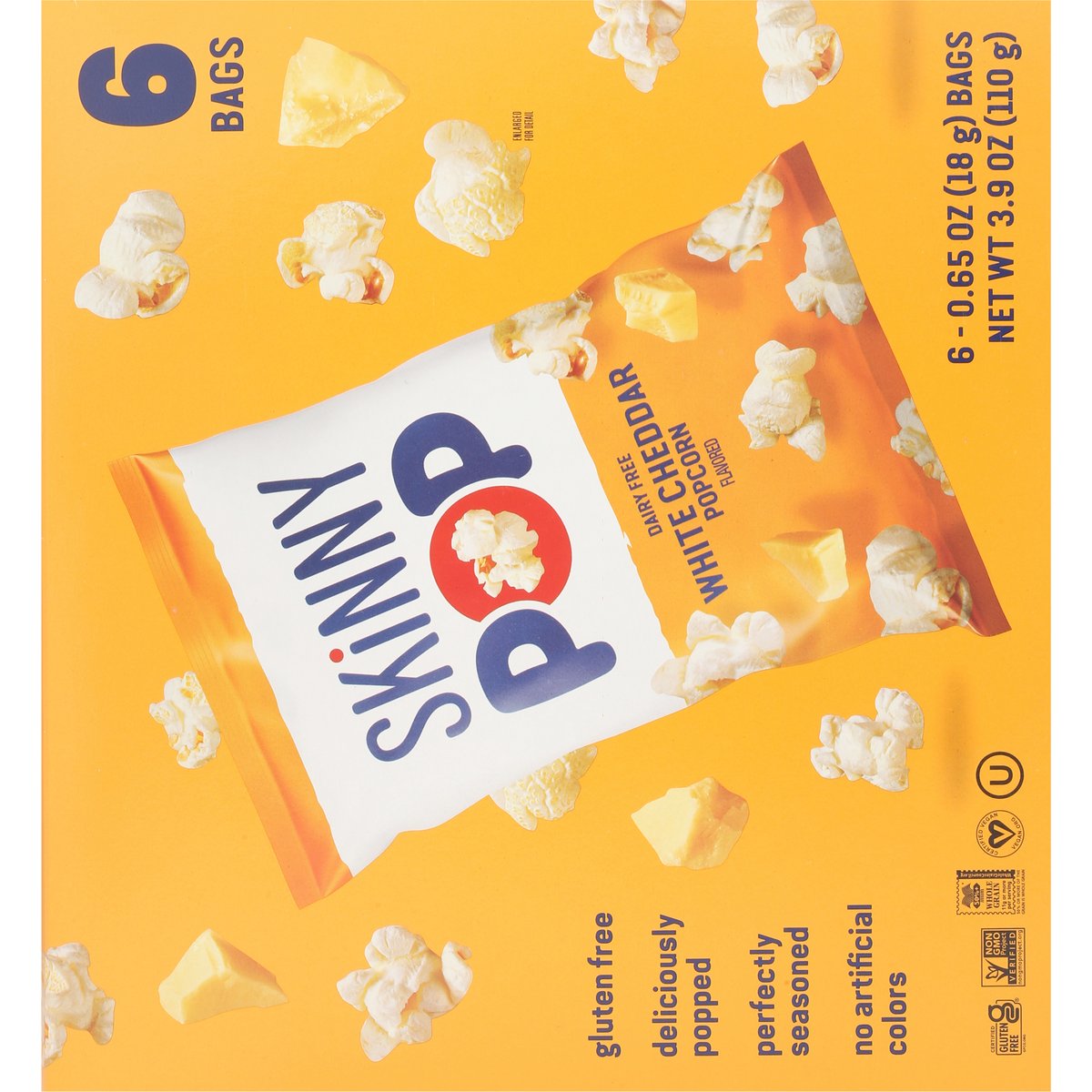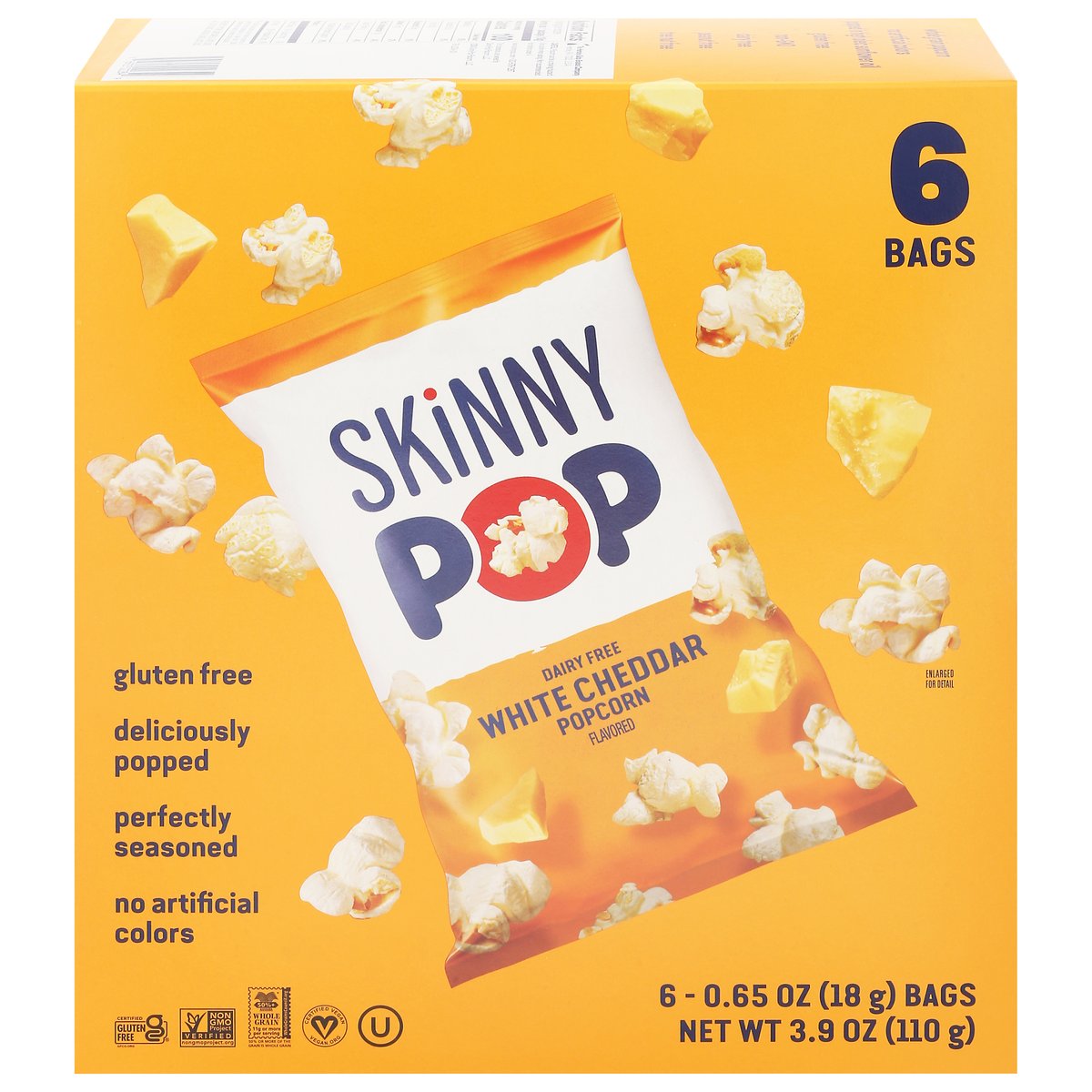 Gluten free. Certified gluten free. gfco.org. Certified vegan. Vegan.org. gfco.org. +50% Whole Grain: 11 g or more per serving. 50% whole grain or more per serving. wholegrainscouncil.org. Tree nut free. Dairy free. Peanut free. Whole grain popcorn. Non-GMO Project verified. nongmoproject.org. Deliciously popped. Perfectly seasoned. No artificial colors. Whole grain popcorn. Popped in high oleic sunflower oil. www.skinnypop.com. 833-876-7267.