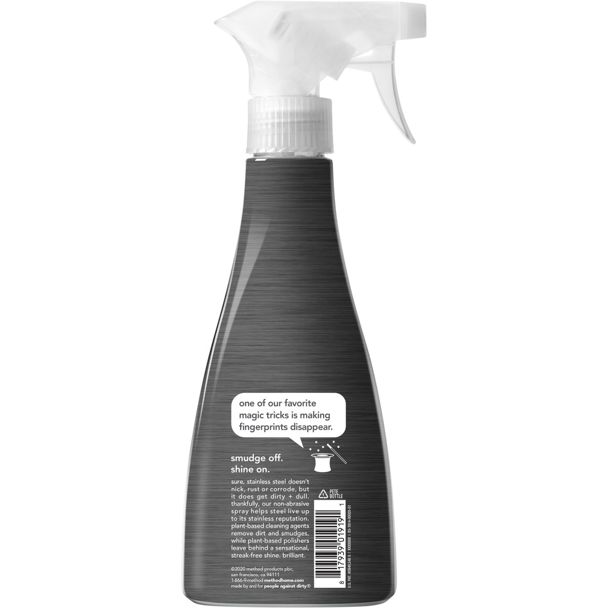 With plant-based polishing power. Cleans away fingerprints + leaves a shine. One of our favorite magic tricks is making fingerprints disappear. Smudge off. Shine on. Sure, stainless steel doesn't nick, rust on corrode, but it does get dirty + dull, thankfully, our non-abrasive spray helps steel live up to its stainless reputations. Plant-based cleaning agents remove dirt and smudges, while plant-based polishers leave behind a sensational, streak-free shine. brilliant. Made by and for people against dirty. Refrigerators. Dishwashers. Stoves. methodhome.com. For more Details go to methodhome.com/ingredients. We have more laundry, cleaning + hand soap at methodhome.com. Bottle (minus nozzle) made from 100% recycled plastic (PCR). Cruelty free. Tested by people, not on animals. Recycled for good karma.