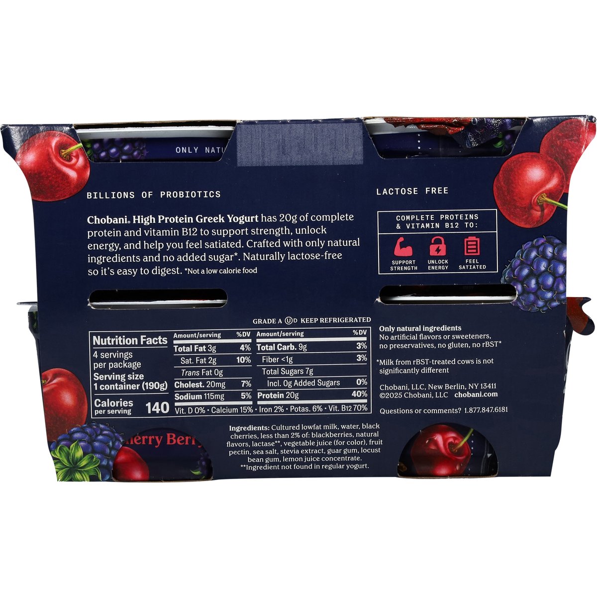 20 g protein. Lactose free. Zero added sugar*. * Not a low calorie food. Only natural ingredients. Billions of probiotics. Chobani. High Protein Greek Yogurt has 20 g of complete protein and vitamin B12 to support strength, unlock energy, and help you feel satiated. Crafted with only natural ingredients and no added sugar*. Naturally lactose-free so it's easy to digest. Complete Proteins & Vitamin B12 to: Support strength; Unlock energy; Feel satiated. No artificial flavors or sweeteners, no preservatives, no gluten, no rBST*. * Milk from rBST-treated cows is not significantly different. * Not a low calorie food. Grade A. chobani.com. Questions or comments? 1.877.847.6181. Certified 100% recycled paperboard.