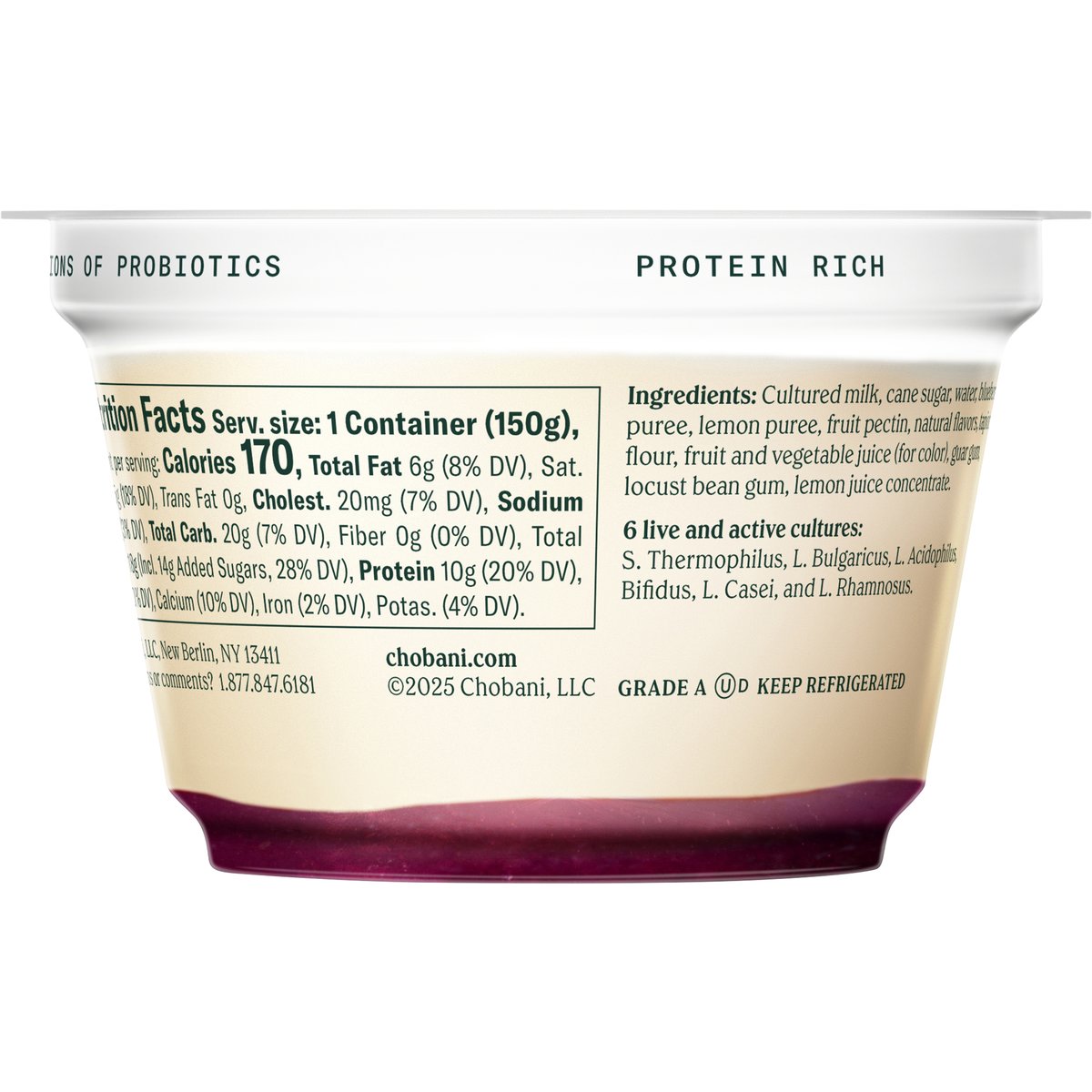 Flavored with other natural flavors. Billions of probiotics. Protein rich. Grade A. chobani.com. Questions or comments? 1.877.847.6181. Tear off label and recycle cup.