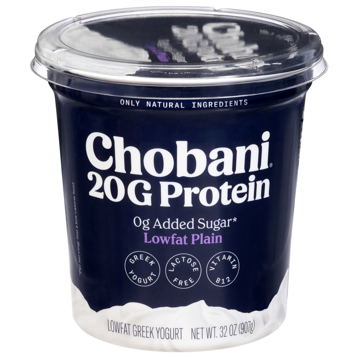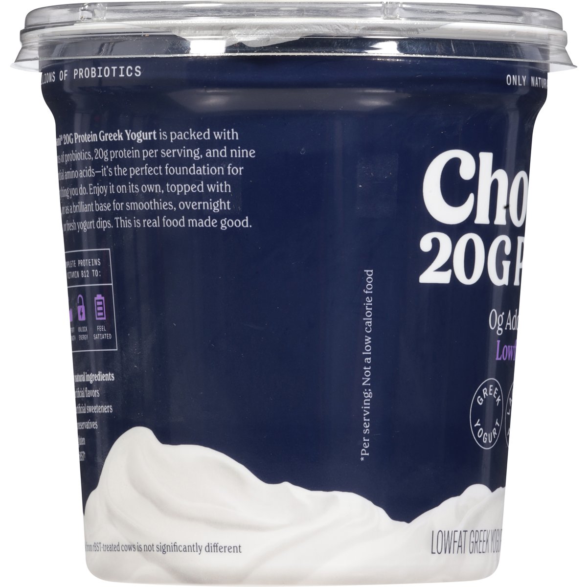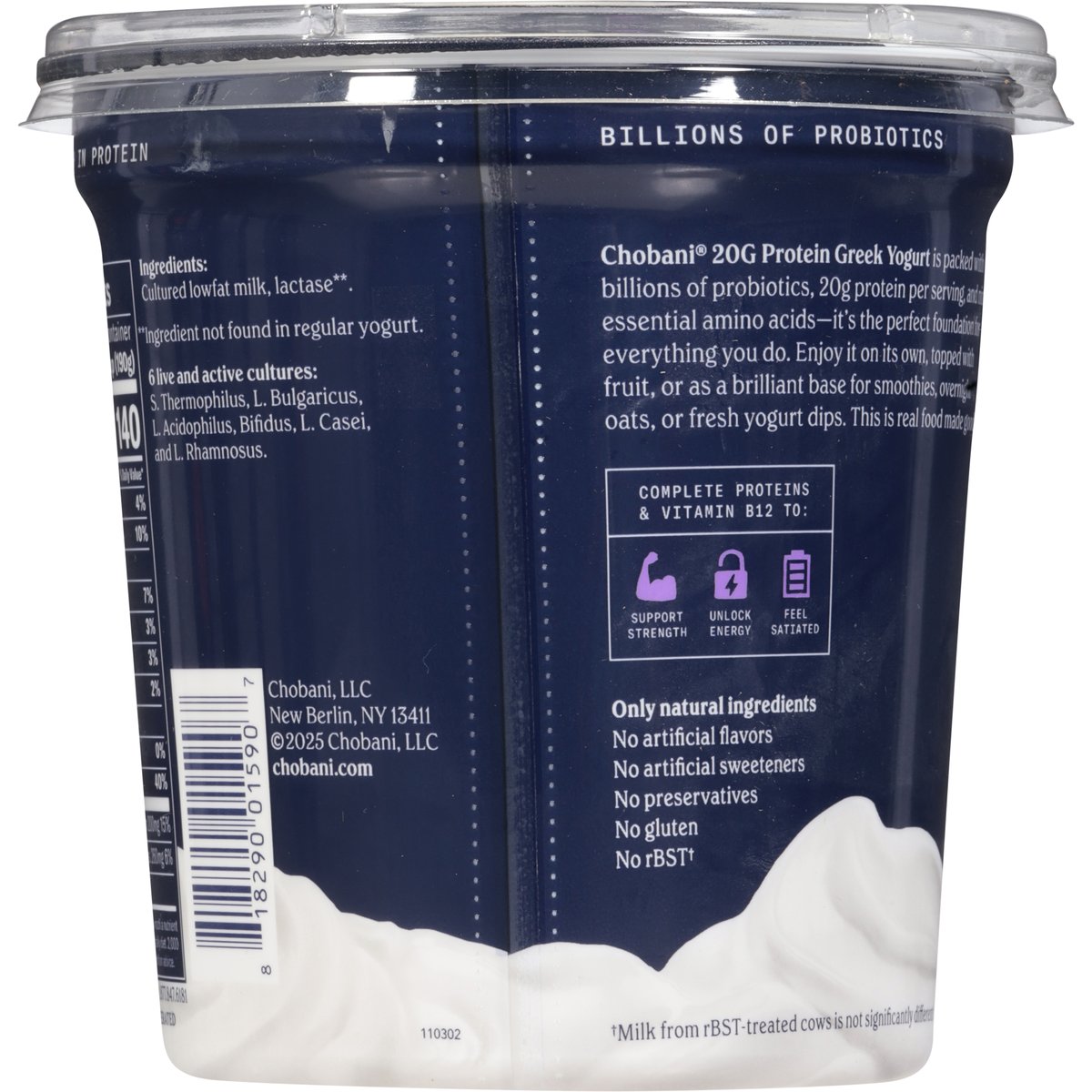 20 g protein. 0 g added sugar*. *Per Serving: Not a low calorie food. Lowfat. Lactose free. No gluten. Vitamin B12. Billions of probiotics. Naturally in rich protein. Greek yogurt. Chobani 20 g Protein Greek Yogurt is packed with billions of probiotics, 20 g protein per serving, and nine essential amino acids - it's the perfect foundation for everything you do. Enjoy it on its own, topped with fruit, or as a brilliant base for smoothies, overnight oats, or fresh yogurt dips. This is real food made good. Complete Proteins & Vitamin B12 to: Support strength. Unlock energy. Feel satiated. Only Natural Ingredients: No artificial flavors. No artificial sweeteners. No preservatives. No gluten. No rBST (a). (a) Milk from rBST-treated cows is not significantly different. Grade A. chobani.com. Questions or comments? 1.877.847.6181.