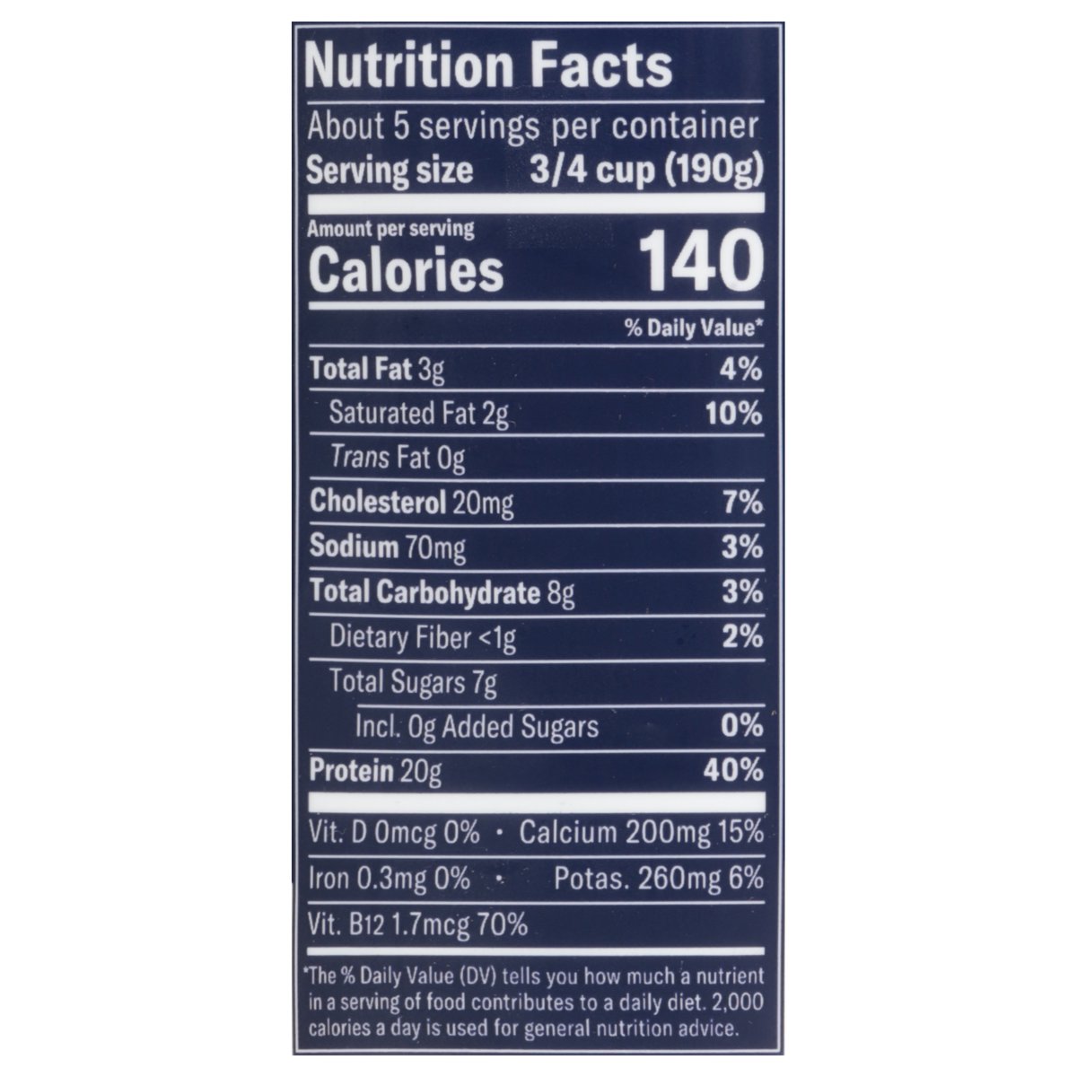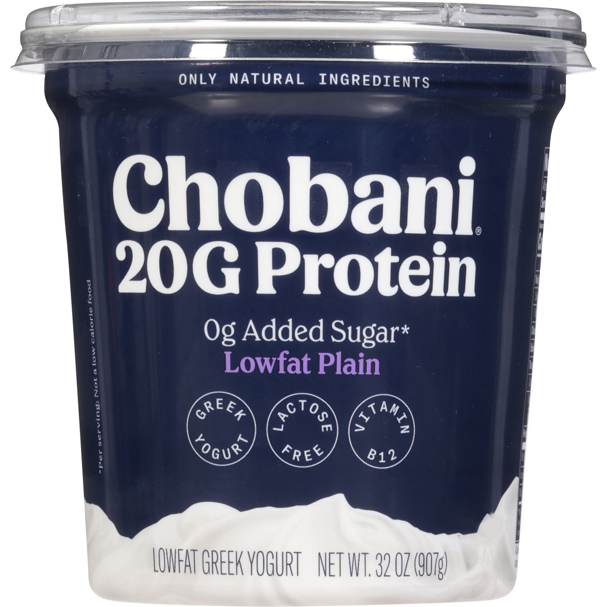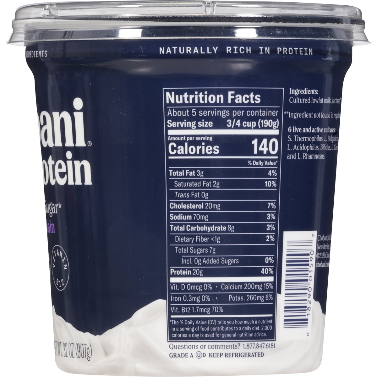 20 g protein. 0 g added sugar*. *Per Serving: Not a low calorie food. Lowfat. Lactose free. No gluten. Vitamin B12. Billions of probiotics. Naturally in rich protein. Greek yogurt. Chobani 20 g Protein Greek Yogurt is packed with billions of probiotics, 20 g protein per serving, and nine essential amino acids - it's the perfect foundation for everything you do. Enjoy it on its own, topped with fruit, or as a brilliant base for smoothies, overnight oats, or fresh yogurt dips. This is real food made good. Complete Proteins & Vitamin B12 to: Support strength. Unlock energy. Feel satiated. Only Natural Ingredients: No artificial flavors. No artificial sweeteners. No preservatives. No gluten. No rBST (a). (a) Milk from rBST-treated cows is not significantly different. Grade A. chobani.com. Questions or comments? 1.877.847.6181.