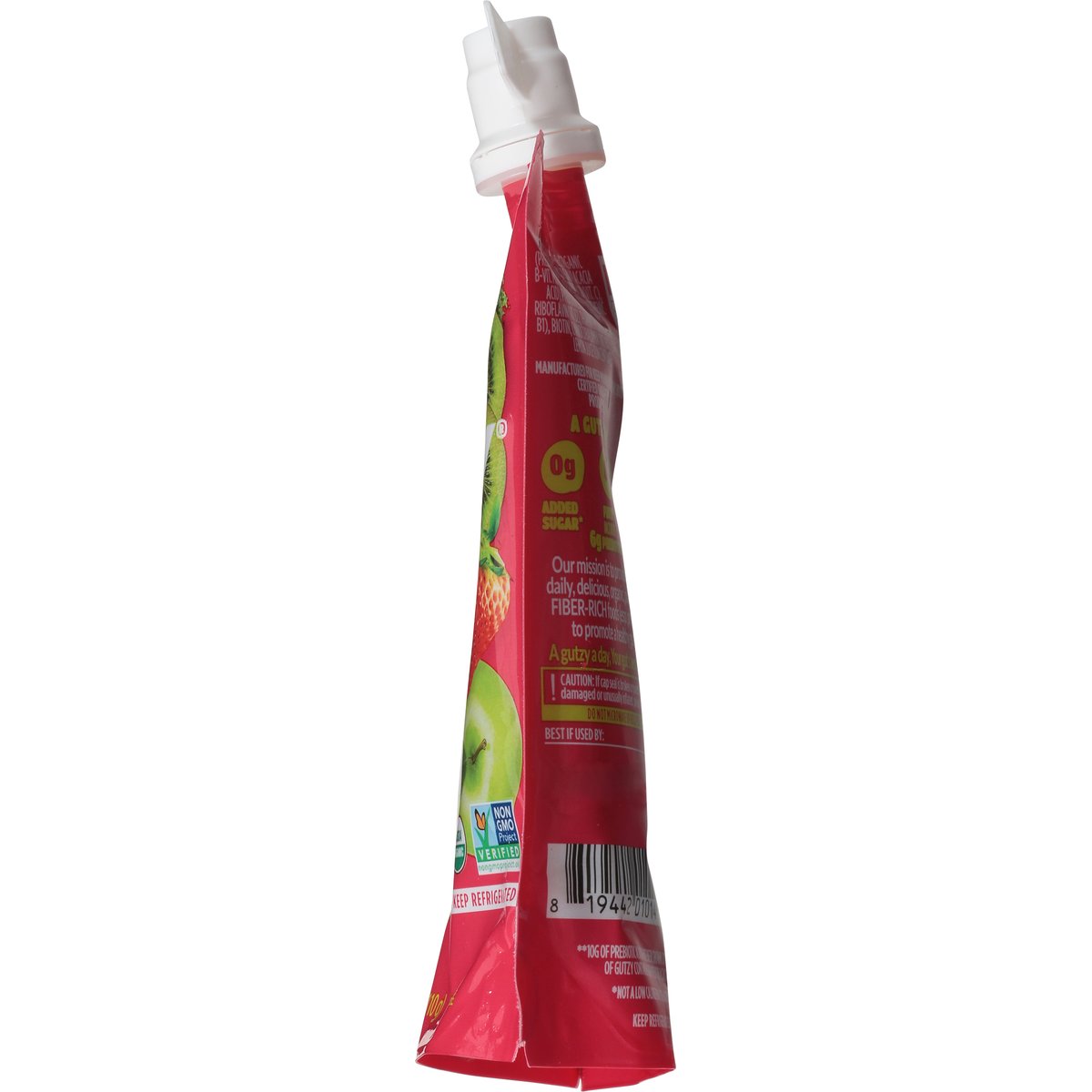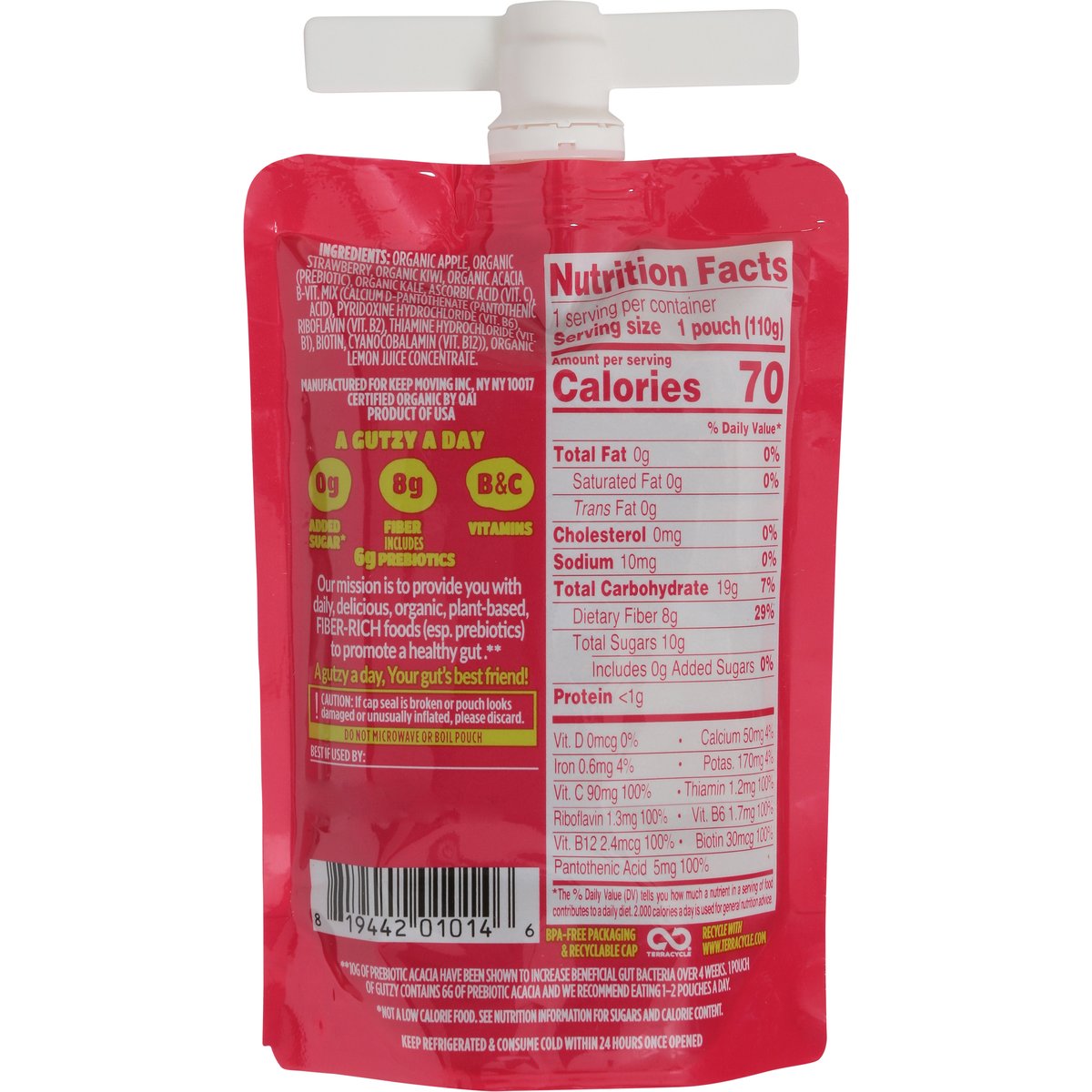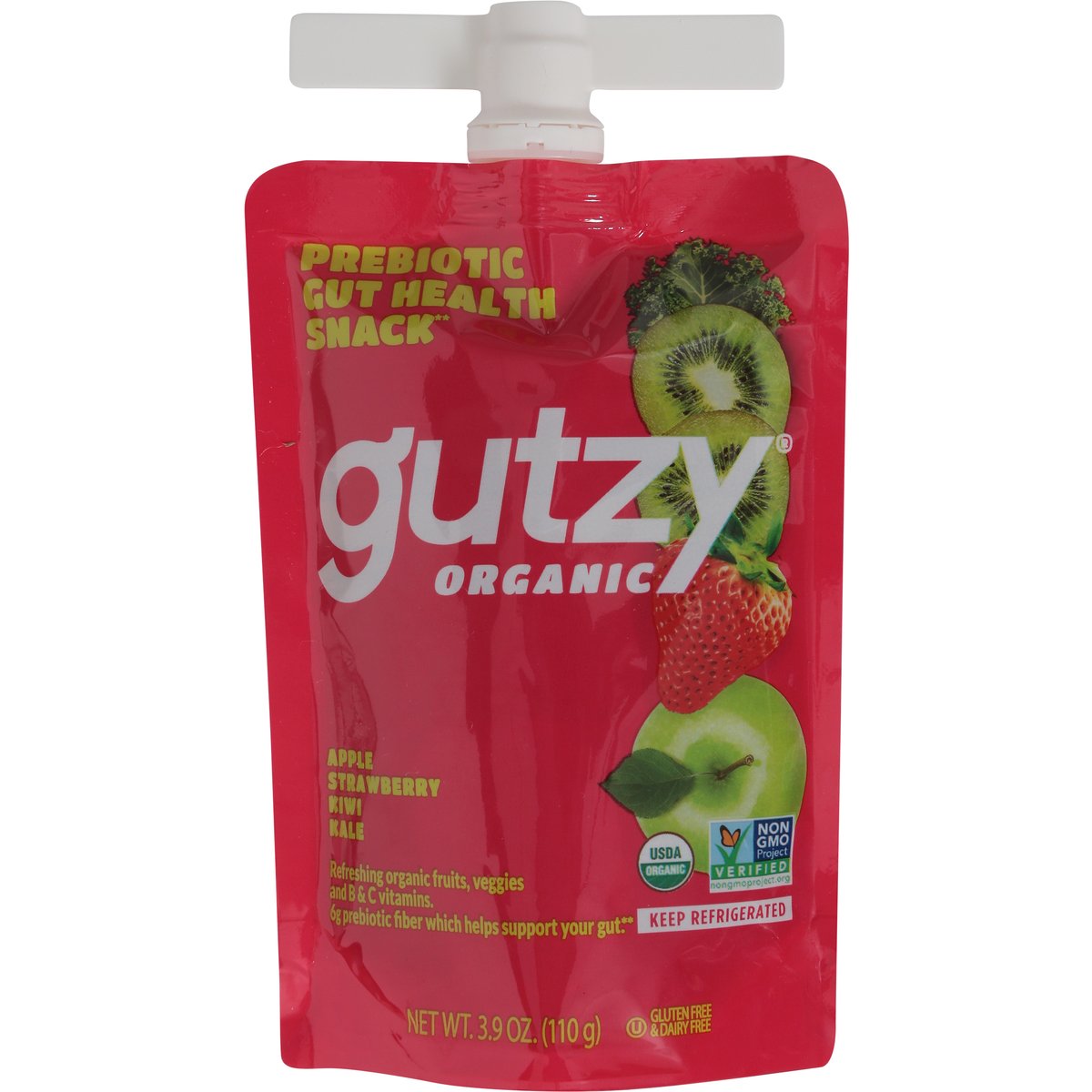 Apple, strawberry, kiwi & kale. 6 g prebiotic fiber which helps support your gut (10 g of prebiotic acacia have been shown to increase beneficial gut bacteria over 4 weeks. 1 pouch of gutzy contains 6 g of prebiotic acacia and we recommend eating 1-2 pouches a day). 0 added sugar (Not a low calorie food. See nutrition for sugars and calorie content). 8 g fiber includes 6 g prebiotics. USDA Organic. Certified Organic by QAI. Gluten free & dairy free. B&C vitamins. Non-GMO Project verified. nongmoproject.org. Prebiotic gut health snack (10 g of prebiotic acacia have been shown to increase beneficial gut bacteria over 4 weeks. 1 pouch of Gutzy contains 6 g of prebiotic acacia and we recommend eating 1-2 pouches a day). Refreshing organic fruits, veggies and B&C vitamins. A gutzy a day, your gut's best friend! gutzyorganic.com. www.facebook.com/gutzyorganic. Find out what keeps us moving at gutzyorganic.com. Contact(at)gutzyorganic.com. Our mission is to provide you with daily, delicious, organic, plant-based, fiber-rich foods (esp. Prebiotics) to promote a healthy gut (10 g of prebiotic acacia have been shown to increase beneficial gut bacteria over 4 weeks. 1 pouch of gutzy contains 6 g of prebiotic acacia and we recommend eating 1-2 pouches a day). BPA free packaging & recyclable cap. TerraCycle: Recycle with www.TerraCycle.com. Product of USA.