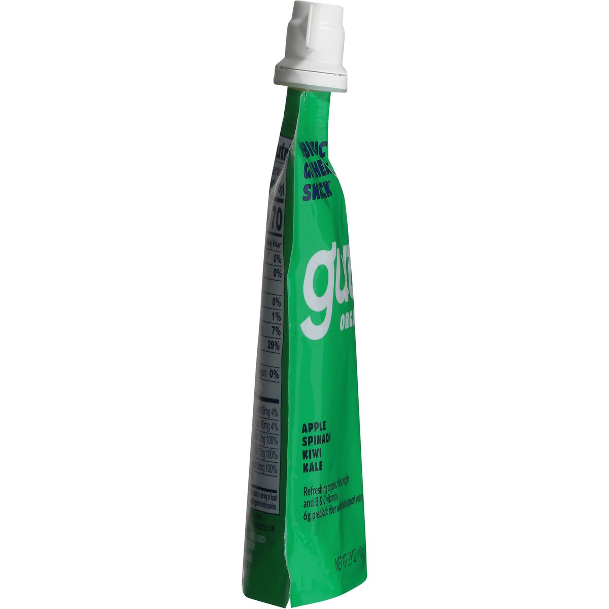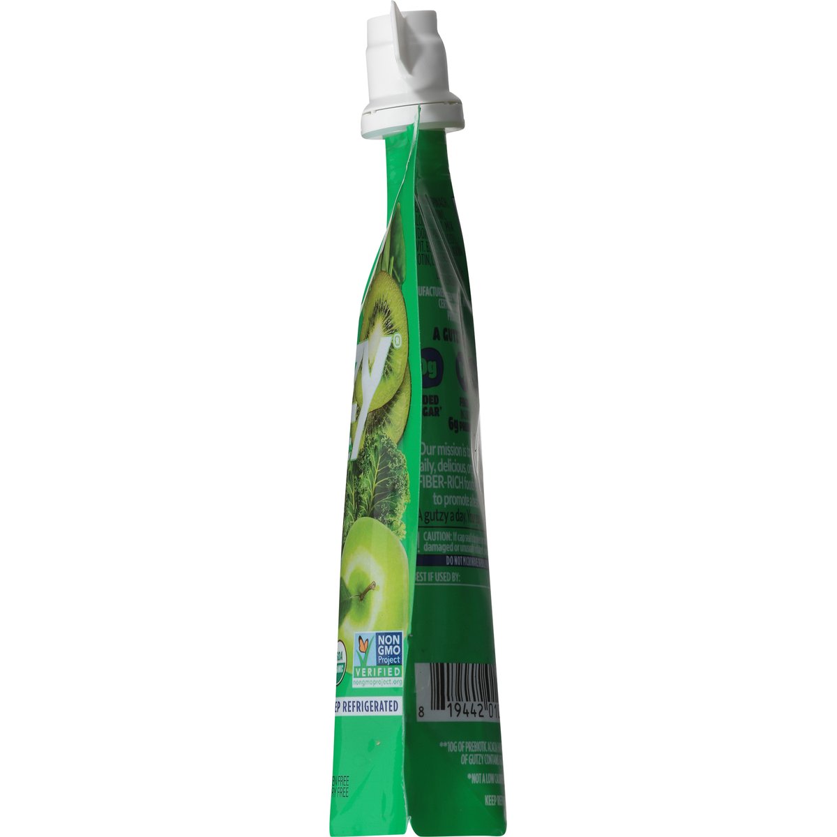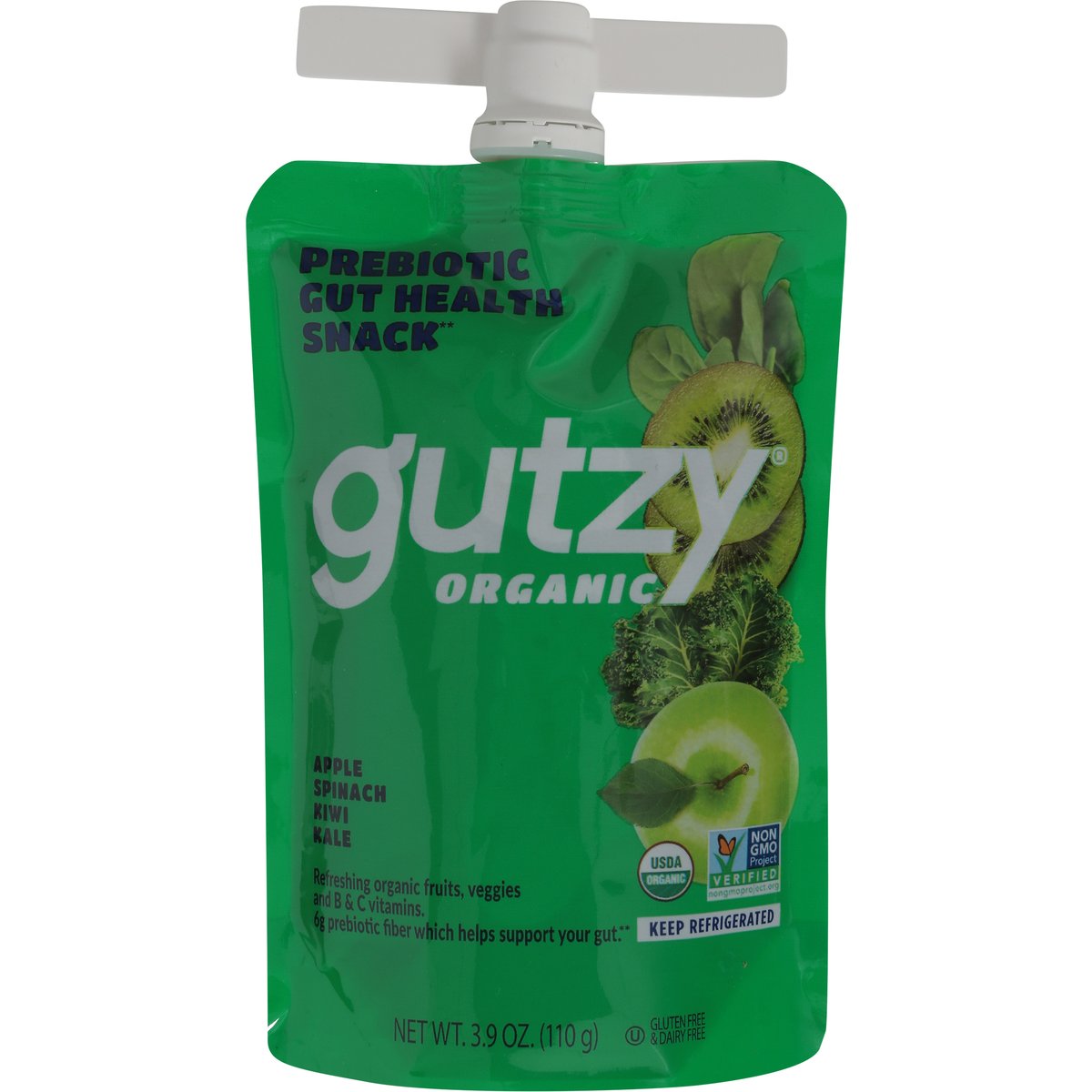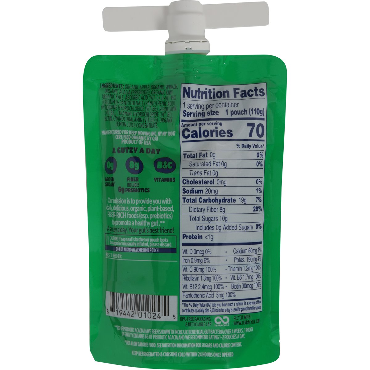 Apple. Spinach. Kiwi. Kale. 0 g added sugar (Not a low calorie food. See nutrition facts for sugars and calorie content). 8 g fiber includes 6 g prebiotics. USDA Organic. Gluten free & dairy free. Certified Organic by QAI. B&C vitamins. Non-GMO Project verified. nongmoproject.org. Gut health snack (10 g of Prebiotic Acacia have been shown to increase beneficial gut bacteria over 4 weeks. 1 pouch of Gutzy contains 6 g of Prebiotic Acacia and we recommend eating 1-2 pouches a day). A Gutzy a day. A healthy gut means a healthy body & mind. Gutzy Organic brings you your daily dose of delicious plant-based prebiotic foods that nourish the healthy (probiotic) bacteria naturally present in your gut (10 g of Prebiotic Acacia have been shown to increase beneficial gut bacteria over 4 weeks. 1 pouch of Gutzy contains 6 g of Prebiotic Acacia and we recommend eating 1-2 pouches a day). Be Gutzy. 6 g Prebiotics to support your gut (10 g of Prebiotic Acacia have been shown to increase beneficial gut bacteria over 4 weeks. 1 pouch of Gutzy contains 6 g of Prebiotic Acacia and we recommend eating 1-2 pouches a day). www.facebook.com/gutzyorganic. contact(at)gutzyorganic.com Find out what keeps us moving at gutzyorganic.com. BPA-free packaging & recyclable cap. Recycle with TerraCycle. www.terracycle.com. Product of USA.
