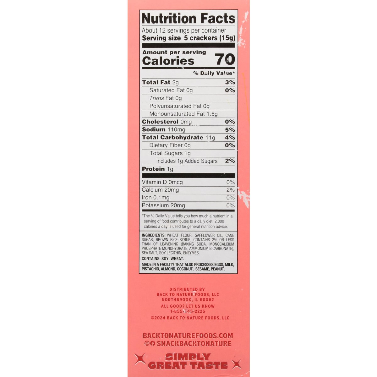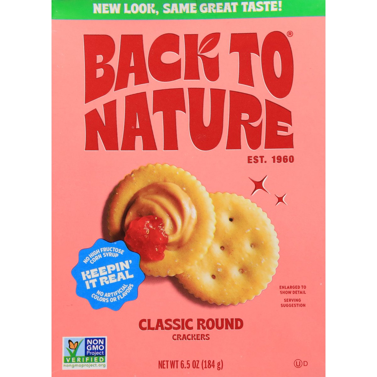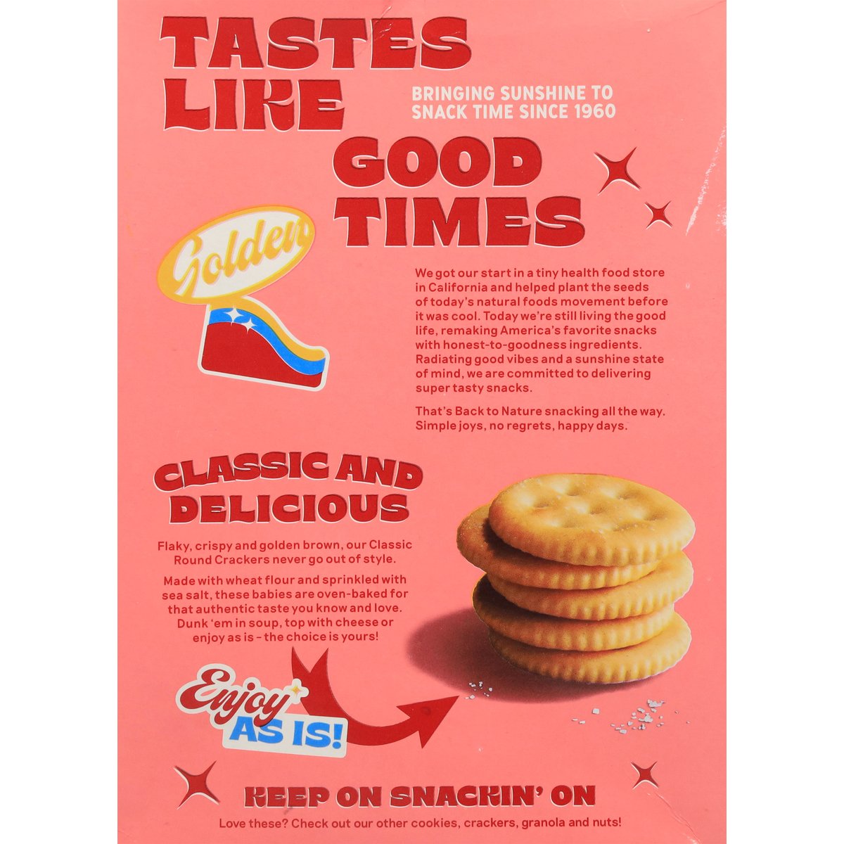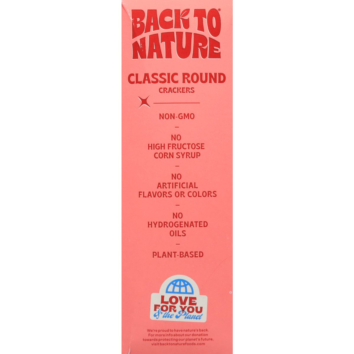 No artificial flavors or colors Non-GMO Project verified. nongmoproject.org. Non-GMO. New look, same great taste! Est. 1960. Keepin’ it real. No high fructose corn syrup. No artificial colors or flavors. Tasty snacks since way back. Tastes like good times. Bringing sunshine to snack time since 1960. Golden. We got our start in a tiny health food store in California and helped plant the seeds of today's natural foods movement before it was cool. Today we're still living the good life, remaking America's favorite snacks with honest-to-goodness ingredients. Radiating good vibes and a sunshine state of mind, we are committed to delivering super tasty snacks. That's Back to Nature snacking all the way. Simple joys, no regrets, happy days. Classic and Delicious: Flaky, crispy and golden brown, our Classic Round Crackers never go out of style. Made with wheat flour and sprinkled with sea salt, these babies are oven-baked for that authentic taste you know and love. Dunk 'em in soup, top with cheese or enjoy as is - the choice is yours! Enjoy as is! Keep on snackin' on. No hydrogenated oils. Plant-based. Simply great taste. backtonaturefoods.com. Instagram. Facebook. snackbacktonature. Yeah we scan. All good? Let us know 1-855-346-2225. Love for You & the Planet: We're proud to have nature's back. For more info about our donation towards protecting our planet's future, visit backtonaturefoods.com. Love these? Check out our other cookies, crackers, granola and nuts! 100% recycled paperboard.