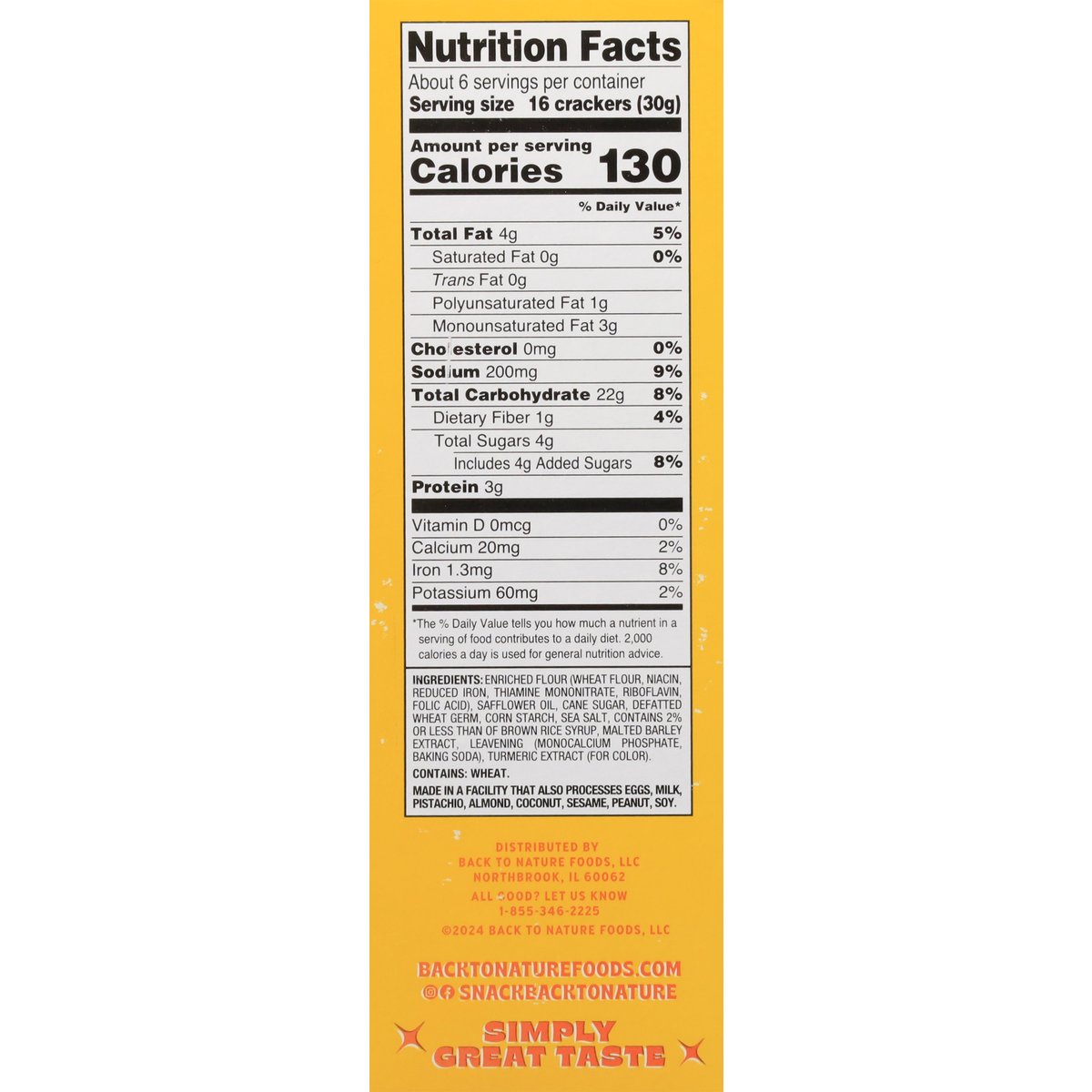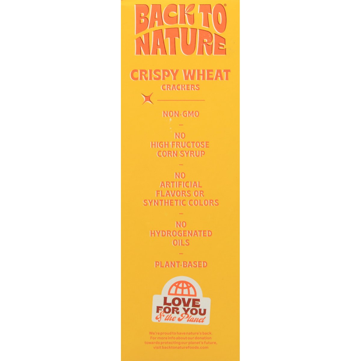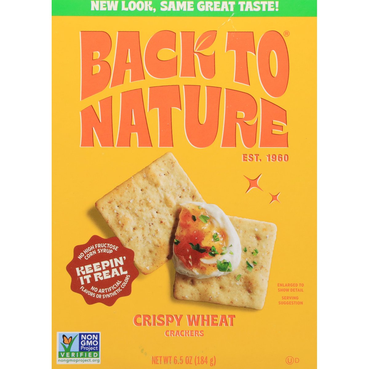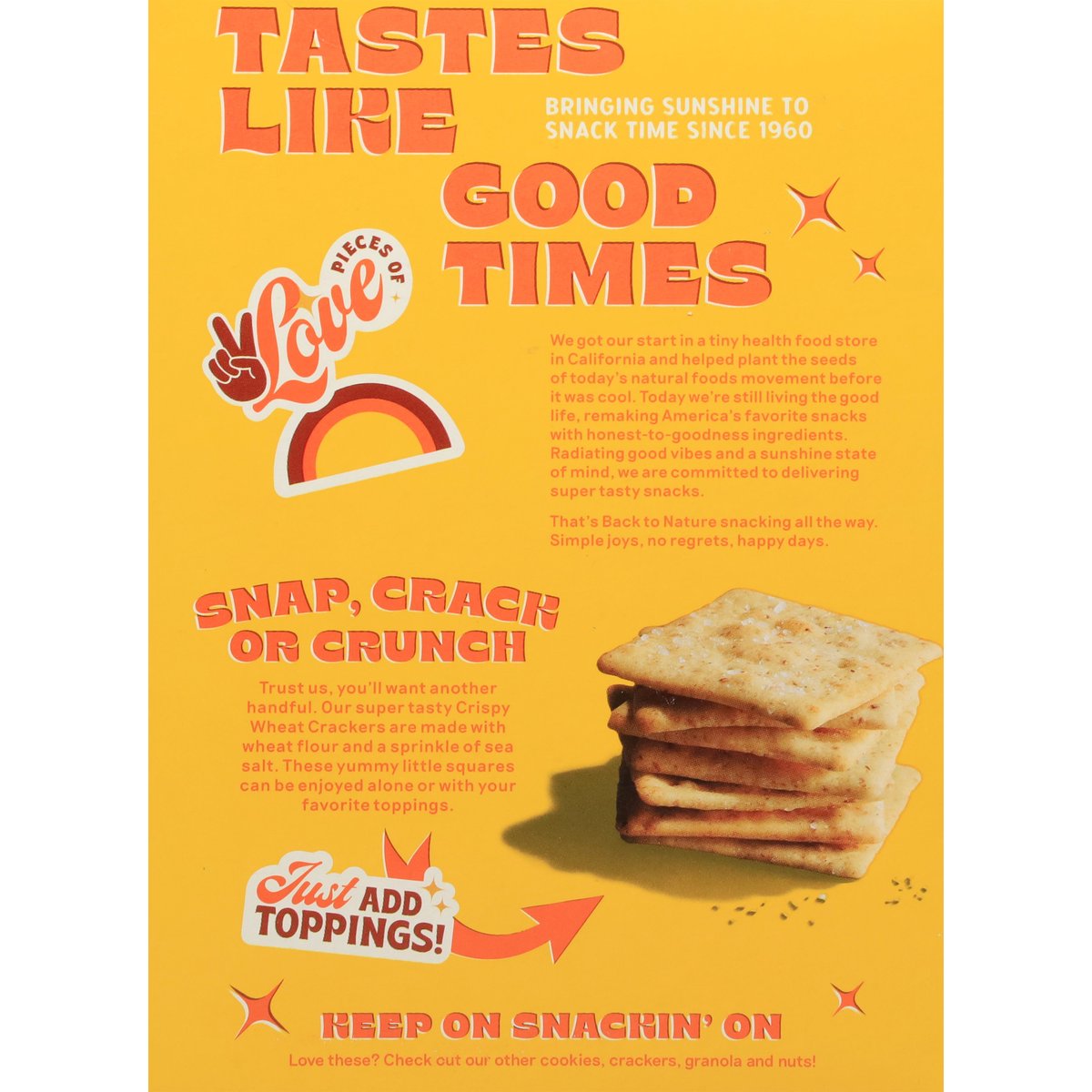 No artificial flavors or synthetic colors. Non-GMO Project verified. nongmoproject.org. New look, same great taste! Est. 1960. Keepin’ It Real: No high fructose corn syrup. No artificial flavors or synthetic colors. Tasty snacks since way back. Tastes like good times. Bringing sunshine to snack time since 1960. We got our start in a tiny health food store in California and helped plant the seeds of today's natural foods movement before it was cool. Today we're still living the good life, remaking America's favorite snacks with honest-to-goodness ingredients. Radiating good vibes and a sunshine state of mind, we are committed to delivering super tasty snacks. That's Back to Nature snacking all the way. Simple joys, no regrets, happy days. Pieces of love. Snap, crack or crunch! Trust us, you’ll want another handful. Our super tasty Crispy Wheat Crackers are made with wheat flour and a sprinkle of sea salt. These yummy little squares can be enjoyed alone or with your favorite toppings. Just add toppings! Keep on snackin’ on. No hydrogenated oils. Plant-based. Simply great taste. backtonaturefoods.com. Instagram. Facebook. Snackbacktonature. Yesh we scan. All good? Let us know 1-855-346-2225. Love these? Check out our other cookies, crackers, granola and nuts! 100% recycled paperboard. Love for you & the planet: We're proud to have nature's back. For more info about our donation towards protecting our plant's future, visit backtonaturefoods.com.