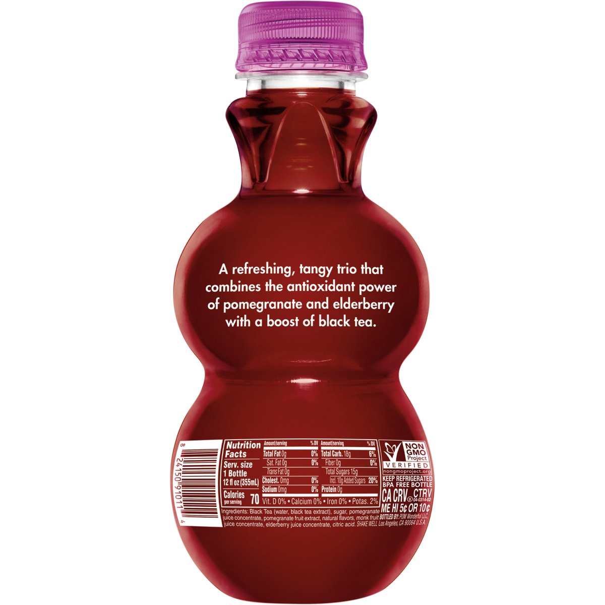 Antioxidant super tea. Non-GMO Project verified. nongmoproject.org. A refreshing, tangy trio that combines the antioxidant power of pomegranate and elderberry with a boost of black tea. BPA free bottle.