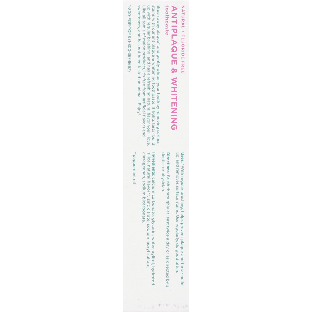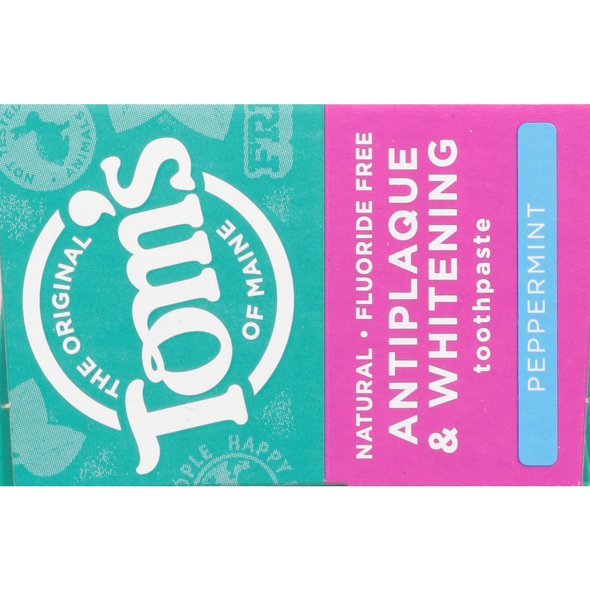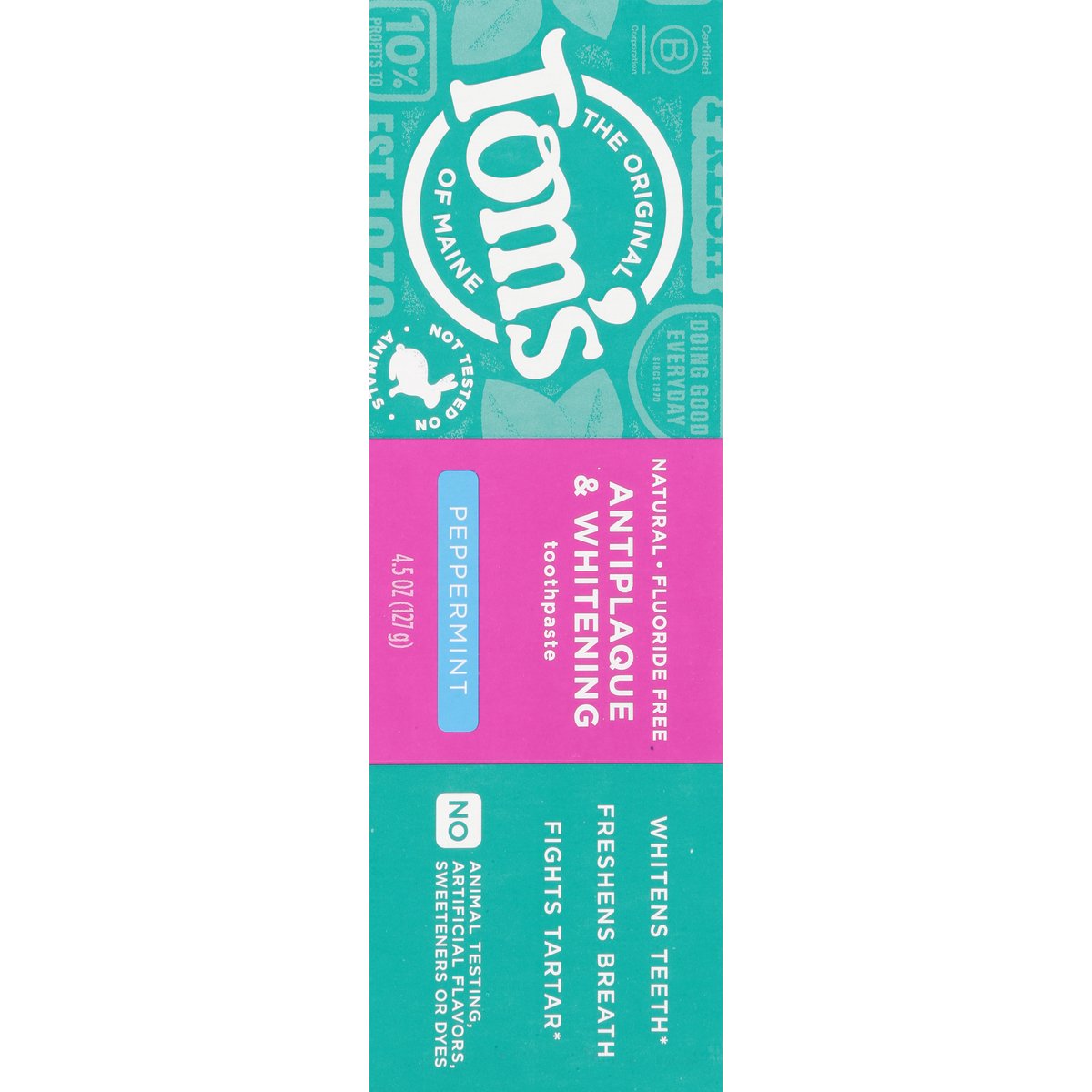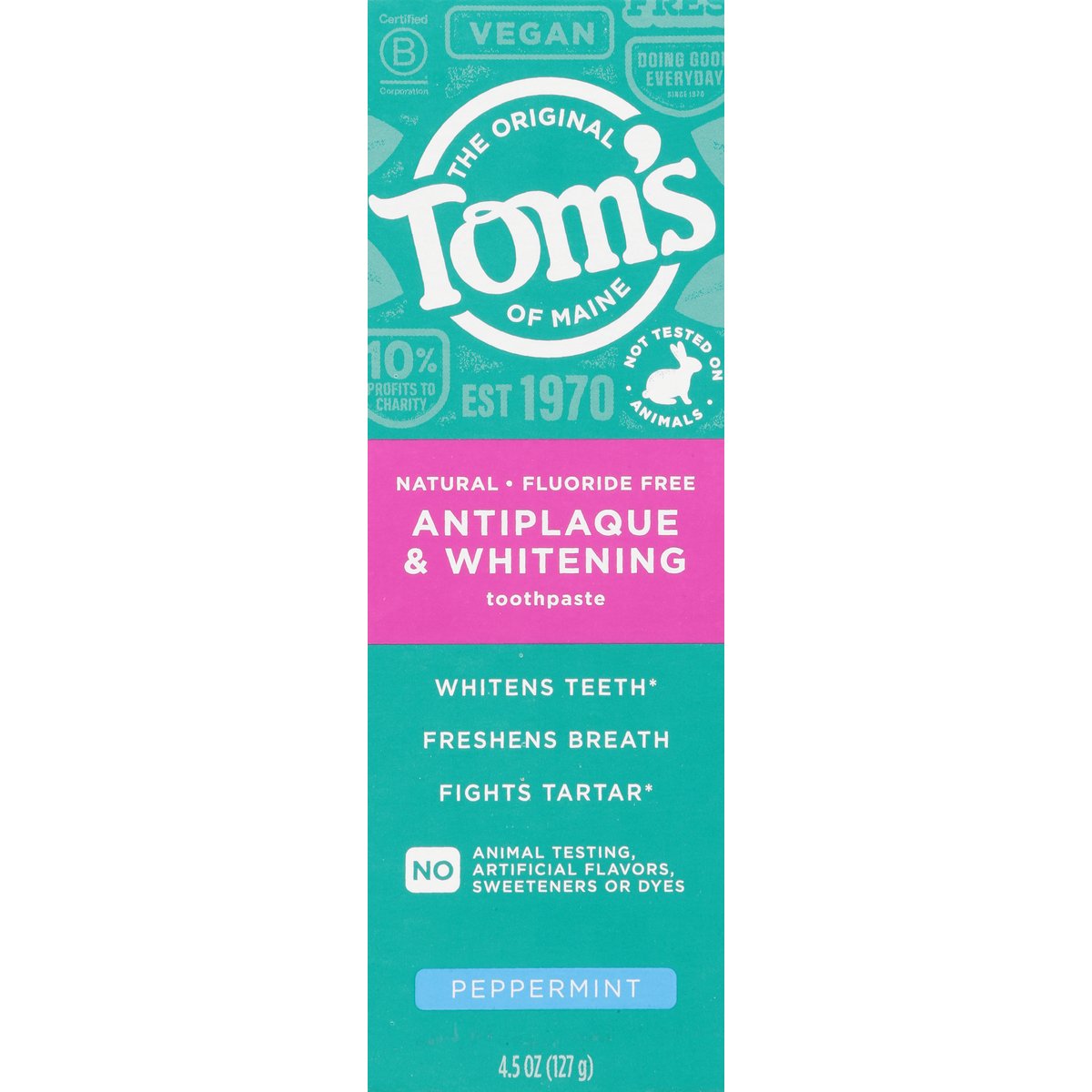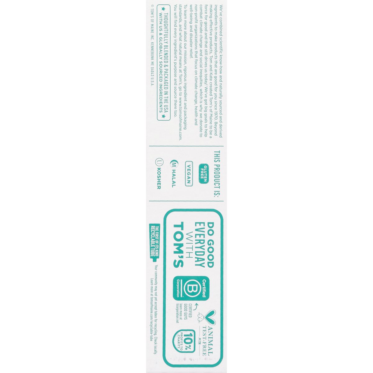 No artificial flavors, sweeteners or dyes. This product is: Gluten free. Vegan. Halal. Doing good everyday since 1970. Natura. Fluoride free. Antiplaque & whitening. Whitens teeth (With regular brushing, helps prevent plaque and tartar build up, and remove surface stains. Use regularly, do good often). Freshens breath. Fights tartar (With regular brushing, helps prevent plaque and tartar build up, and remove surface stains. Use regularly, do good often). We've combined scientific know-how and naturally sourced and derived ingredients to make products that are good for you since 1970. Beyond making effective products, Tom and Kate created Tom's of Maine to be a force for good and that still drives us today! We've got big goals to help combat climate change and social inequities, which is why we donate to non profit organizations that focus on climate change, health and well-being and disaster relief. Brush away plaque (With regular brushing, helps prevent plaque and tartar build up, and remove surface stains. Use regularly, do good often) and gently whiten your teeth by removing surface stains with our antiplaque & whitening toothpaste. It fights tartar build up with regular brushing, and has a refreshing natural flavor you'll love. Like all tom's of maine products, it's free from artificial flavors and sweeteners, and has not been tested on animals. Enjoy! www.tomsofmaine.com. To learn more about our mission, rigorous ingredients and packaging standards, and what natural means at Tom's, go to www.tomsofmaine.com. You will find every ingredient's purpose and source there too. 1-800-For-Toms (1-800-367-8667). Do good everyday with Tom's: Certified B Corporation. 10% profits to charity. Certified good guys. Learn more at bcorporation.net. Not tested on animals. No animal testing. Animal test-free PETA. The first of its kind recyclable tube. Your community may not yet accept tubes for recycling. Check locally. Lean more at tomsofmaine.com/recyclable-tube. Thoughtfully blended & packaged in the USA with US & globally sourced ingredients.