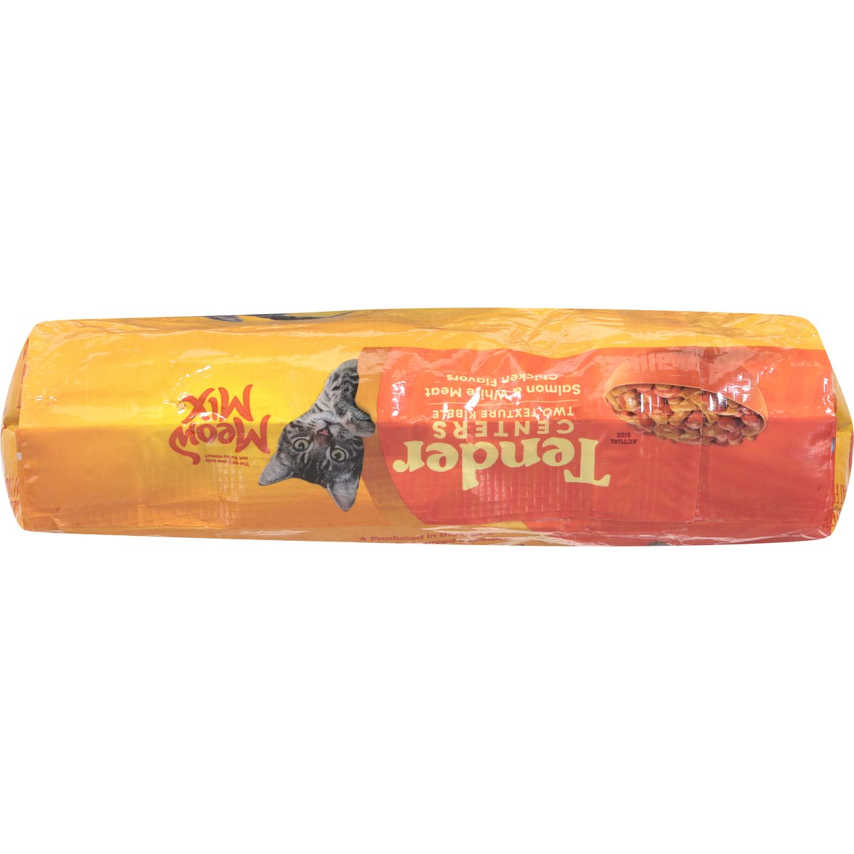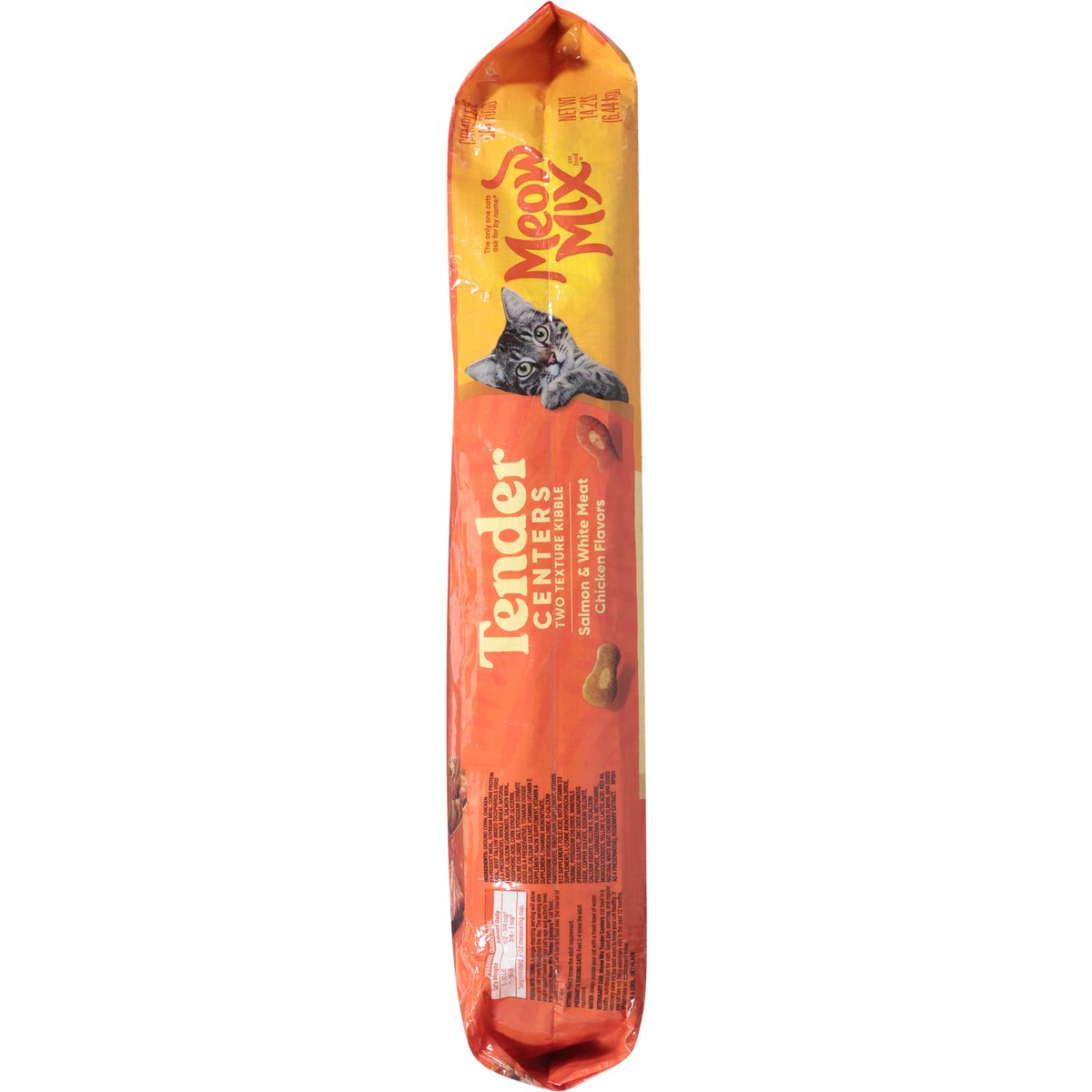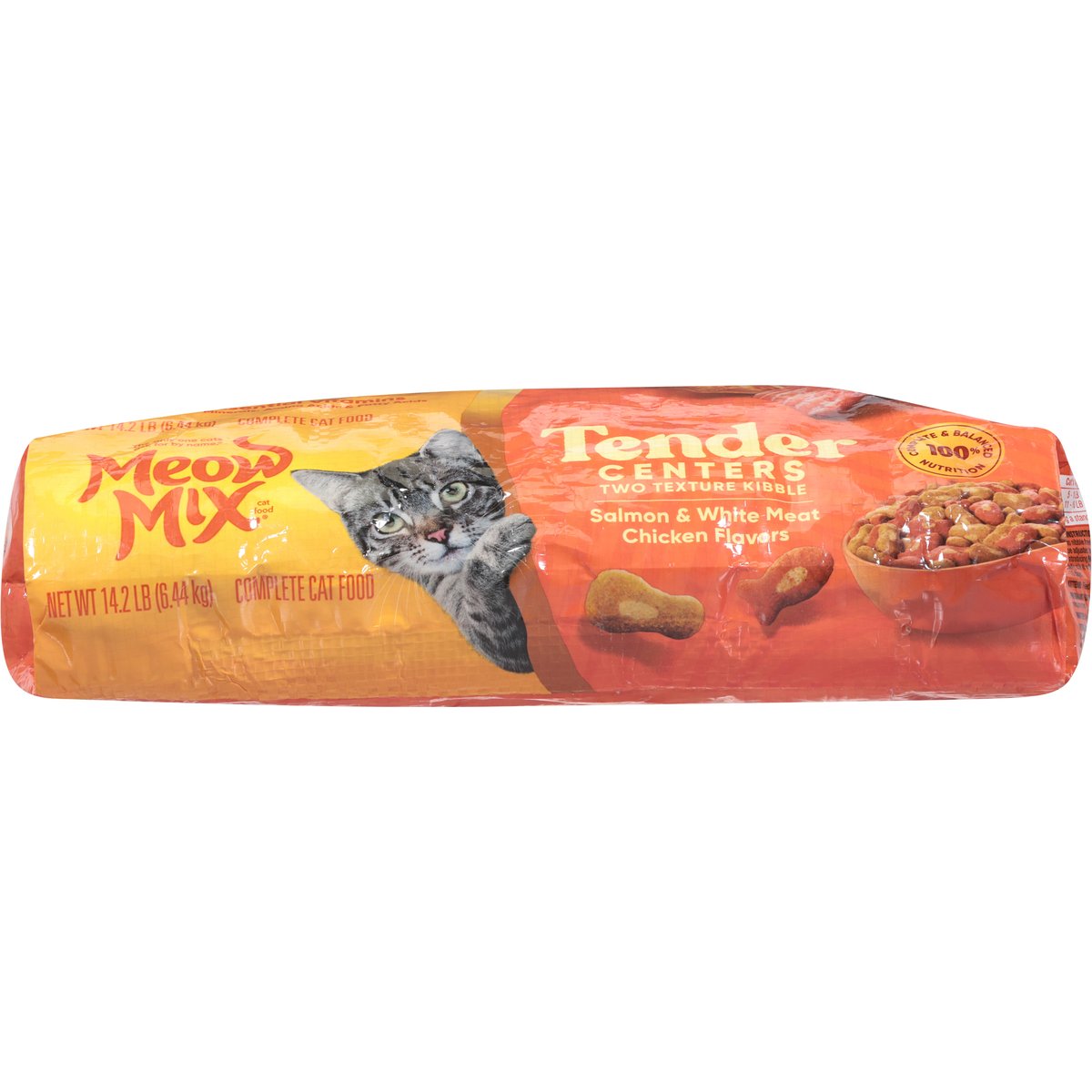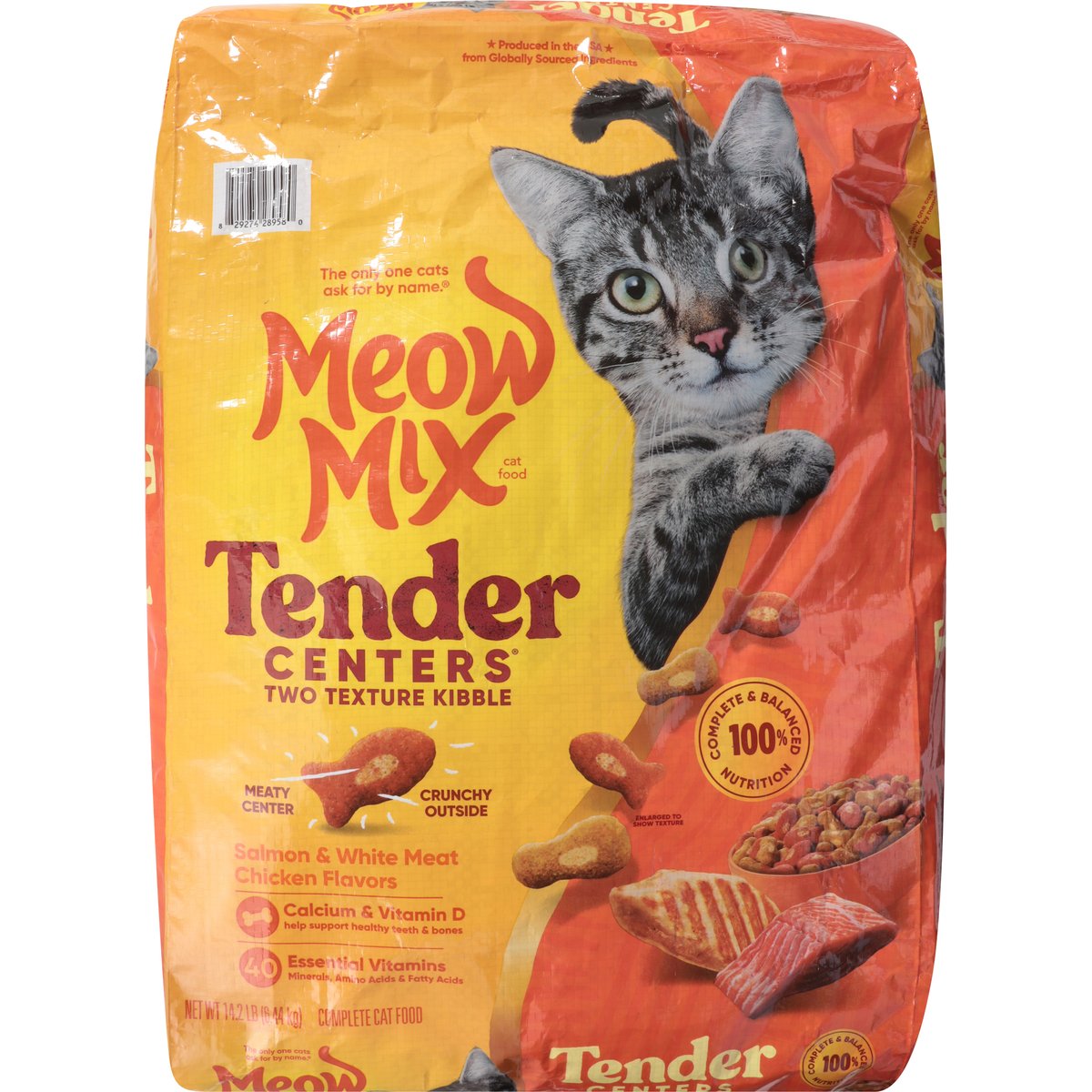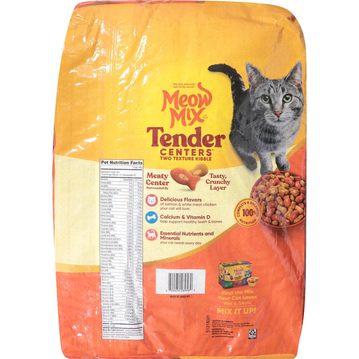 Meow Mix Tender Centers Salmon & White Meat Chicken Flavors cat food is formulated to meet the nutritional levels established by the AAFCO Cat Food Nutrient Profiles for All Life Stages. 100% complete & balanced nutrition. The only one cats ask for by name. Two texture kibble. Meaty center. Crunchy outside. Complete & balanced 100% nutrition. Meaty center surrounded by. Delicious flavors of salmon & white meat chicken your cat will love. Calcium & Vitamin D helps support healthy teeth & bones. Essential nutrients and minerals your cat needs every day. Tasty, crunchy layer. meowmix.com. how 2recycle.info. Questions or Comments: Visit us at meowmix.com or call 1-877-Meow-mix (1-877-636-9649) weekdays, with the information in the "Best If Used By" date box. Find the Mix your Cat loves wet & treats. Mix it up! Produced in the USA from globally sourced ingredients.