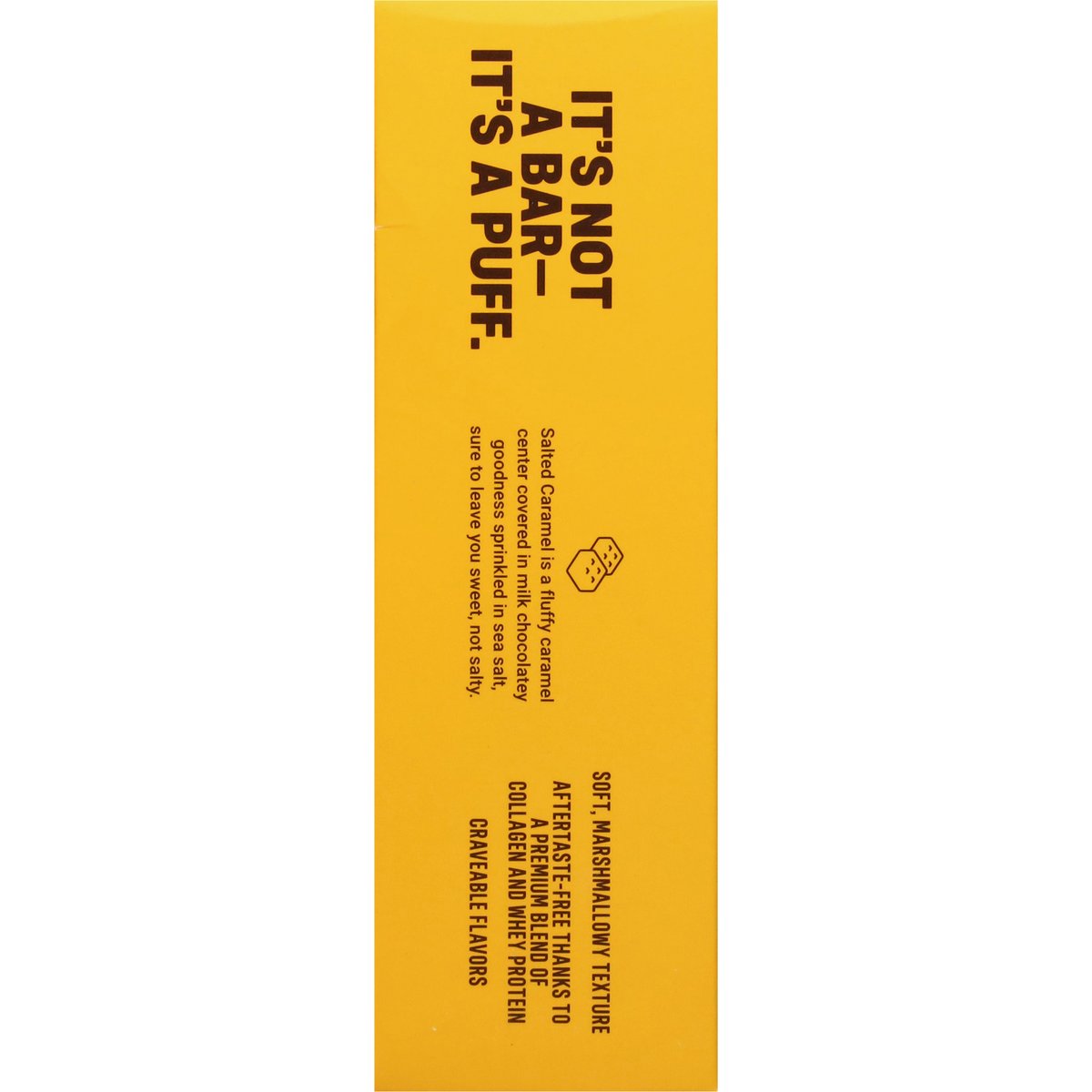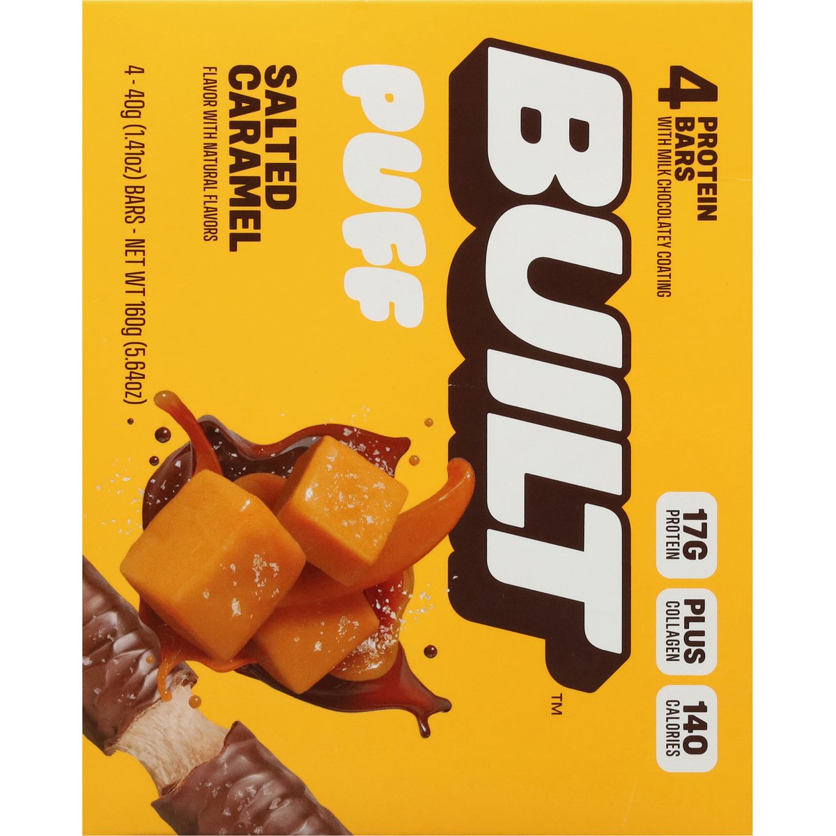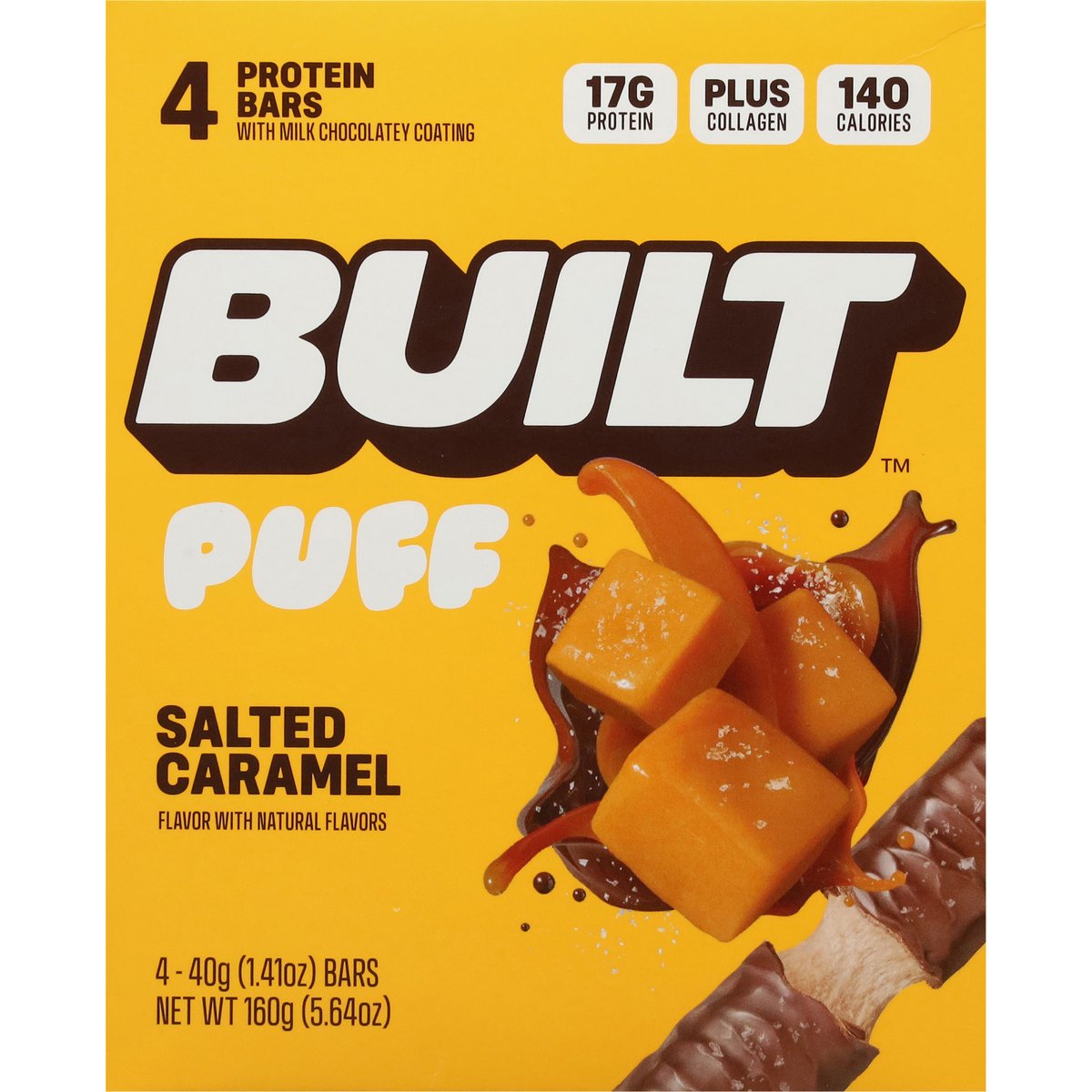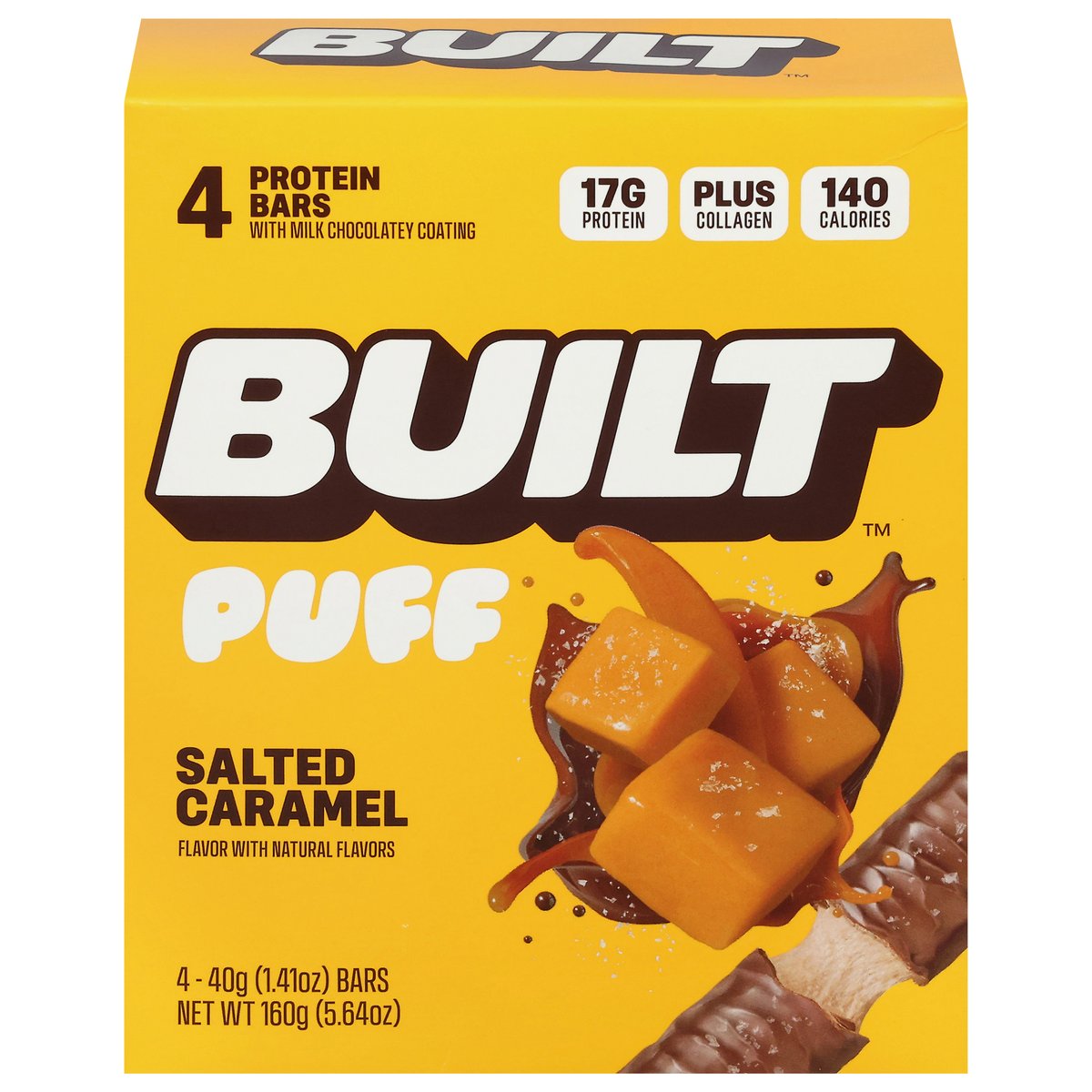 With milk chocolatey coating. Salted Caramel is a fluffy caramel flavored center covered in milk chocolatey goodness sprinkled in sea salt, sure to leave you sweet, not salty. Flavor with natural flavors. 17 g protein; 140 calories. Gluten free. Plus collagen. Plus collagen. It’s not a bar – it’s a puff. Salted Caramel is a fluffy caramel center covered in milk chocolatey goodness sprinkled in sea salt, sure to leave you sweet, not salty. Soft, marshmallowy texture. Aftertaste-free thanks to a premium blend of collagen and whey protein. Craveable flavors. built.com.
