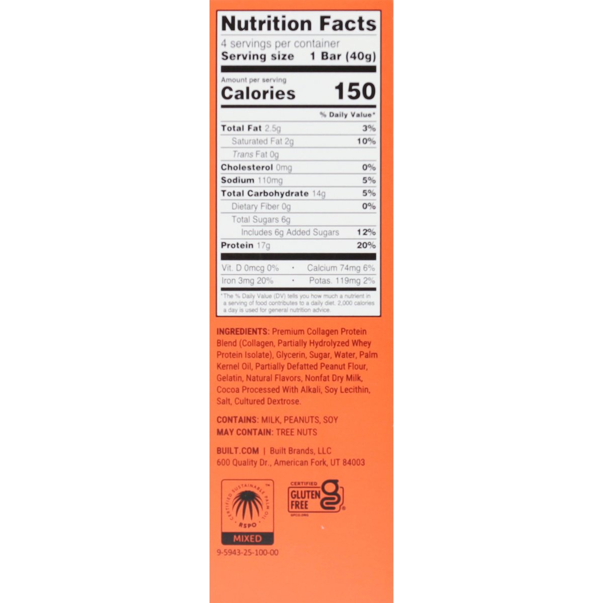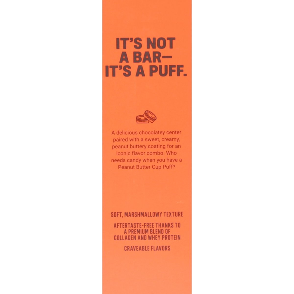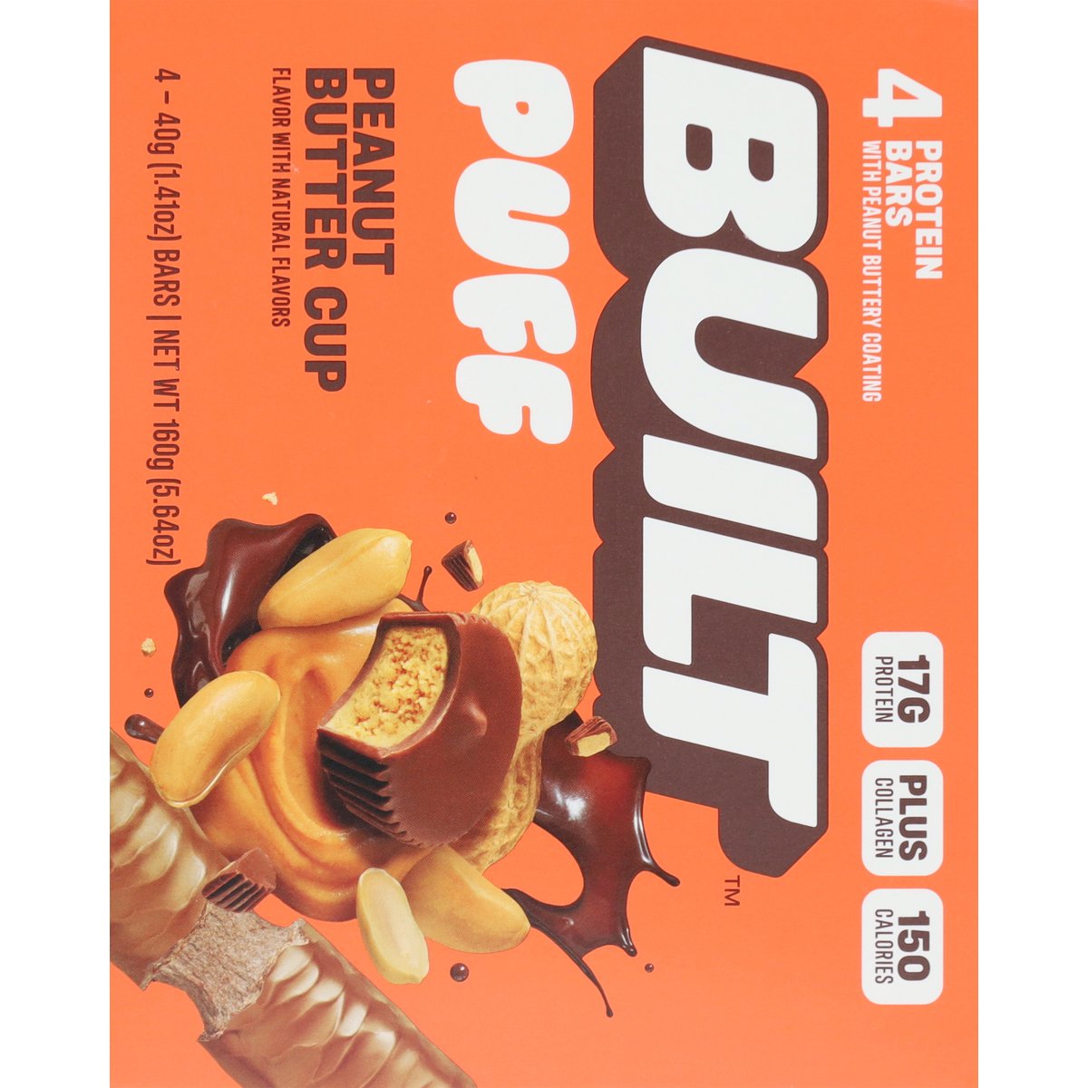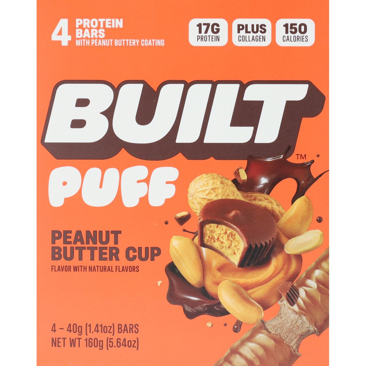 Flavor with natural flavors. 17 g protein. 150 calories. Certified gluten free. gfco.org. Plus collagen. It’s not a bar-it’s a puff. A delicious chocolatey center paired with a sweet, creamy, peanut buttery coating for an iconic flavor combo. Who needs candy when you have a Peanut Butter Cup Puff? Soft, marshmallowy texture. Aftertaste-free thanks to a premium blend of collagen and whey protein. Craveable flavors. built.com. RSPO: Certified sustainable palm oil. Mixed.