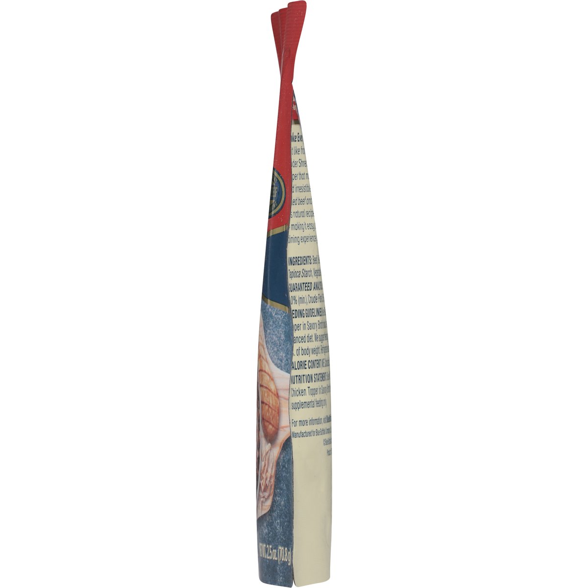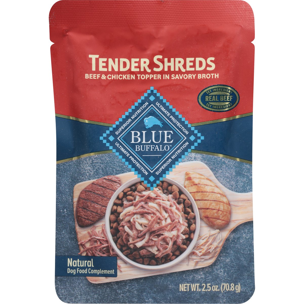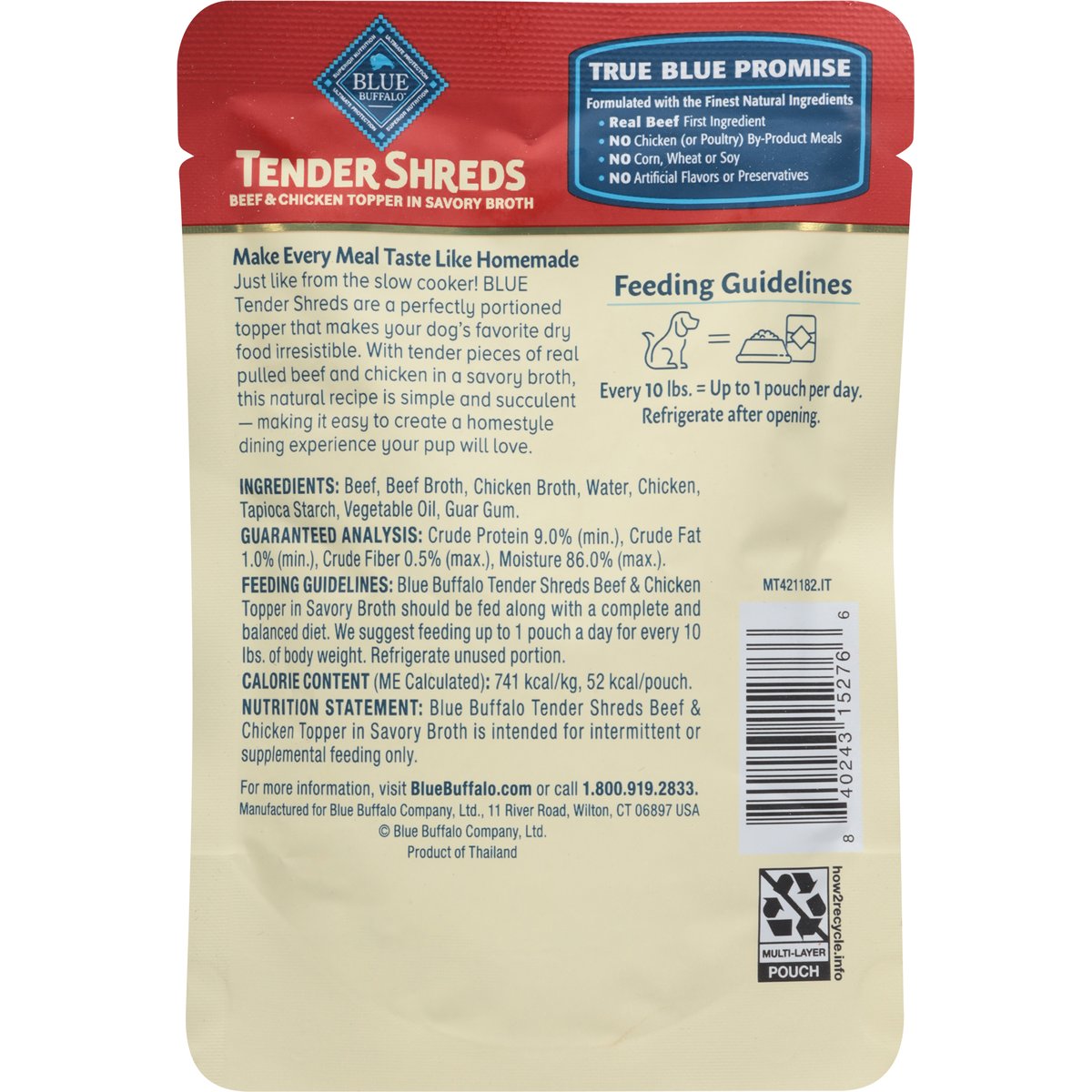 Calorie Content (ME Calculated): 741 kcal/kg, 52 kcal/pouch. Nutrition Statement: Blue Buffalo Tender Shreds Beef & Chicken Topper in Savory Broth is intended for intermittent or supplemental feeding only. No artificial flavors or preservatives. Superior nutrition. Ultimate protection. True Blue Promise: Formulated with the Finest Natural Ingredients. Real Beef First Ingredient. No Chicken (or Poultry) By-Product Meals. No Corn, Wheat or Soy. No Artificial Flavors or Preservatives. Make Every Meal Taste Like Homemade. Just like from the slow cooker! BLUE Tender Shreds are a perfectly portioned topper that makes your dog's favorite dry food irresistible. With tender pieces of real pulled beef and chicken in a savory broth, this natural recipe is simple and succulent - making it easy to create a homestyle dining experience your pup will love. BlueBuffalo.com. how2recycle.info. For more information, visit BlueBuffalo.com or call 1-800-919-2833. Product of Thailand.