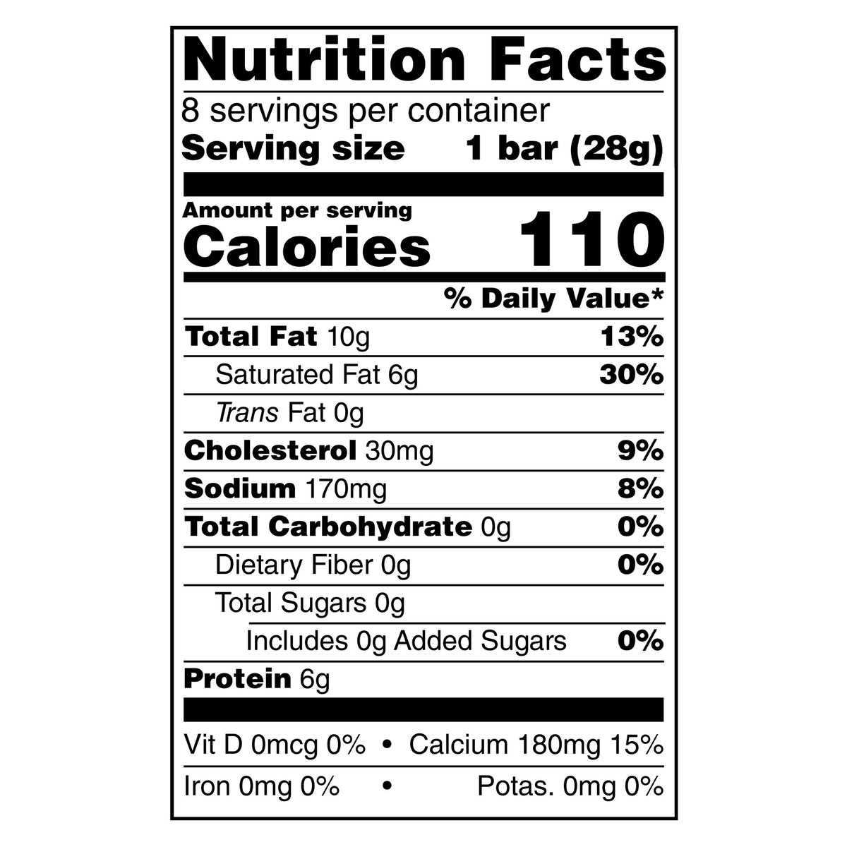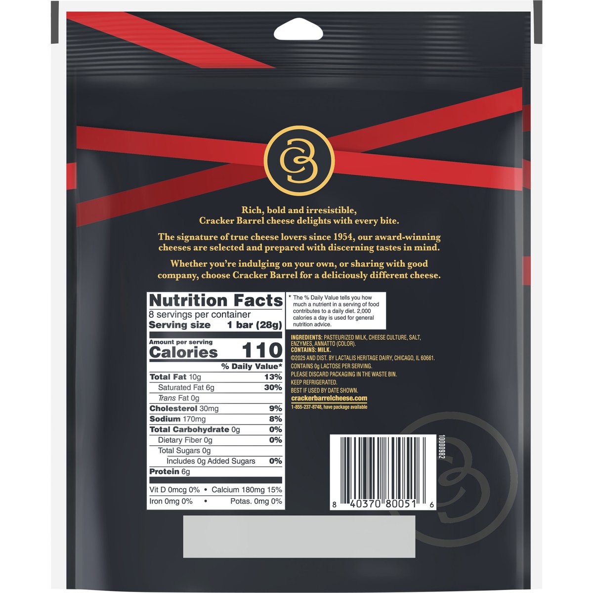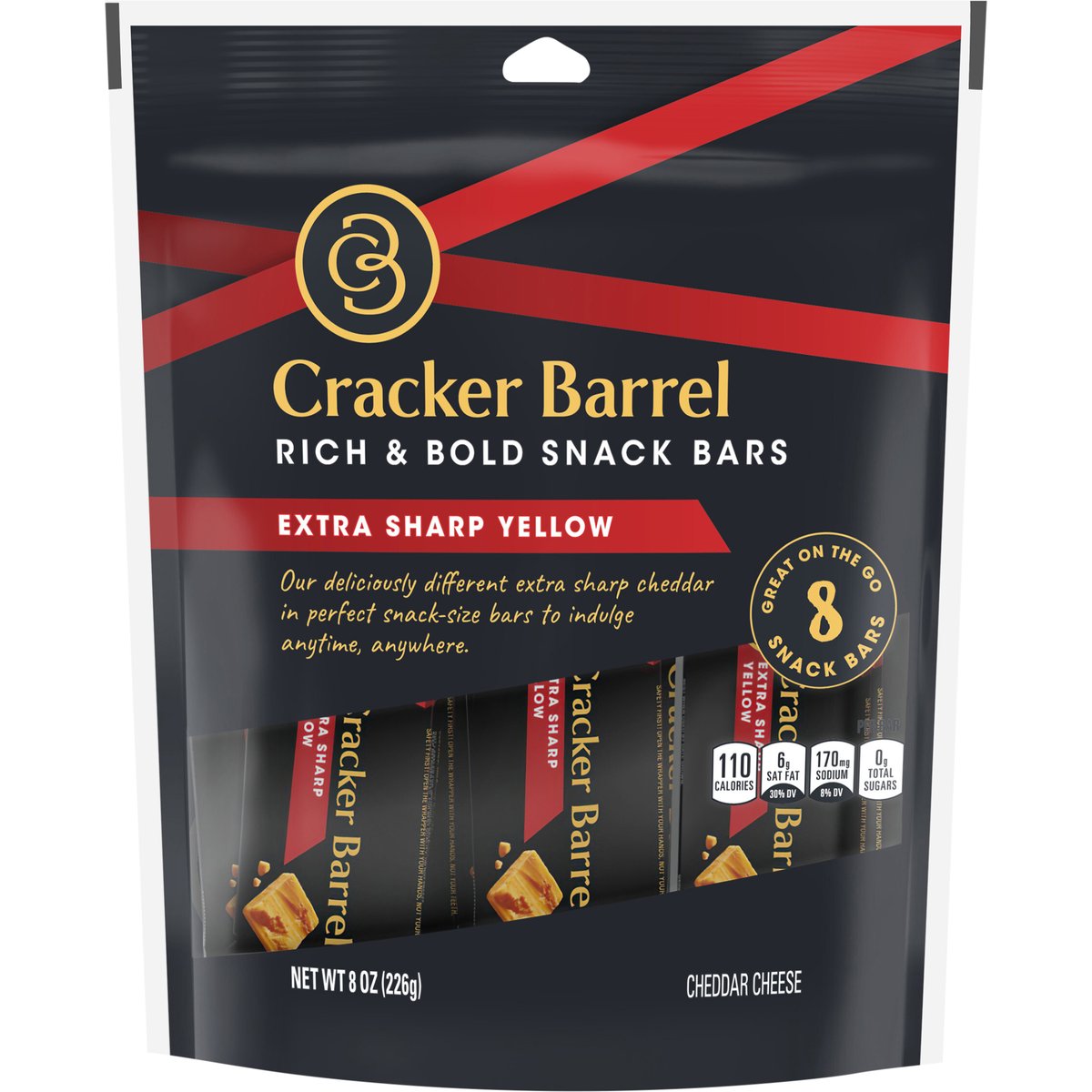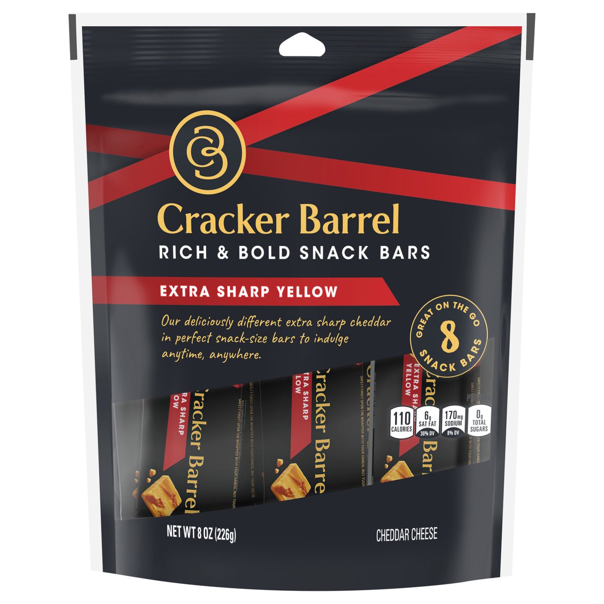 Our deliciously different extra sharp cheddar, in perfect snack-size bars to indulge anytime, anywhere. Per Bar: 110 calories; 6 g sat fat (30% DV); 170 mg sodium (8% DV); 0 g total sugars. Contains 0 g lactose per serving. Rich, bold and irresistible, Cracker Barrel cheese delights with every bite. The signature of true cheese lovers since 1954, our award-winning cheeses are selected and prepared with discerning tastes in mind. Whether you're indulging on your own, or sharing with good company, choose Cracker Barrel for a deliciously different cheese. crackerbarrelcheese.com. 1-855-237-8748, have package available. Please discard packaging in the waste bin.
