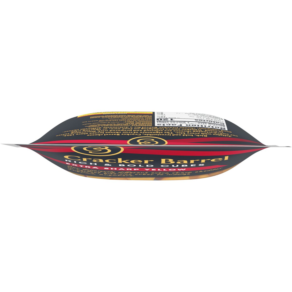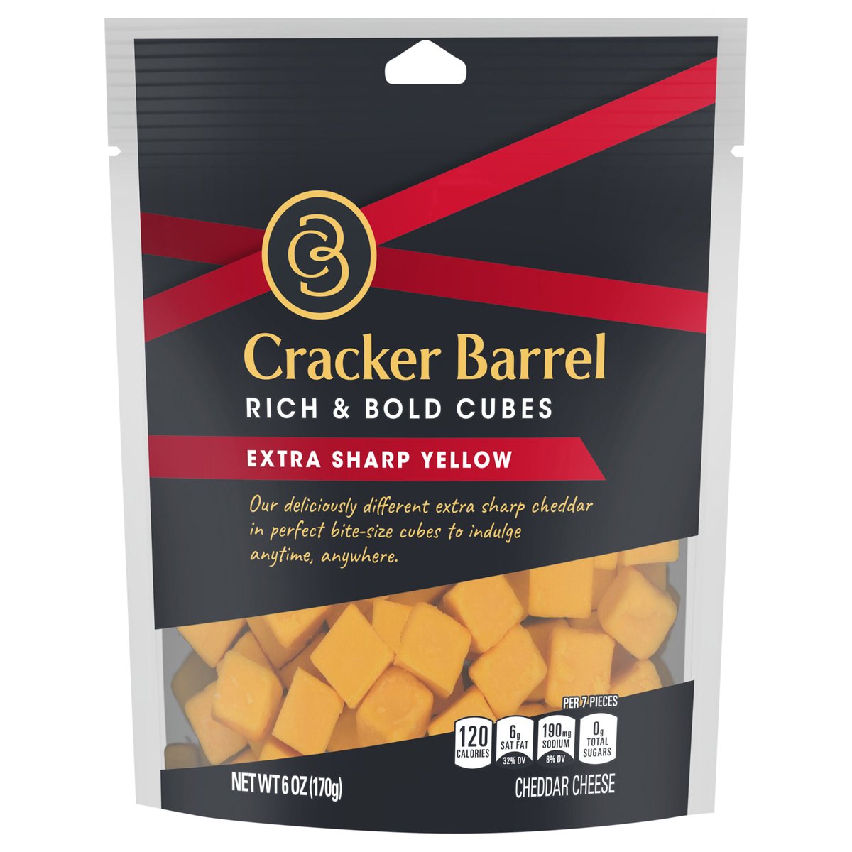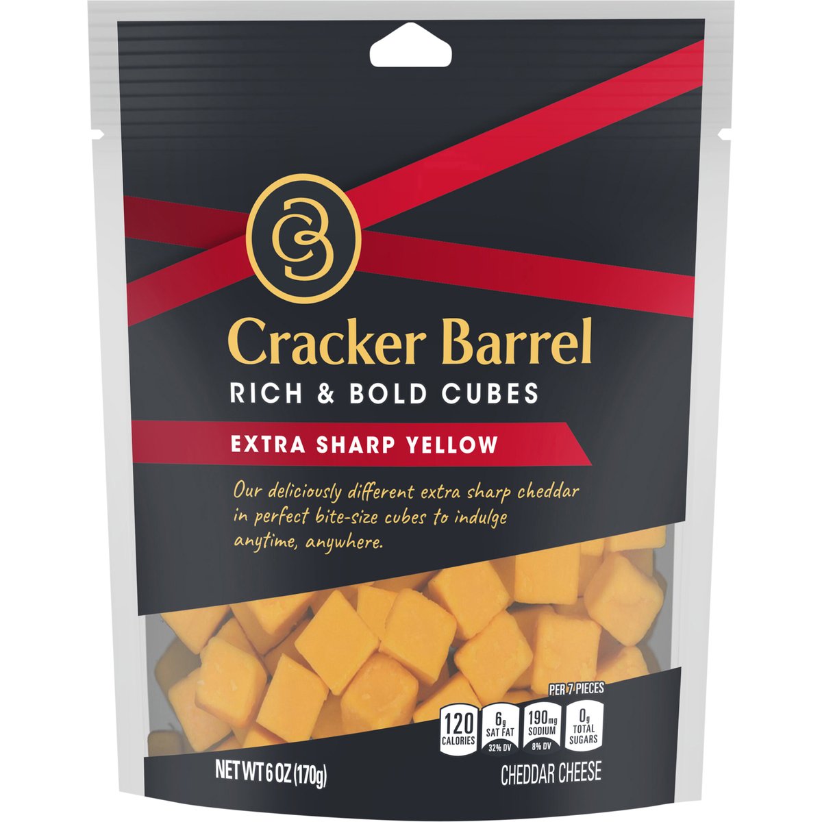 Cheddar cheese. Per 7 Pieces: 120 calories; 6 g sat fat (32% DV); 190 mg sodium (8% DV); 0 g total sugars. Contains 0 g lactose per serving. Our deliciously different extra sharp cheddar in perfect bite-size cubes to indulge anytime, anywhere. Rich, bold and irresistible, Cracker Barrel cheese delights with every bite. The signature of true cheese lovers since 1954, our award-winning cheeses are selected and prepared with discerning tastes in mind. Whether you're indulging on your own, or sharing with good company, choose Cracker Barrel for a deliciously different cheese. crackerbarrelcheese.com. 1-855-237-8748, have package available. Please discard packaging in the waste bin.