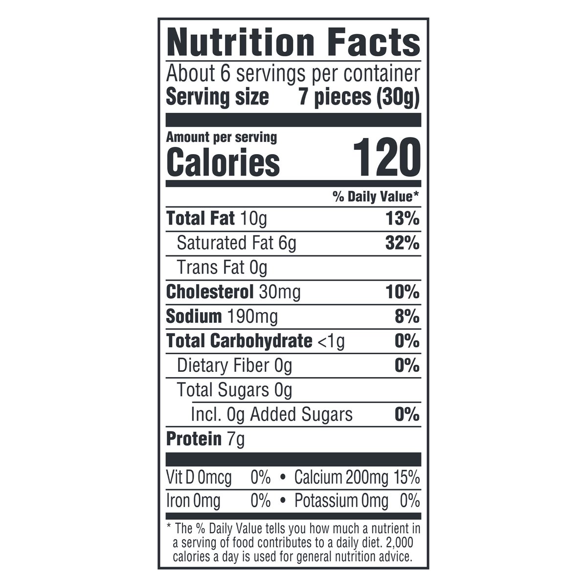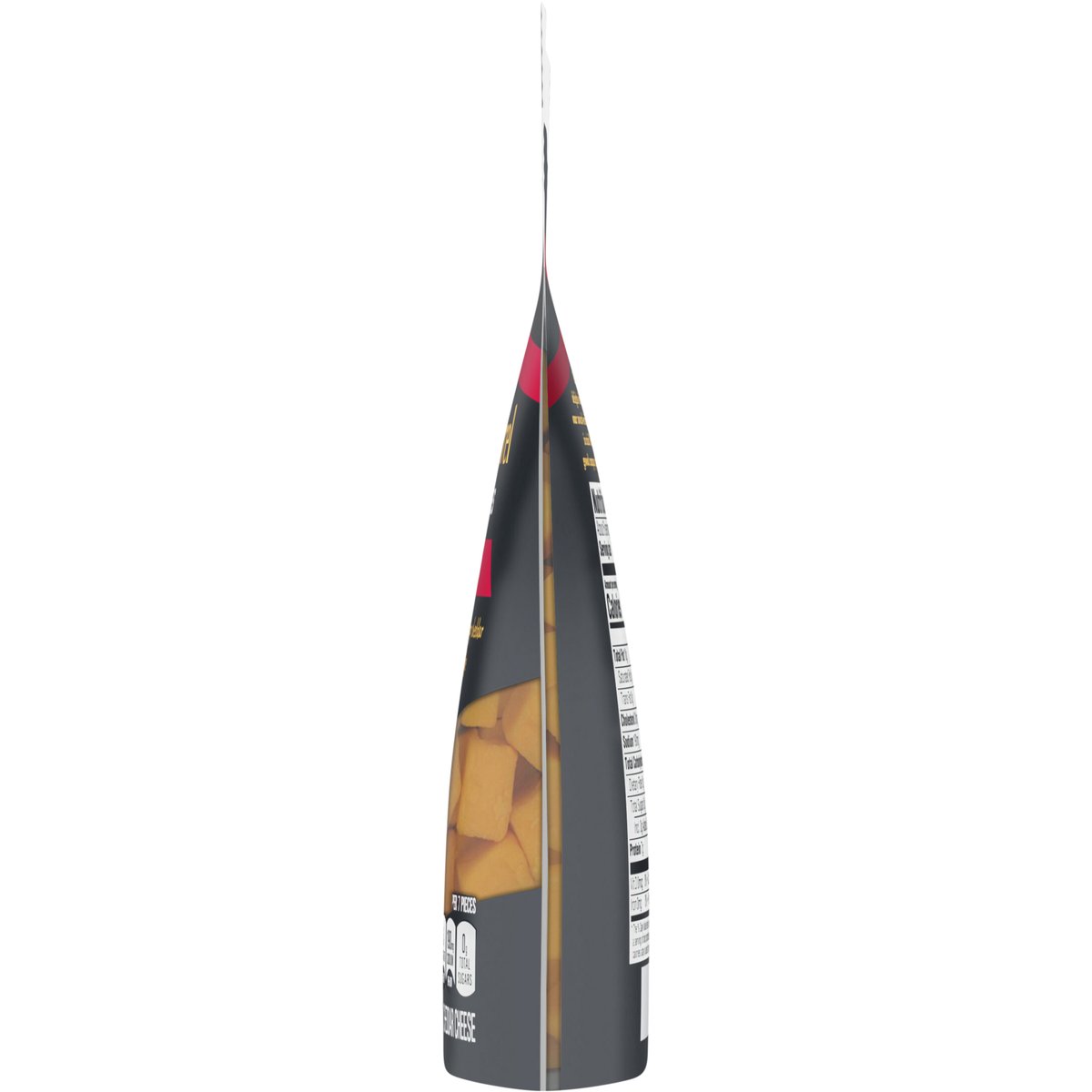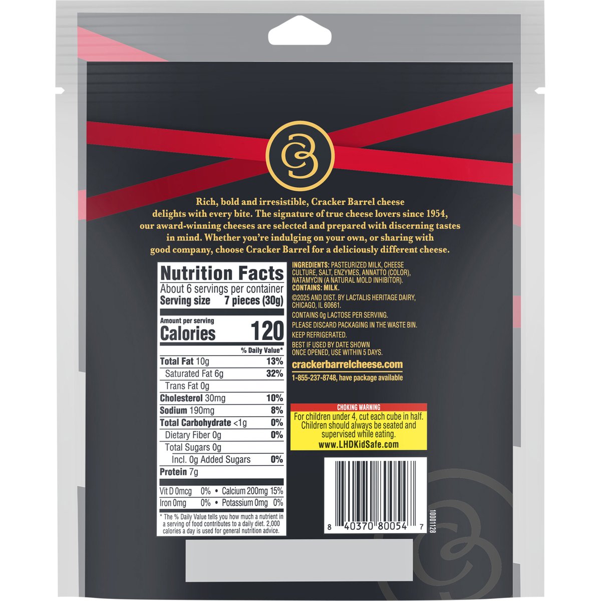 Cheddar cheese. Per 7 Pieces: 120 calories; 6 g sat fat (32% DV); 190 mg sodium (8% DV); 0 g total sugars. Contains 0 g lactose per serving. Our deliciously different extra sharp cheddar in perfect bite-size cubes to indulge anytime, anywhere. Rich, bold and irresistible, Cracker Barrel cheese delights with every bite. The signature of true cheese lovers since 1954, our award-winning cheeses are selected and prepared with discerning tastes in mind. Whether you're indulging on your own, or sharing with good company, choose Cracker Barrel for a deliciously different cheese. crackerbarrelcheese.com. 1-855-237-8748, have package available. Please discard packaging in the waste bin.