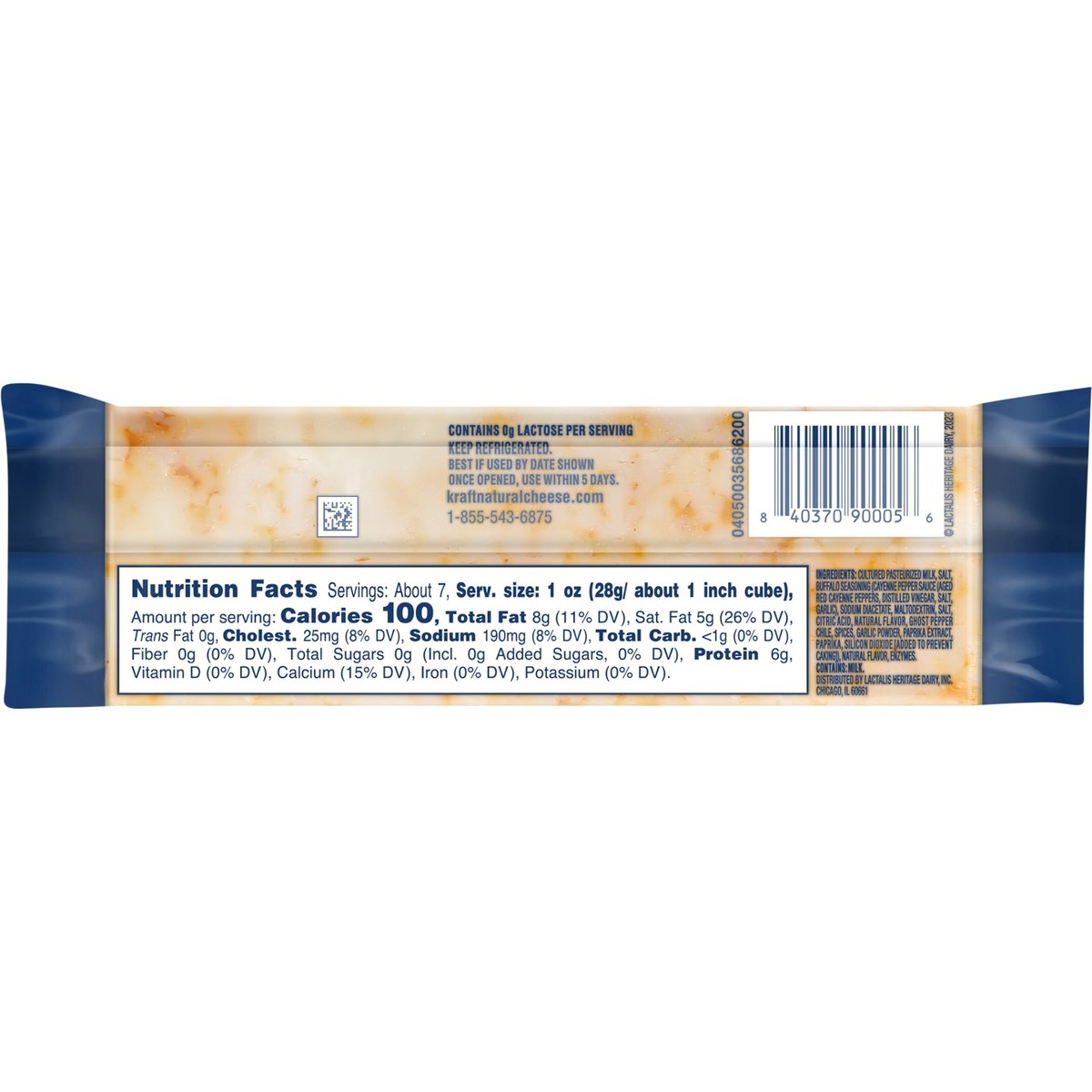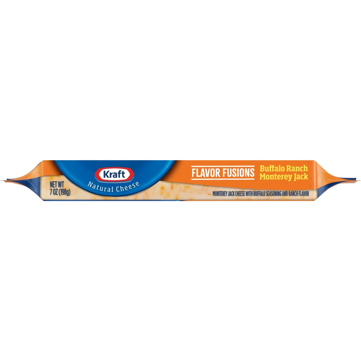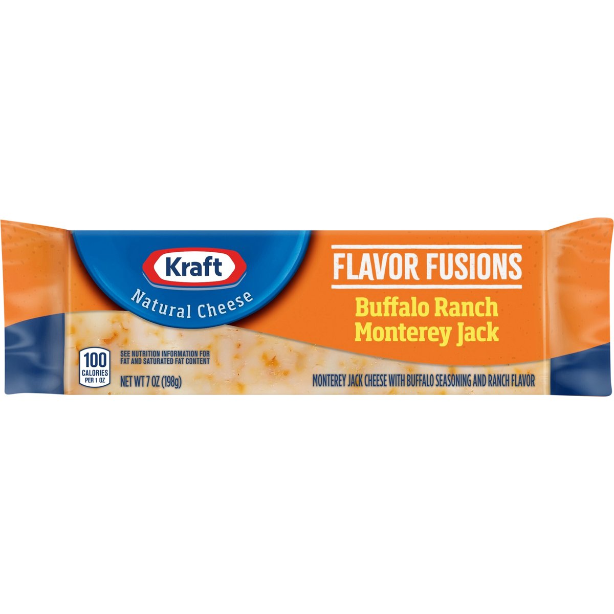Monterey jack cheese with buffalo seasoning and ranch flavor. 100 calories per 1 oz. Contains 0 g lactose per serving. See nutrition information for fat and saturated fat content. Flavor fusions. kraftnaturalcheese.com. 1-855-543-6875.