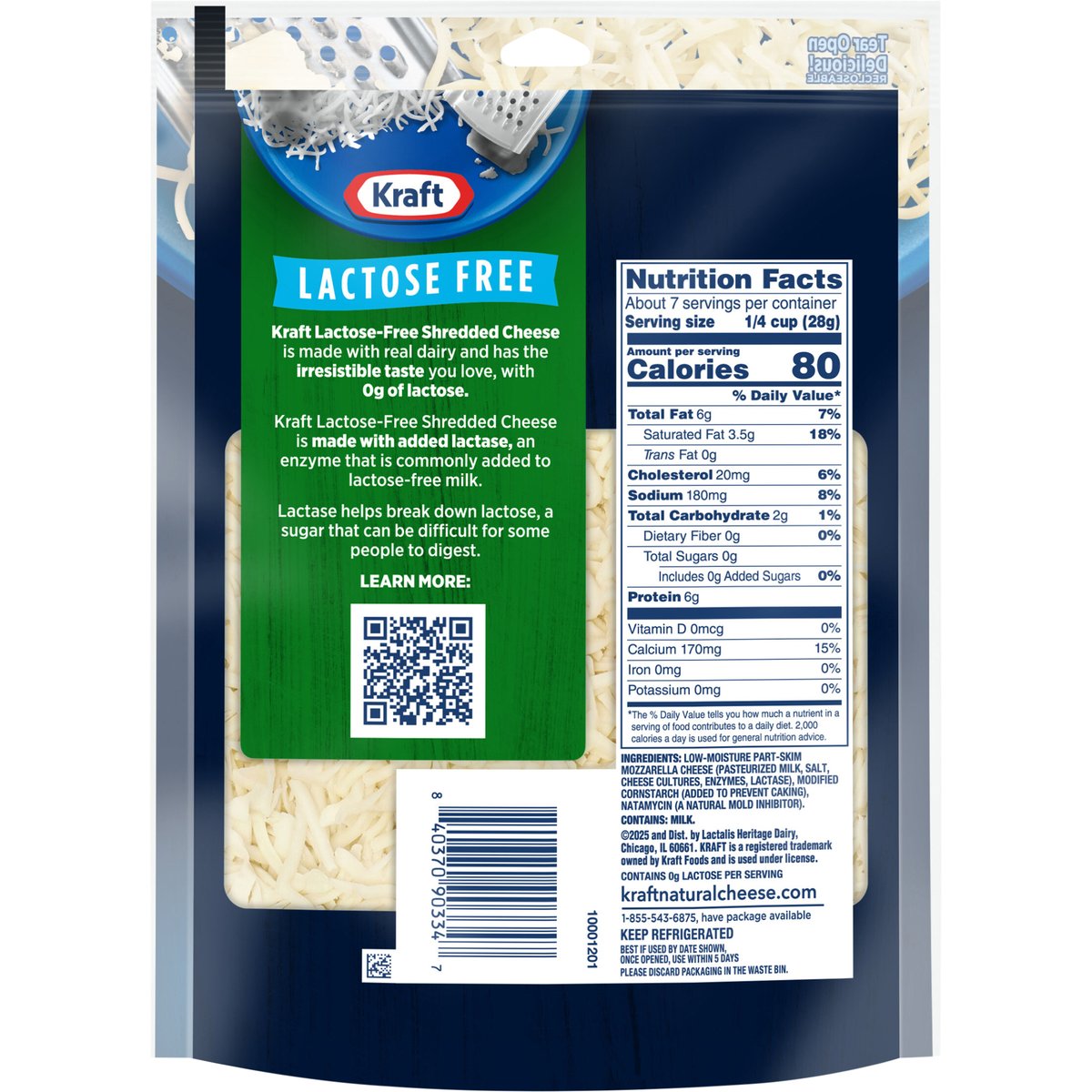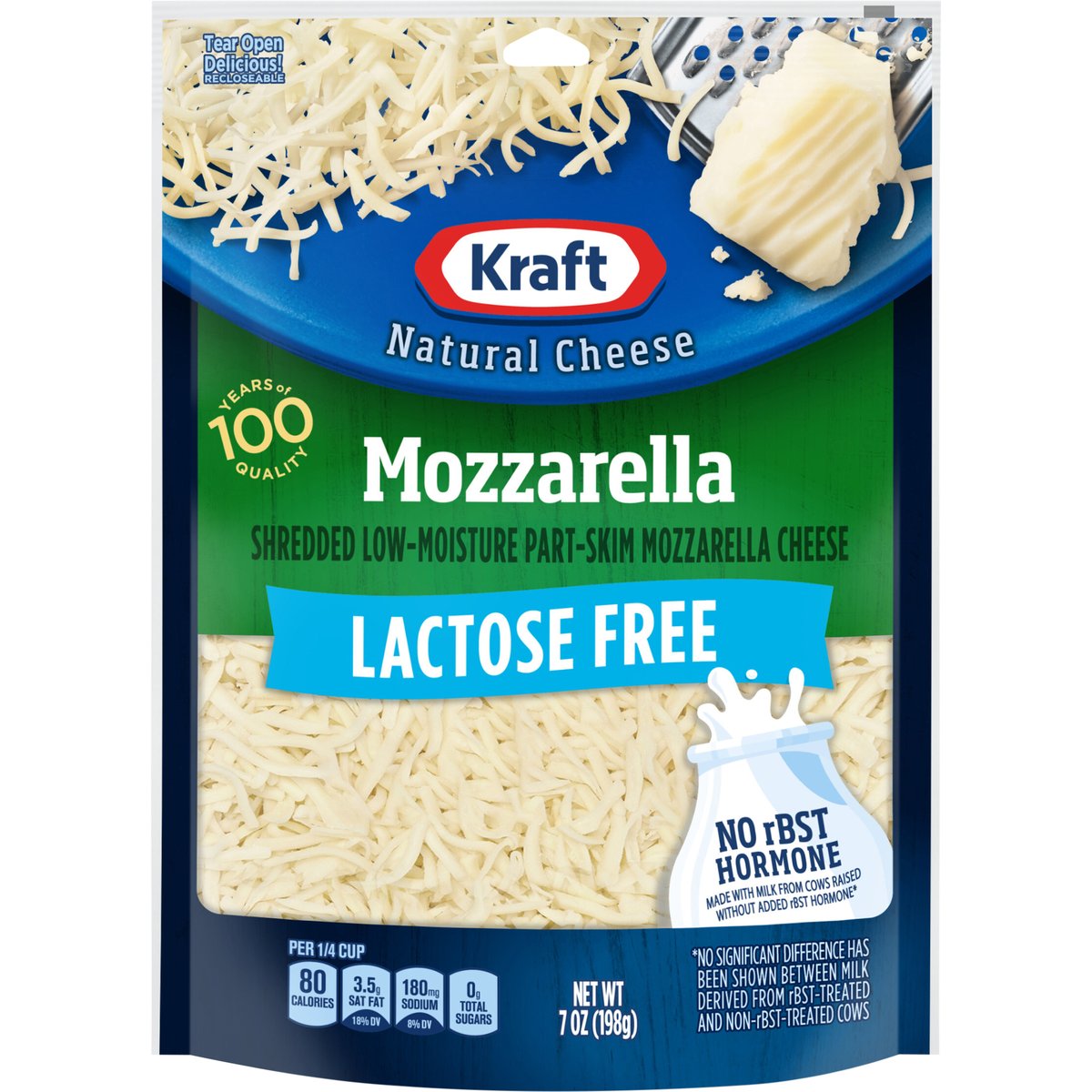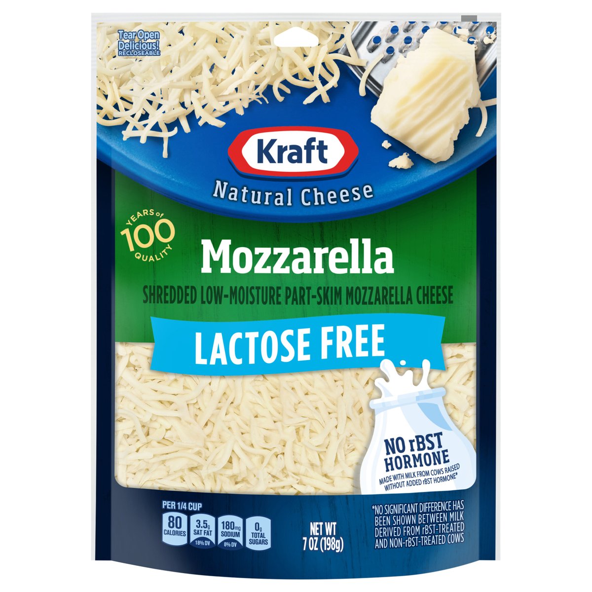 Shredded low-moisture part-skim mozzarella cheese. Per 1/4 Cup: 80 calories; 3.5 g sat fat (18% DV); 180 mg sodium (8% DV); 0 g total sugars. Lactose free. Contains 0 g lactose per serving. 100 years of quality. No rBST hormone. Made with milk from cows raised without added rBST hormone*. Kraft Lactose-Free Shredded Cheese is made with real dairy and has the irresistible taste you love, with 0 g of lactose. Kraft Lactose-Free Shredded Cheese is made with added lactase, an enzyme that is commonly added to lactose-free milk. Lactase helps break down lactose, a sugar that can be difficult for some people to digest. * No significant difference has been shown between milk derived from rBST-treated and non-rBST-treated cows. kraftnaturalcheese.com. Learn more. 1-855-543-6875, have package available. Reclosable. Please discard packaging in the waste bin.